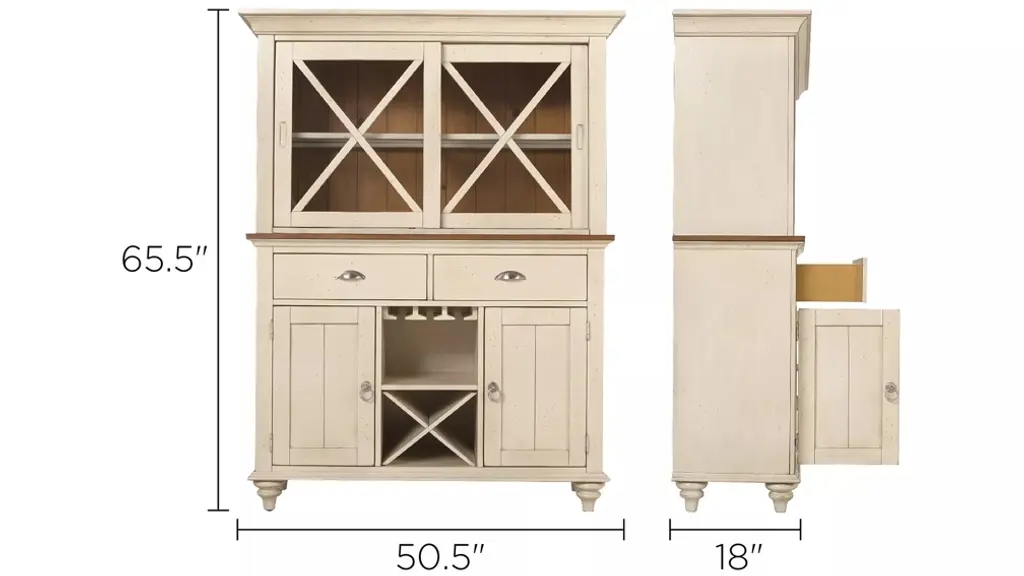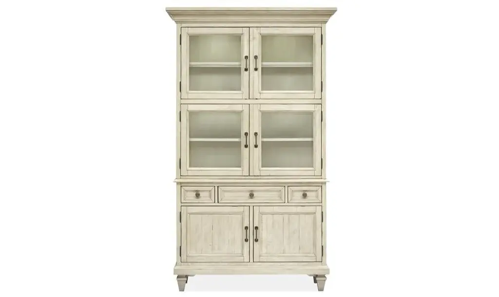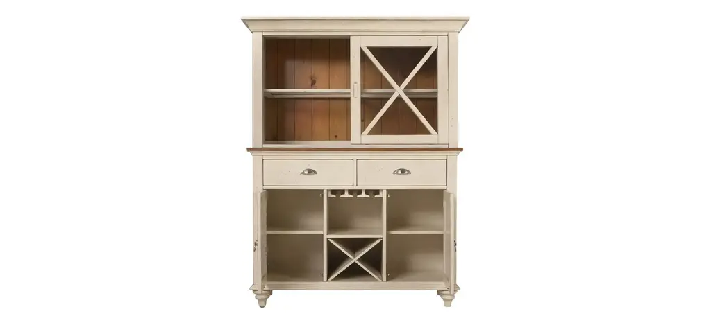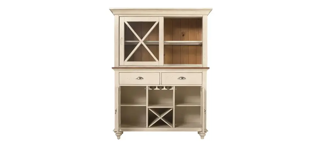 If you love the look of timeworn furniture, you're sure to appreciate this Sagamore 2-pc. china cabinet with lighting and wine storage. Its distressed bisque finish and distressed natural pine-finished hutch back infuse the piece with casual beauty. Plus, there's plenty of room for storage and display. In addition to enclosed storage, the buffet offers dedicated space for wineglasses and bottles, while the lighted hutch lets you put the spotlight on your prized china.