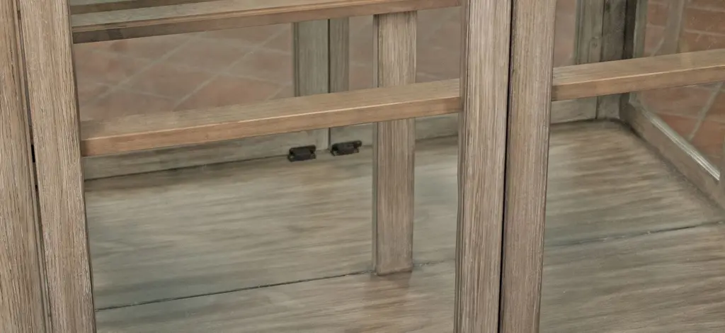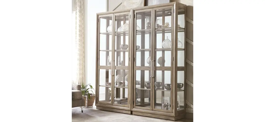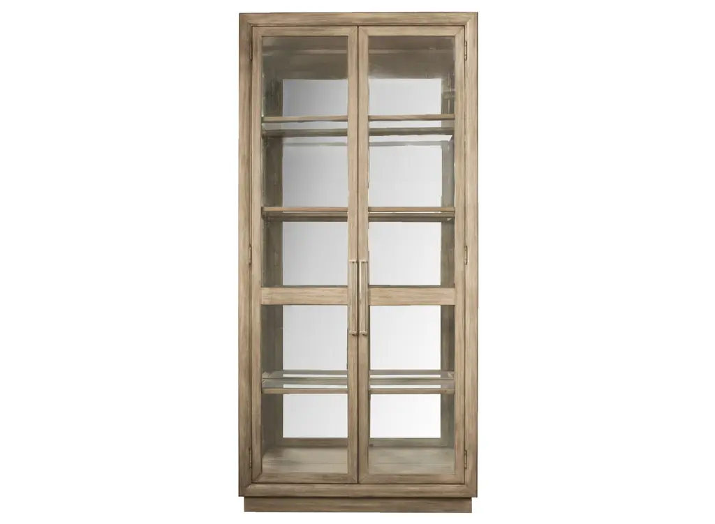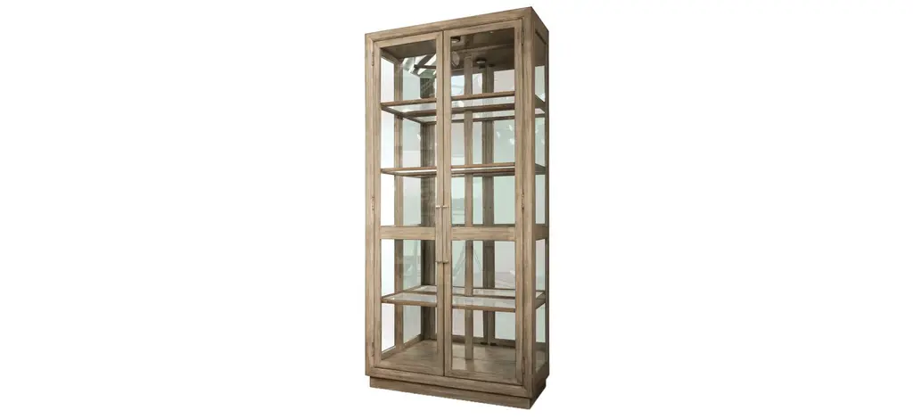Torrin china cabinet is organic and contemporary with a touch of glamour. Clean lines and soft rounded corners give this cabinet a light and airy feel while the metallic accents add the perfect finishing touch. Constructed of wire-brushed oak veneers in a natural finish.