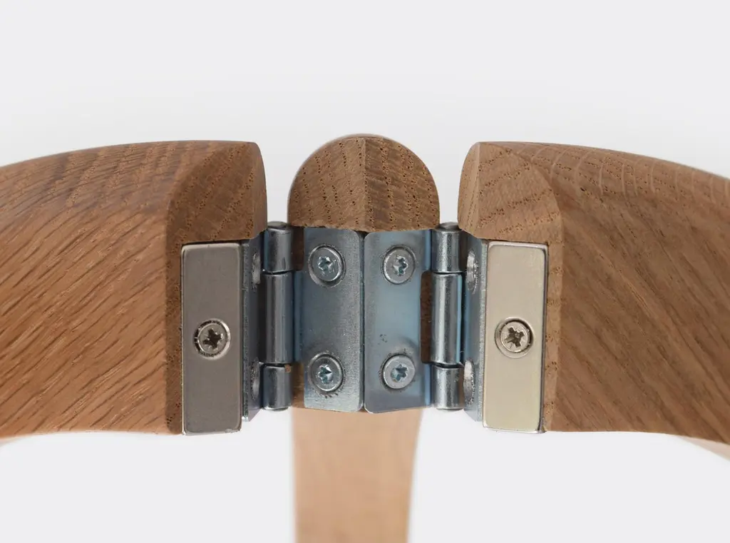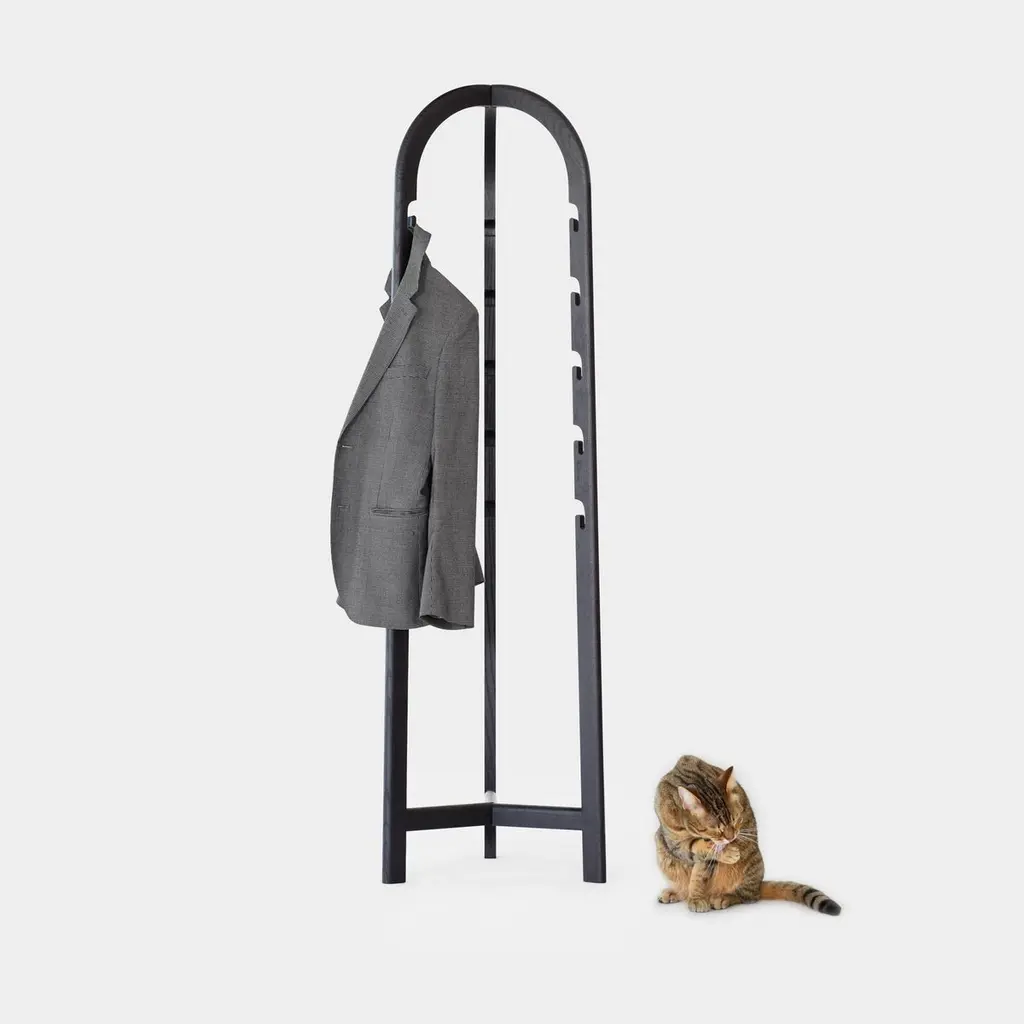 Scandinavian contemporary foldable coat hanger / clothes hanger made with precision craftsmanship and quality in material and design, materialised in ash wood, oak wood or blackened Ash. Foldable to be easily stored when not needed, clothes and bags are hanged on the inside of the stand which makes it more stable than the usual clothes hanger.In the big city regions people tend to live in smaller spaces. Restaurants and bars get more crowded and we all need a flexible surrounding adapted to the needs we meet at the moment. The foldable clothes hanger Major can ease one mundane problem by giving the opportunity to take care of one's clothes when needed and to be efficiently stored when not needed. For the hallway, the bedroom, at the restaurant among the tables, at the bar or in the lobby. The name Major has it's heritage in the Swedish name for coat hanger, tambour major, which used to be the playful name of the coat servant at restaurants back in the days.