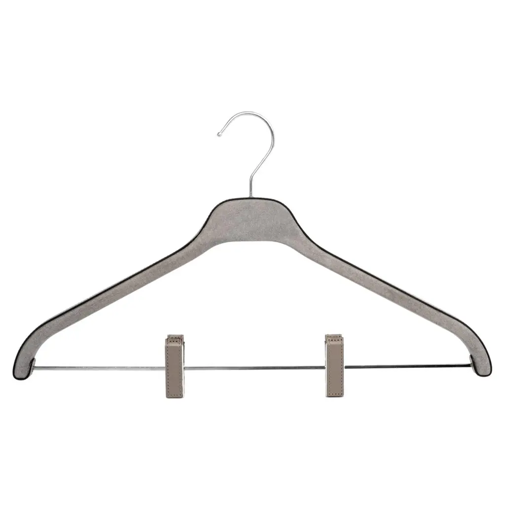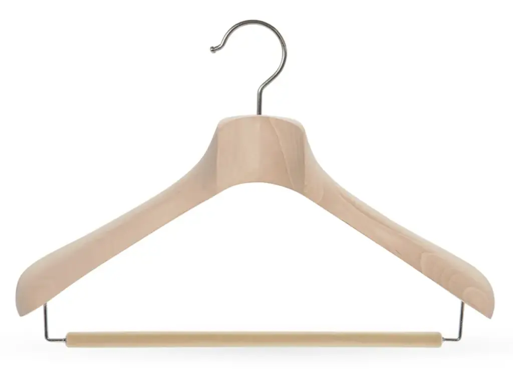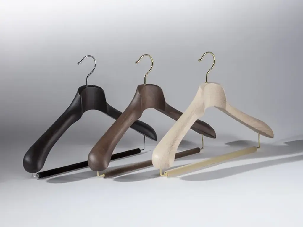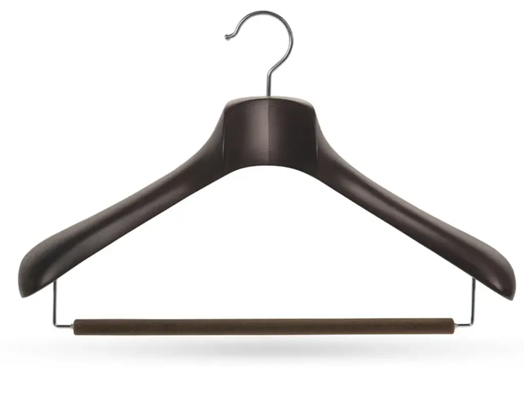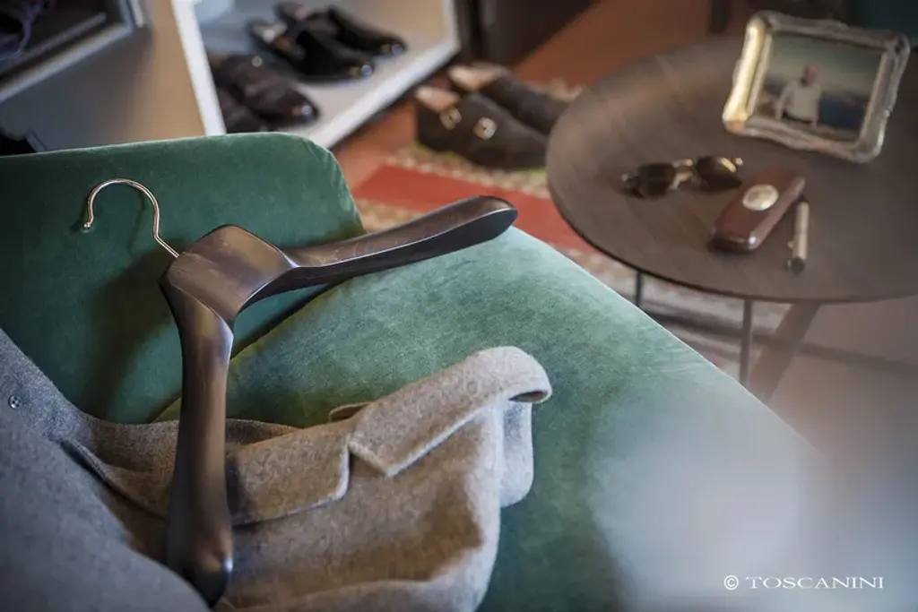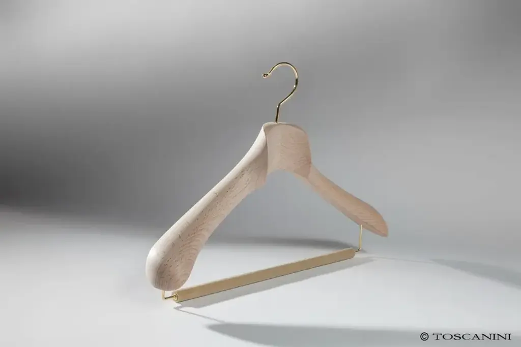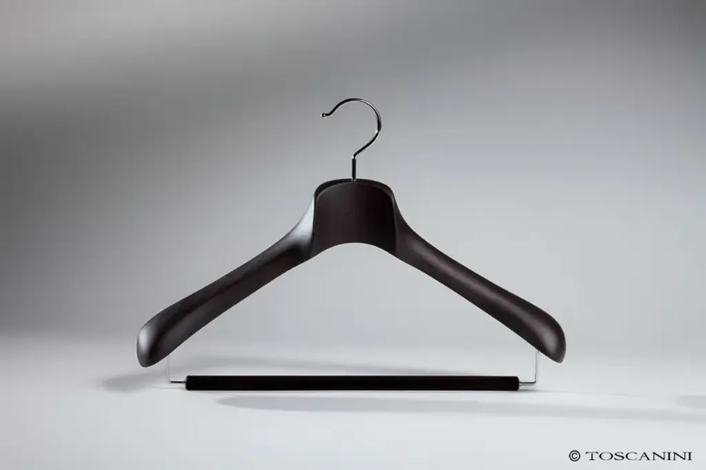 Guglielmo is the ideal men's hanger for coats and suits from Toscanini best-selling line of clothes hanger, SuMisura. Available in size 45 x 7 cm in natural Waxed finish, Canaletto walnut or Wenge with gold or silver metal parts and trouser bar in non-slip velvet. 6 pcs.The SuMisura collection in beech wood is the best-selling line of hangers by Toscanini. Available in natural waxed finish, Canaletto walnut or Wenge with silver or gold metal parts; it's composed by 6 men's and 7 women's models which can be equipped with antislip bars, clips, velvet flocked shoulders and shoulder strap clips. It represents the best offer in terms of Bespoke for the wardrobe of private luxury residences: with a jacket hanger, Marcello Giacca, available in 7 different sizes, from 38 cm to 51 cm. All clothes hangers of the SuMisura line can be personalized with laser engraved initials.