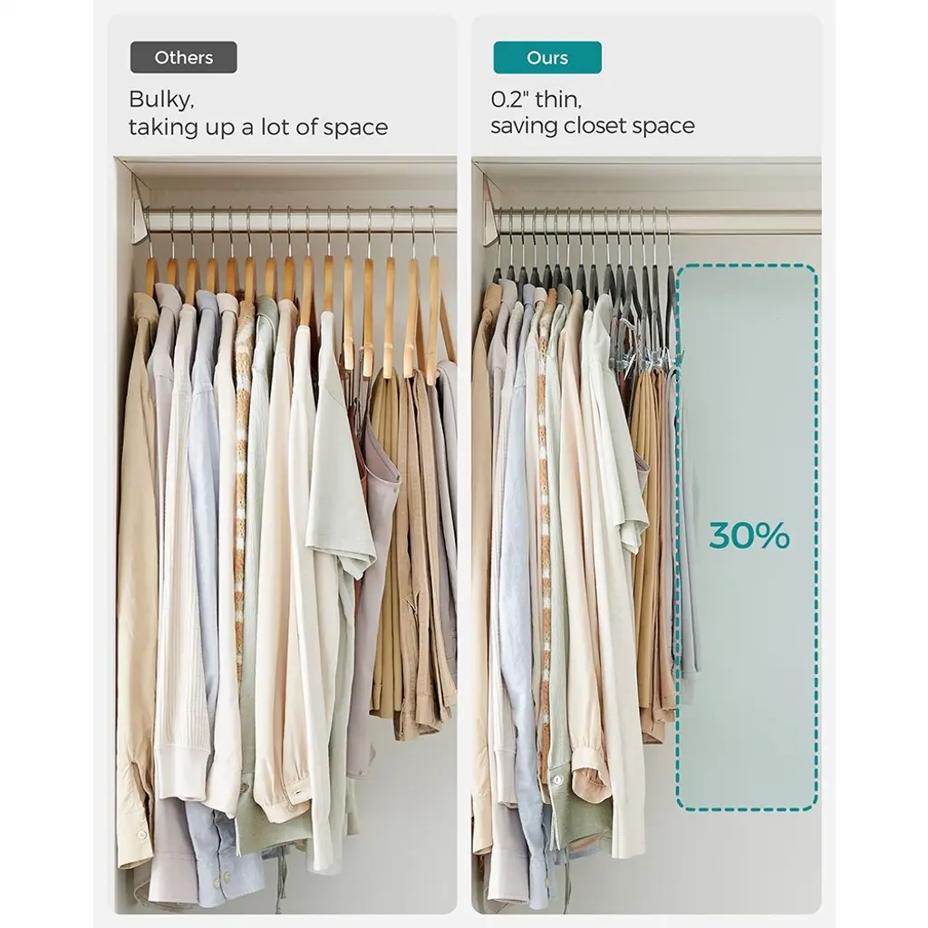 Specifications:Description:This set of premium velvet hangers, available in beige, white, grey, and black, comes in convenient packs of 20 or 50 to suit your wardrobe needs. Each hanger measures 16.7 inches wide by 9.3 inches high and supports up to 5.5 pounds, providing sturdy yet gentle care for your garments. Made with ABS plastic, nylon velvet, and metal, these hangers feature adjustable clips with protective PVC ends, ideal for securing trousers and skirts of various sizes without leaving marks. The velvet-coated surface offers superior anti-slip protection, while the shoulder grooves keep tank tops and delicate items in place. Designed with a slim 0.2-inch profile, these space-saving hangers maximize closet capacity, allowing you to efficiently organize blouses and pants on a single hanger and keep your wardrobe neat and accessible. Each pack includes 20 or 50 hangers tailored to enhance your clothing care and closet organization.Key Features: