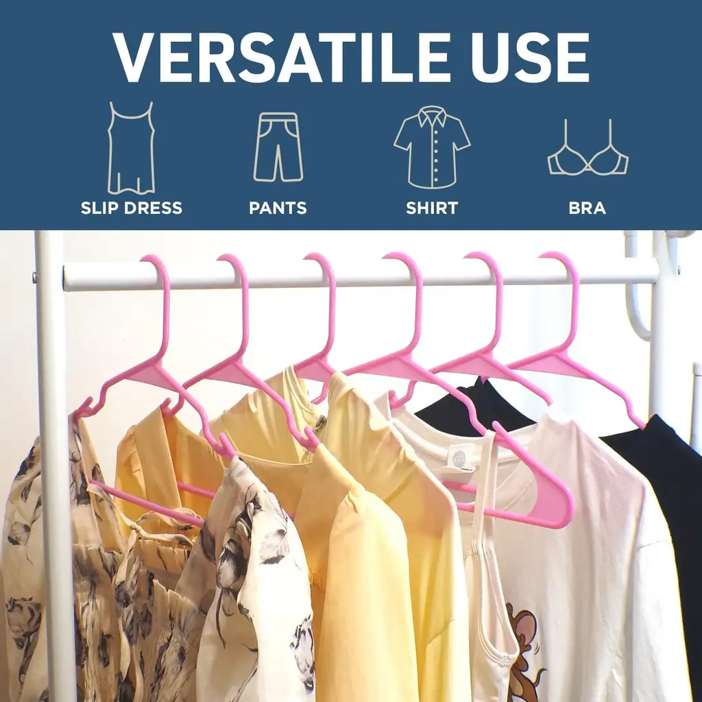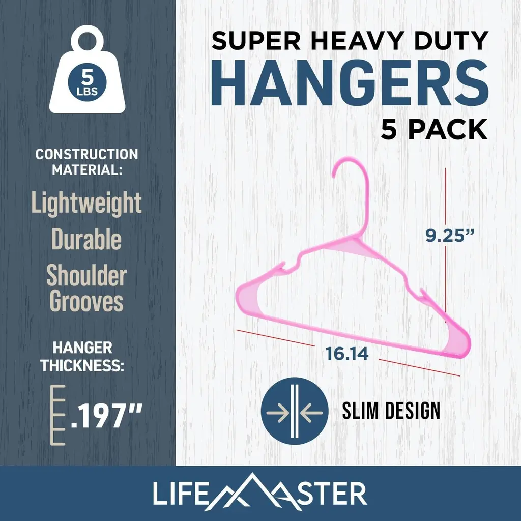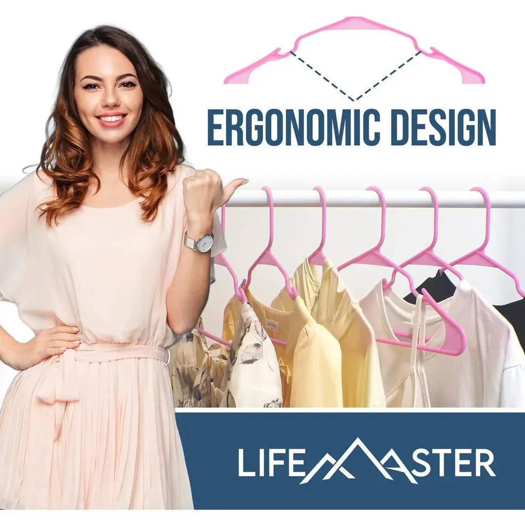 Upgrade your wardrobe with Lifemaster Plastic Clothes Hangers—a perfect blend of style, durability, and functionality for your wardrobe. Crafted with lightweight yet reinforced plastic material, these hangers are designed to securely support everything from delicate dresses to heavy coats. With a slim and sleek design to maximize closet space, enjoy your wardrobe's tidy look as you say goodbye to the clutter of mismatched hangers. The hangers feature smart shoulder notches that ensure even items with thin straps stay in place, providing a versatile solution for hanging dresses, bras, and skirts. The high-quality pink color finish not only adds an elegant touch but also helps maintain the shape of your clothes, preventing wrinkles and keeping them looking fresh. Available in a convenient, these hangers are ideal for upgrading your closet space. Measuring 16.4’’ x 0.197’’ x 9.25’’, they offer the perfect size for a variety of garments, making them an essential addition to any wardrobe. Keep your clothes organized and in top condition with Lifemaster Plastic Clothes Hangers.