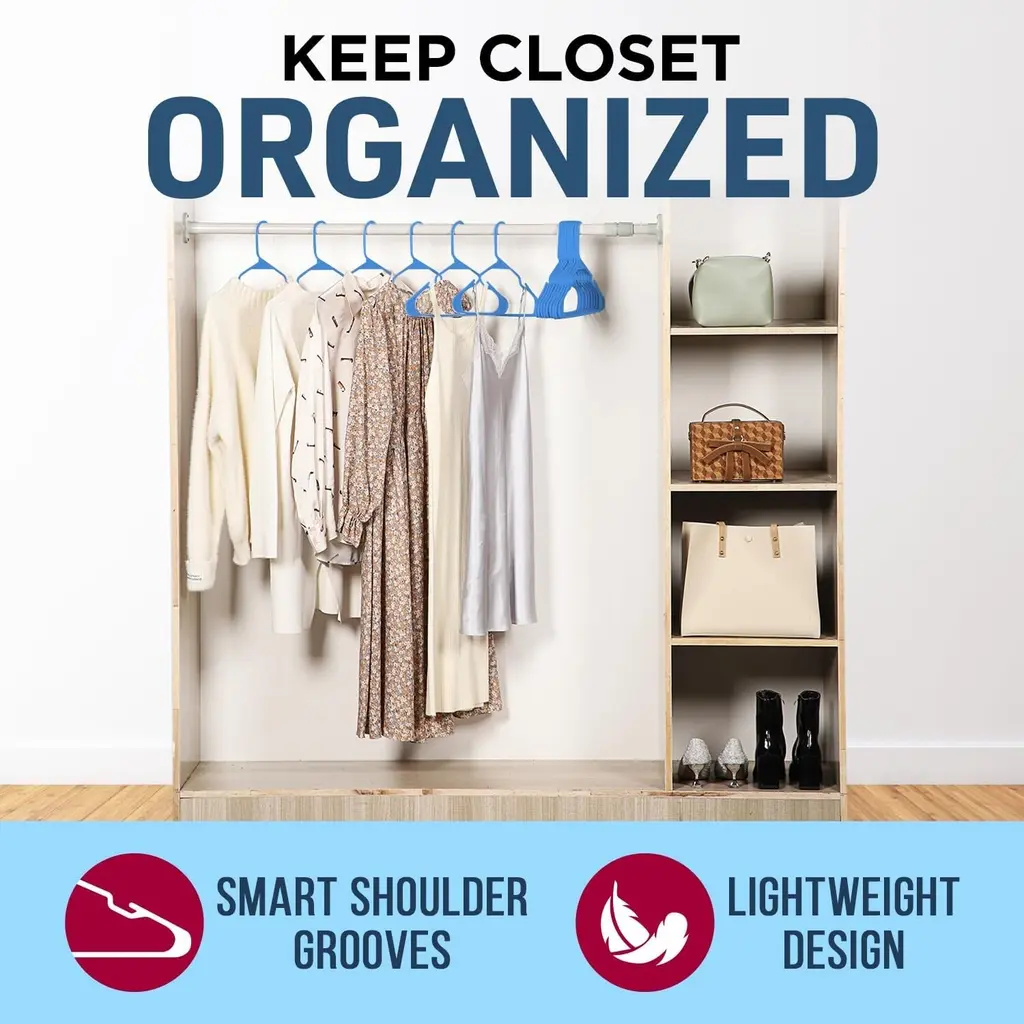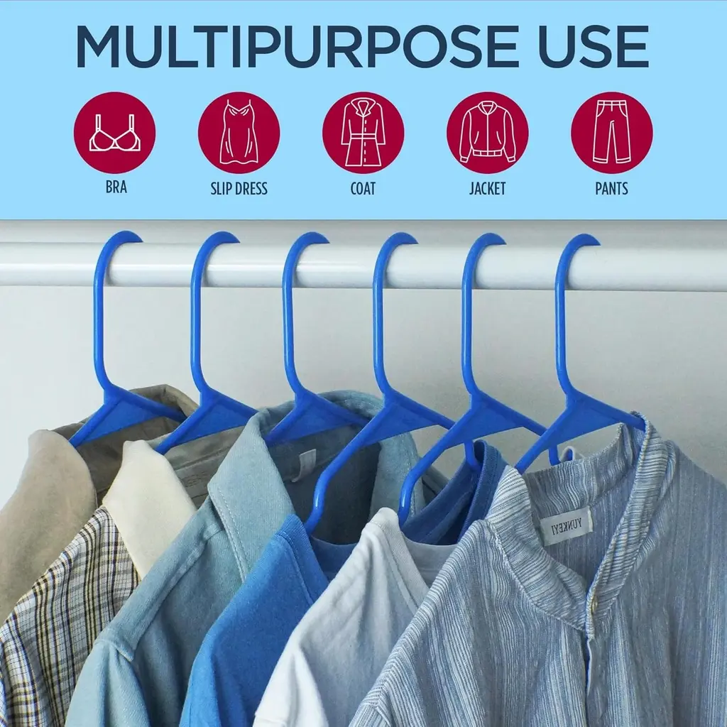 Upgrade your wardrobe with Lifemaster Plastic Clothes Hangers—a perfect blend of style, durability, and functionality for your wardrobe. Crafted with lightweight yet reinforced plastic material, these hangers are designed to securely support everything from delicate dresses to heavy coats. With a slim and sleek design to maximize closet space, enjoy your wardrobe's tidy look as you say goodbye to the clutter of mismatched hangers.The hangers feature smart shoulder notches that ensure even items with thin straps stay in place, providing a versatile solution for hanging dresses, bras, and skirts. The high-quality blue color finish not only adds an elegant touch but also helps maintain the shape of your clothes, preventing wrinkles and keeping them looking fresh. Available in a convenient, these hangers are ideal for upgrading your closet space. Measuring 16.4’’ x 0.197’’ x 9.25’’, they offer the perfect size for a variety of garments, making them an essential addition to any wardrobe. Keep your clothes organized and in top condition with Lifemaster Plastic Clothes Hangers.