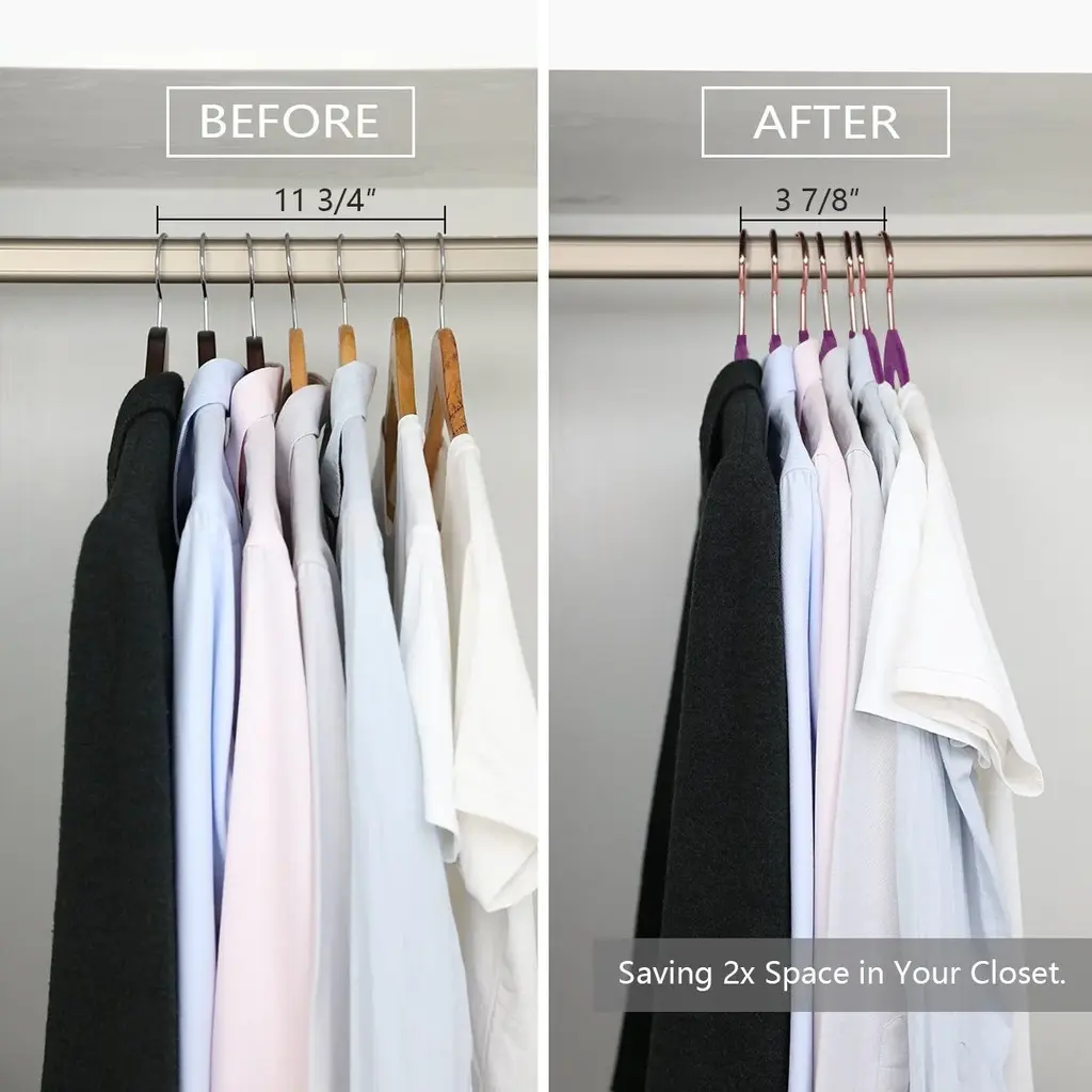 These space-saving cascade hangers are slim and durable, maximizing the storage space in your closet. They are sturdy and lightweight velvet hangers, perfect for commercial and home use. The non-slip velvet hangers are designed to prevent slipping of your garments. They are great for holding your pants, shirts, dresses, and accessories. 360° Swivel hook makes it easy to organize your clothes. Features:Advantages:Specifications:Standard Size: (LxWxH) 17.7" x 0.2" x 9.3"Colors Available:PurpleSet Options: 30 Pack/ 50 Pack/ 60 Pack / 100 Pack