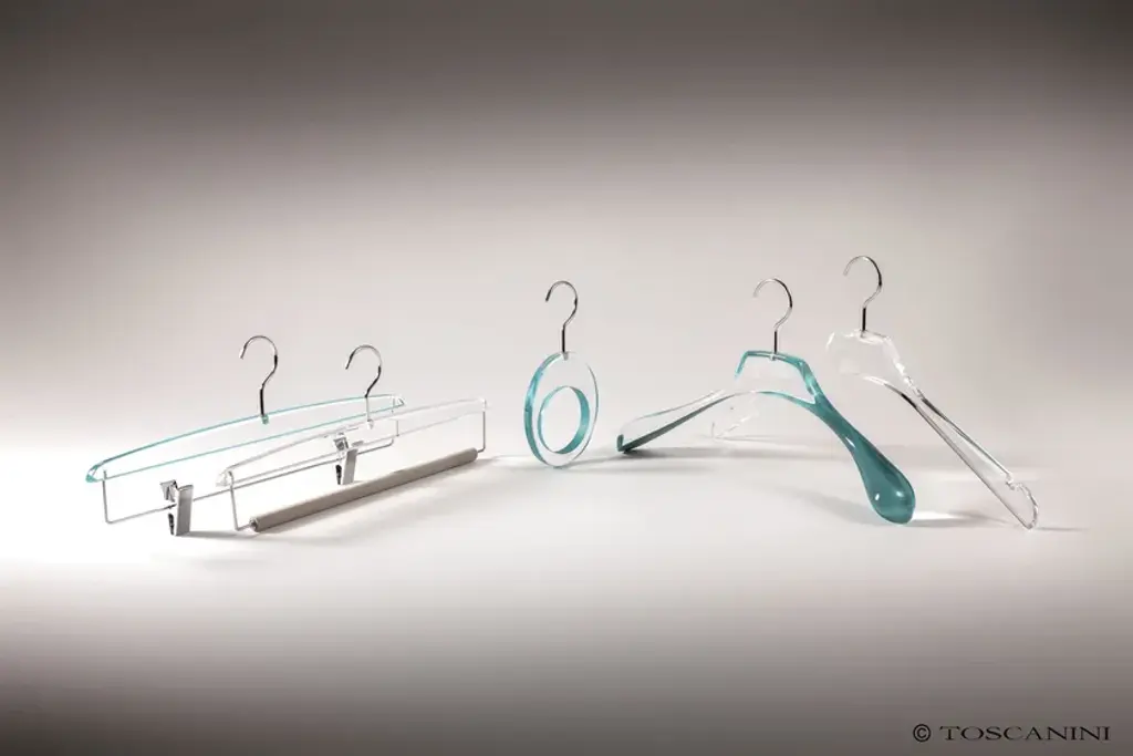 Stella Camicia is the hanger for shirts and light garments of the luxurious transparent plexiglass collection by Toscanini. Available in size 43 x 1.5 cm, with chrome metal details and shoulder strap cut. It can be personalized with laser-engraved initials.8 pcs.You will be enchanted by the magic of the Stella collection. The transparent plexiglass hangers have a glamorous touch that embellishes the most luxurious walk-in closets with elegant plays of light and transparencies. On request they can be customized with colors of your choice to perfectly match your wardrobe. All hangers in this collection can be customized with laser-engraved initials.