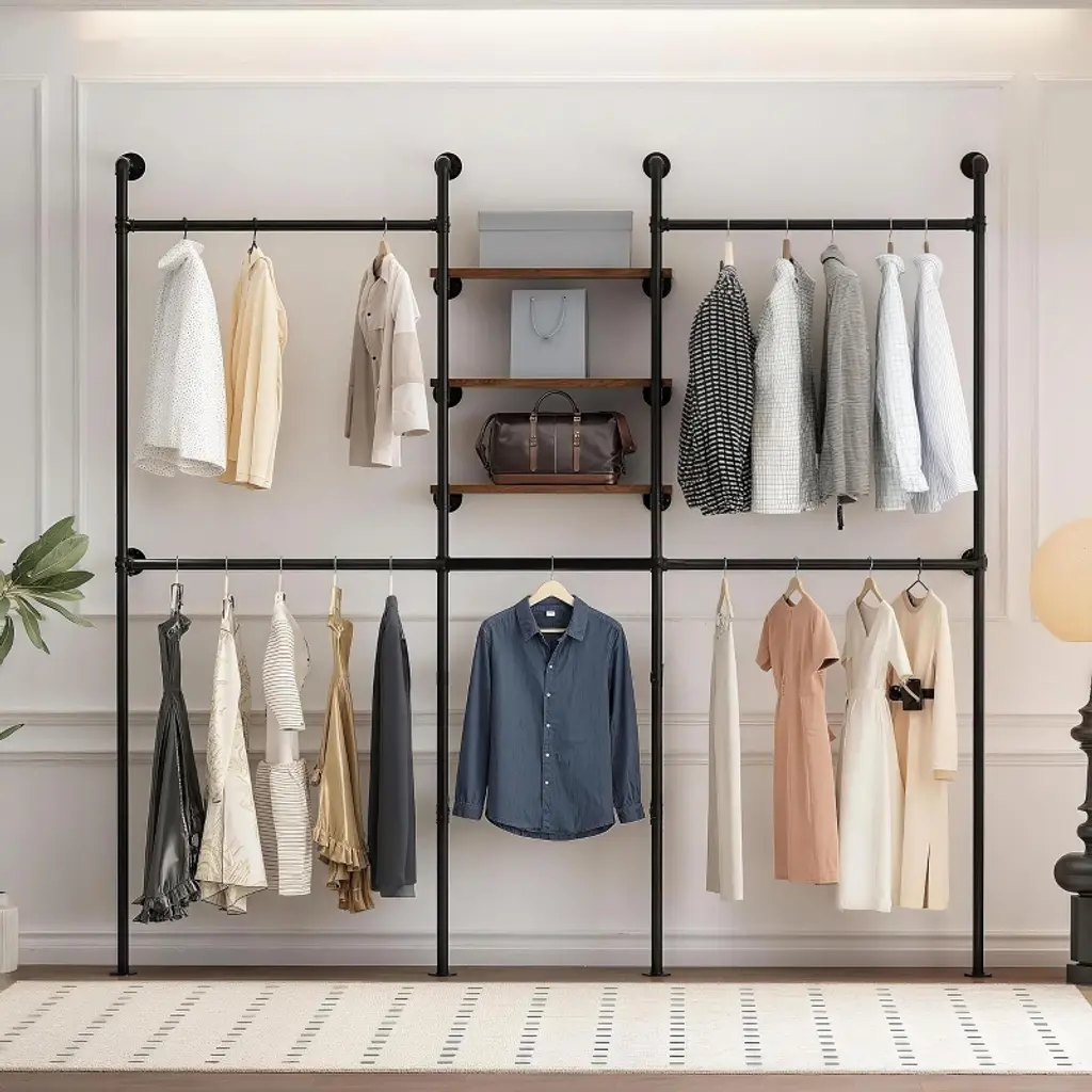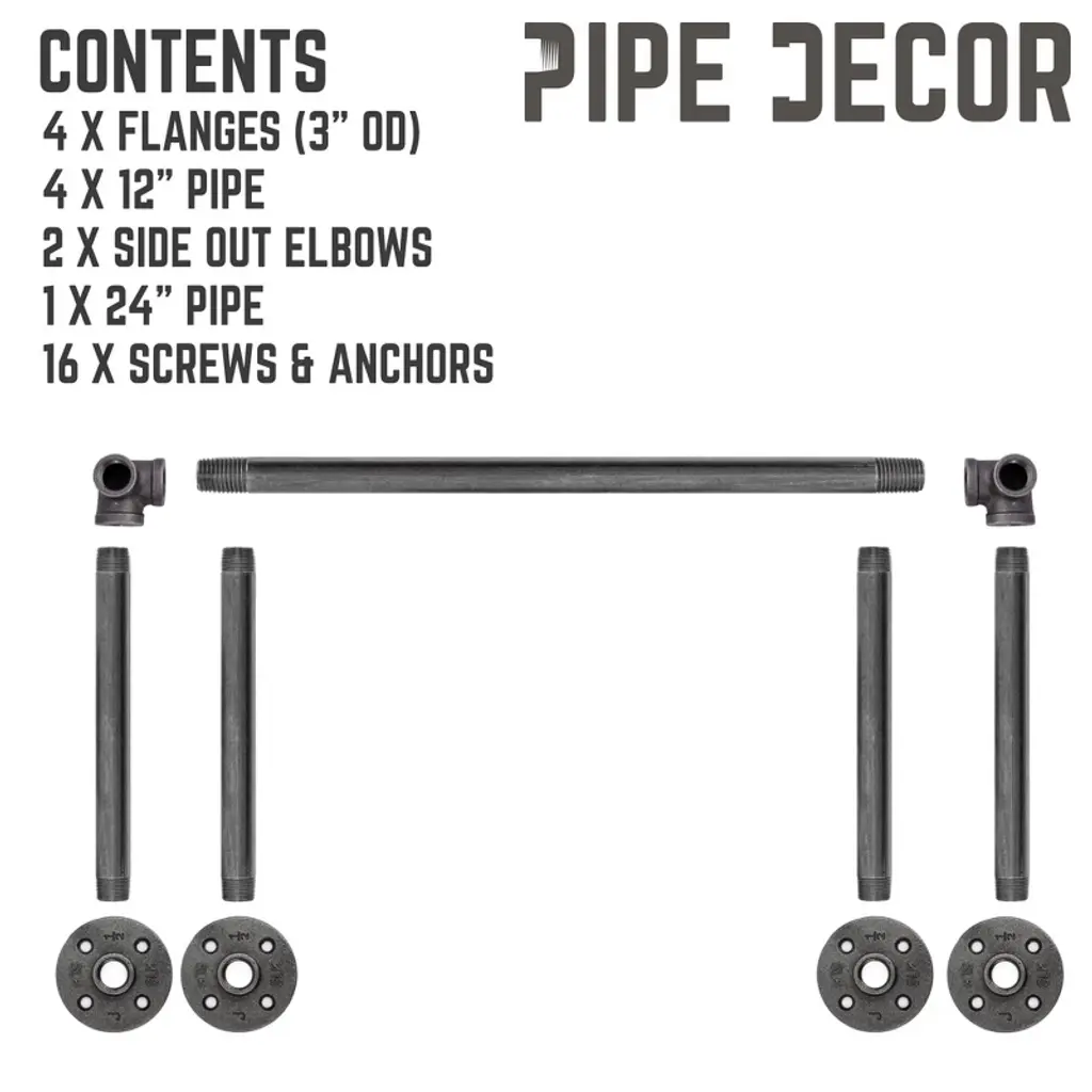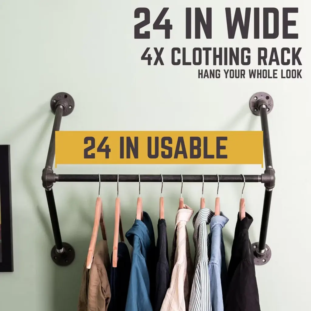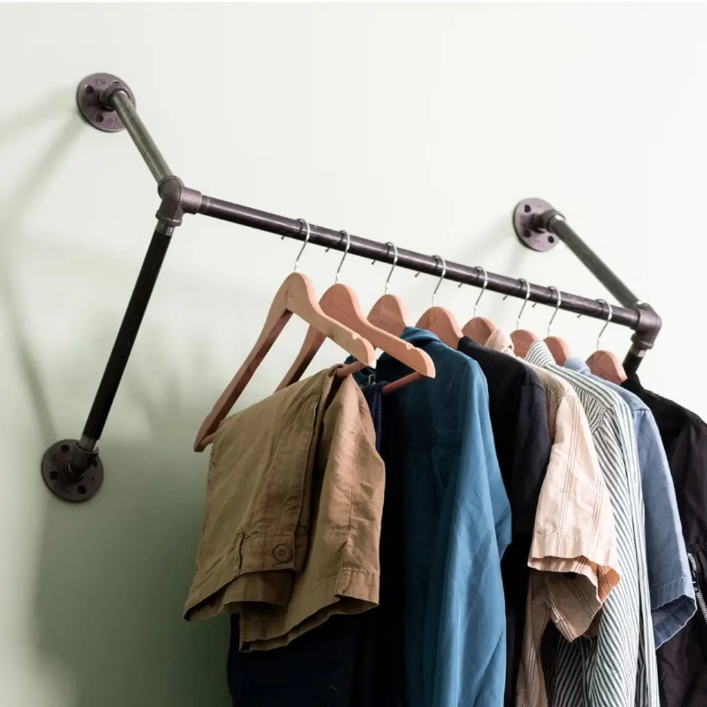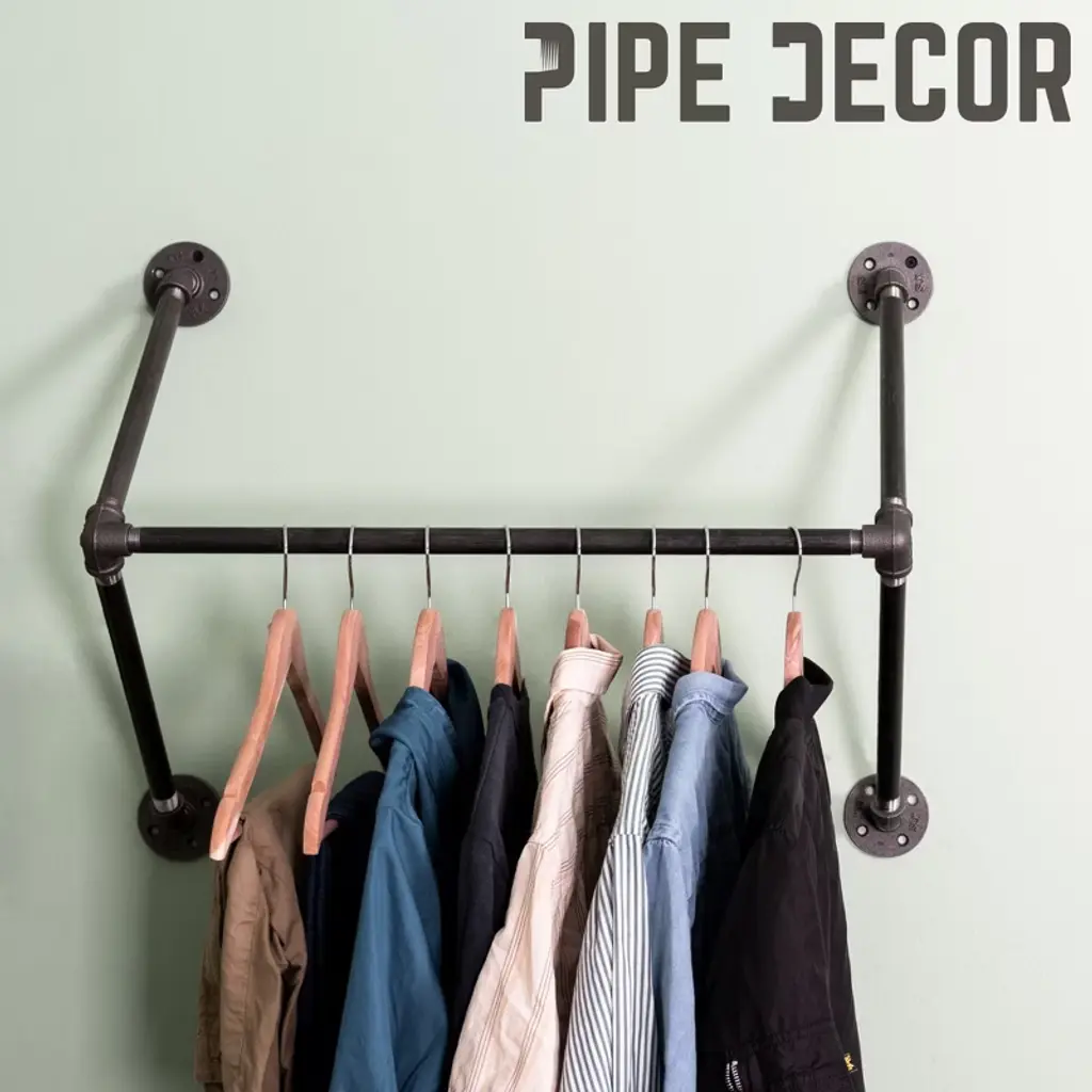 No closet? No problem. This easy-to-assemble wall-mounted clothing rack, made from authentic steel pipe, will have your room looking organized in no time. Don’t let the simple design fool you—our heavy-duty pipe, paired with four malleable iron flanges and assorted fittings, keeps your clothes organized and where they belong. It works well in both residential and commercial settings. You will know Pipe Decor parts and accessories when you hold them. Beauty and beast. Strength and style. This is real industrial pipe for your decorations and designs—accept no substitutes. All pipes and fittings come coated in a light industrial grease to prevent rusting. We highly recommend cleaning and sealing each piece before assembly to ensure they stay rust-free. Sealing the pipe with polyurethane spray will protect it from rust and scratches. Your hands may get a little dirty, but that is the price of high-quality industrial pipe fittings. Assembly is required. The assembled rack measures 27 in. wide (24 usable hanging inches) and 10 in. deep. The kit uses 1/2 in. pipe and fittings, including four flanges, four 12-inch pipes, one 24-inch pipe, two side outlet elbows, and sixteen screws with anchors. The pipe is made from welded Sch. 40 steel, with the final color varying from dark grey to black. Weight-tested to hold up to 50 lbs. with anchors and screws, we recommend securing at least one side into a wood stud whenever possible.