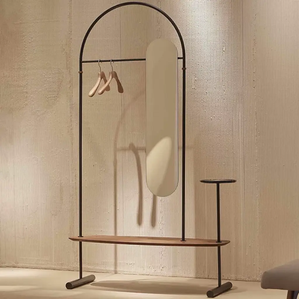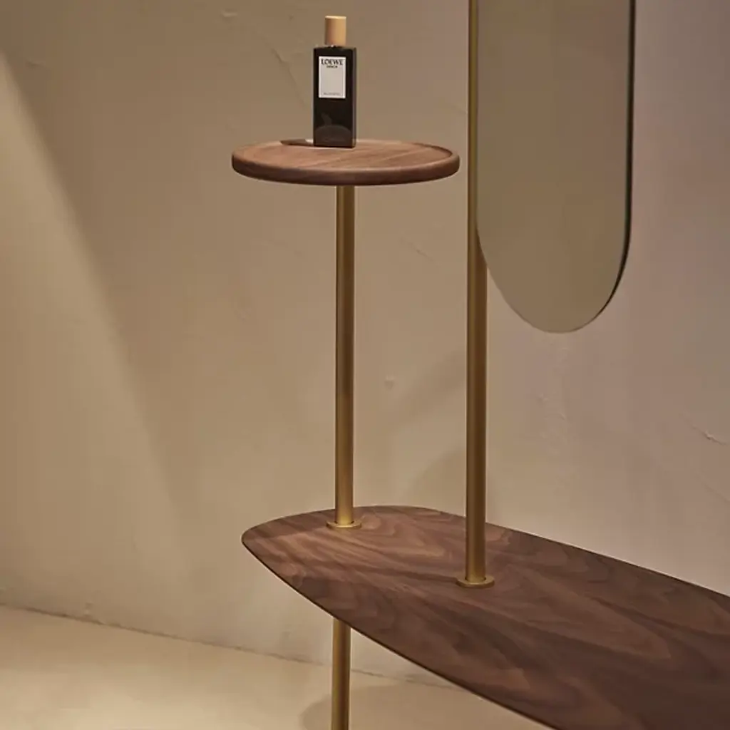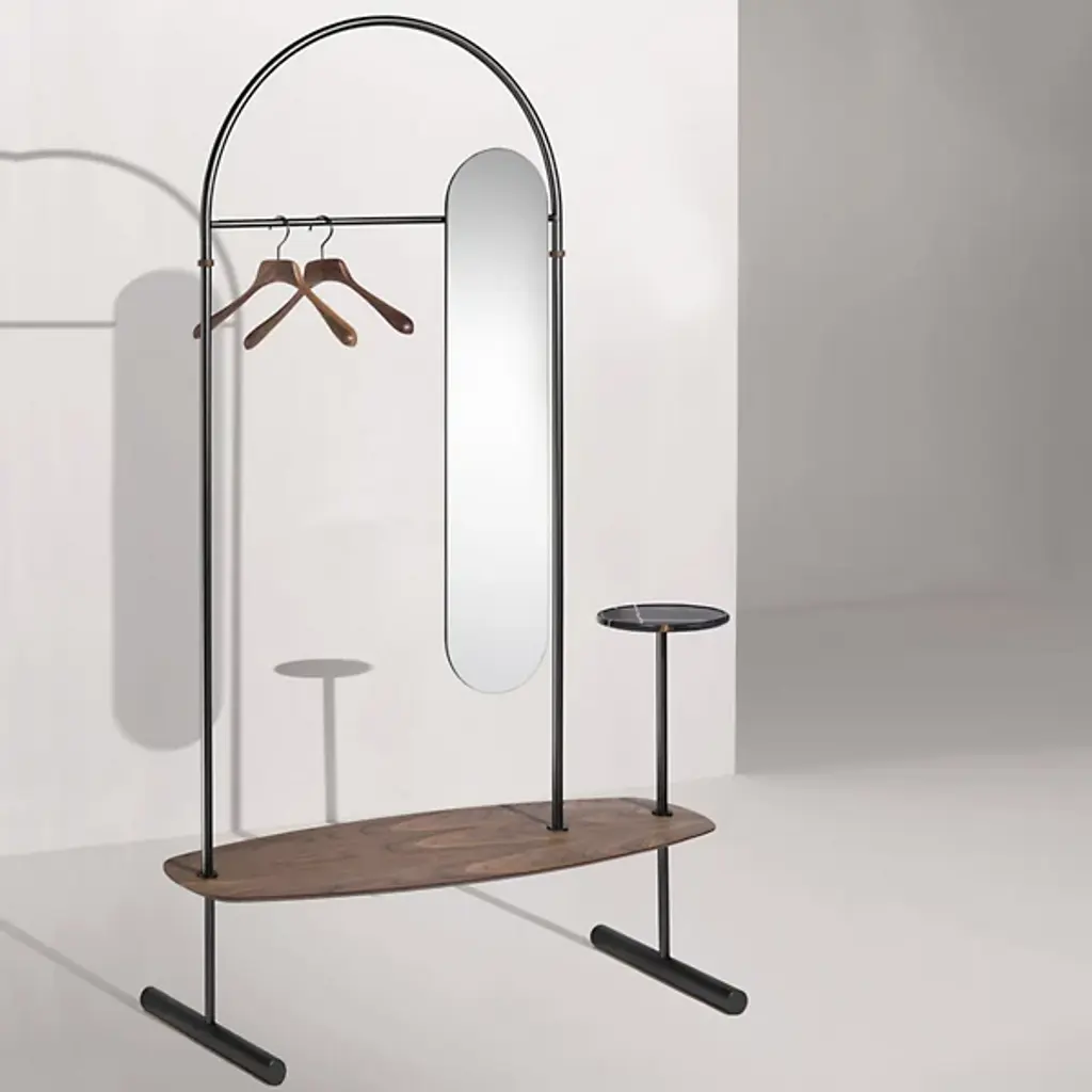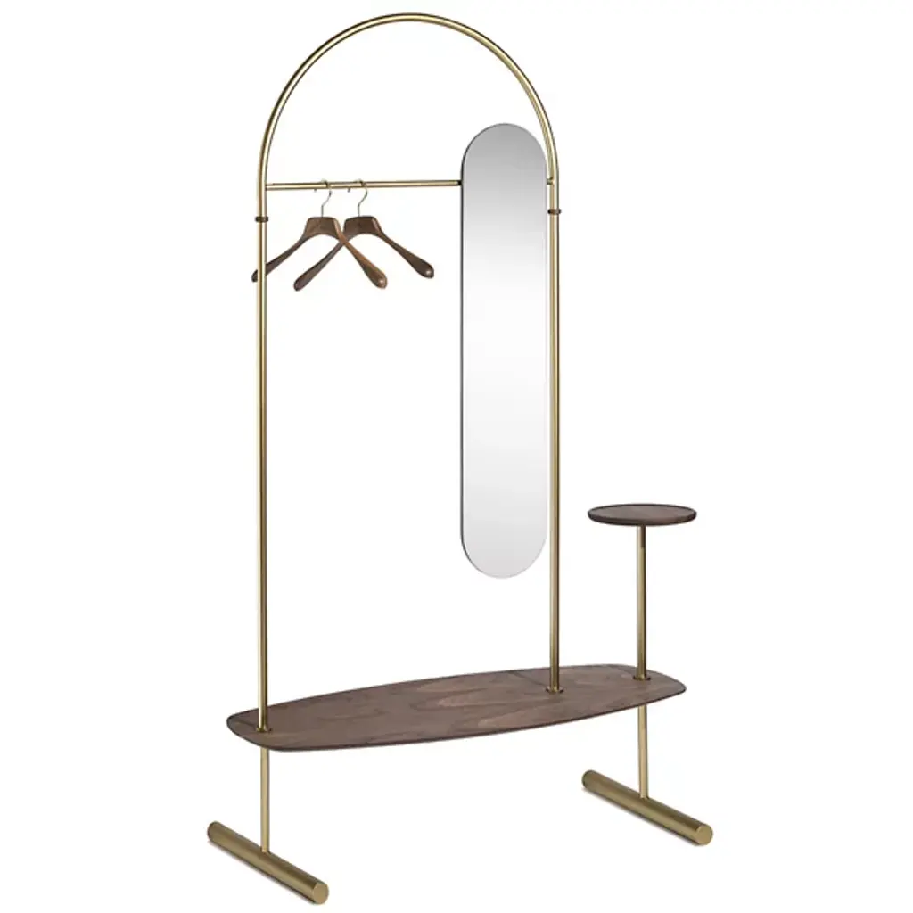 Helping get the day started with artfulness, playfulness, and efficiency. Add a surge of visual depth to a room while simplifying the morning routine with the Arco Clothing Rack and Mirror from Nomon. The sheer precision on display surely comes from designer Andres Martinez’s jewelry-making background. Martinez’s pieces seek to honor noble materials with enduring, serene designs. Martinez creates a piece that’s equally absorbing from any viewing angle. Slender metal rods shoot up from a base in asymmetric contours. One produces a circular tabletop for one’s essential items. The other rod produces an elongated mirror and a clothes-hanging valet pole. For a quick rest, a wood seat extends across the piece in rich detail.