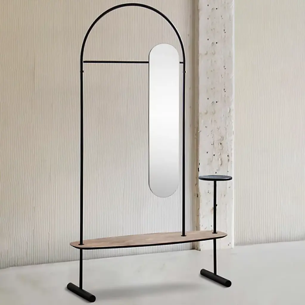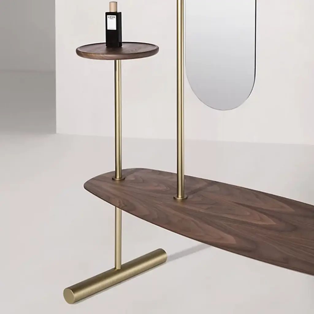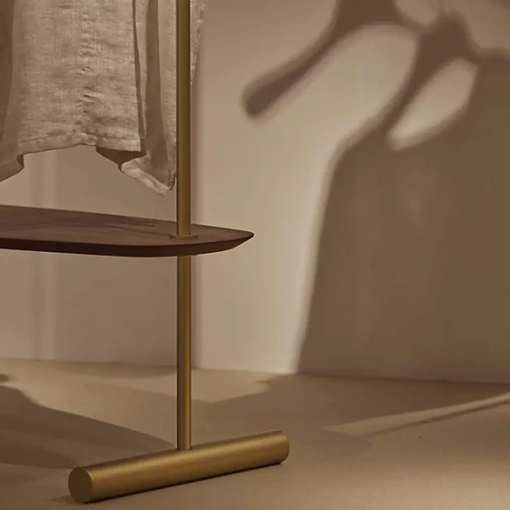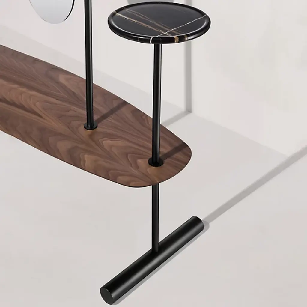 Helping get the day started with artfulness, playfulness, and efficiency. Add a surge of visual depth to a room while simplifying the morning routine with the Arco Clothing Rack and Mirror from Nomon. The sheer precision on display surely comes from designer Andres Martinez’s jewelry-making background. Martinez’s pieces seek to honor noble materials with enduring, serene designs. Martinez creates a piece that’s equally absorbing from any viewing angle. Slender metal rods shoot up from a base in asymmetric contours. One produces a circular tabletop for one’s essential items. The other rod produces an elongated mirror and a clothes-hanging valet pole. For a quick rest, a wood seat extends across the piece in rich detail.