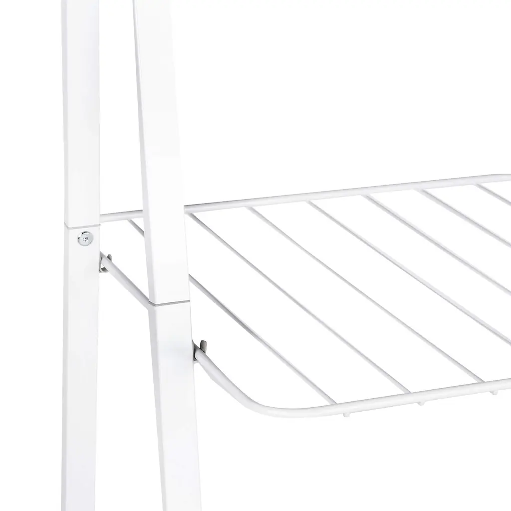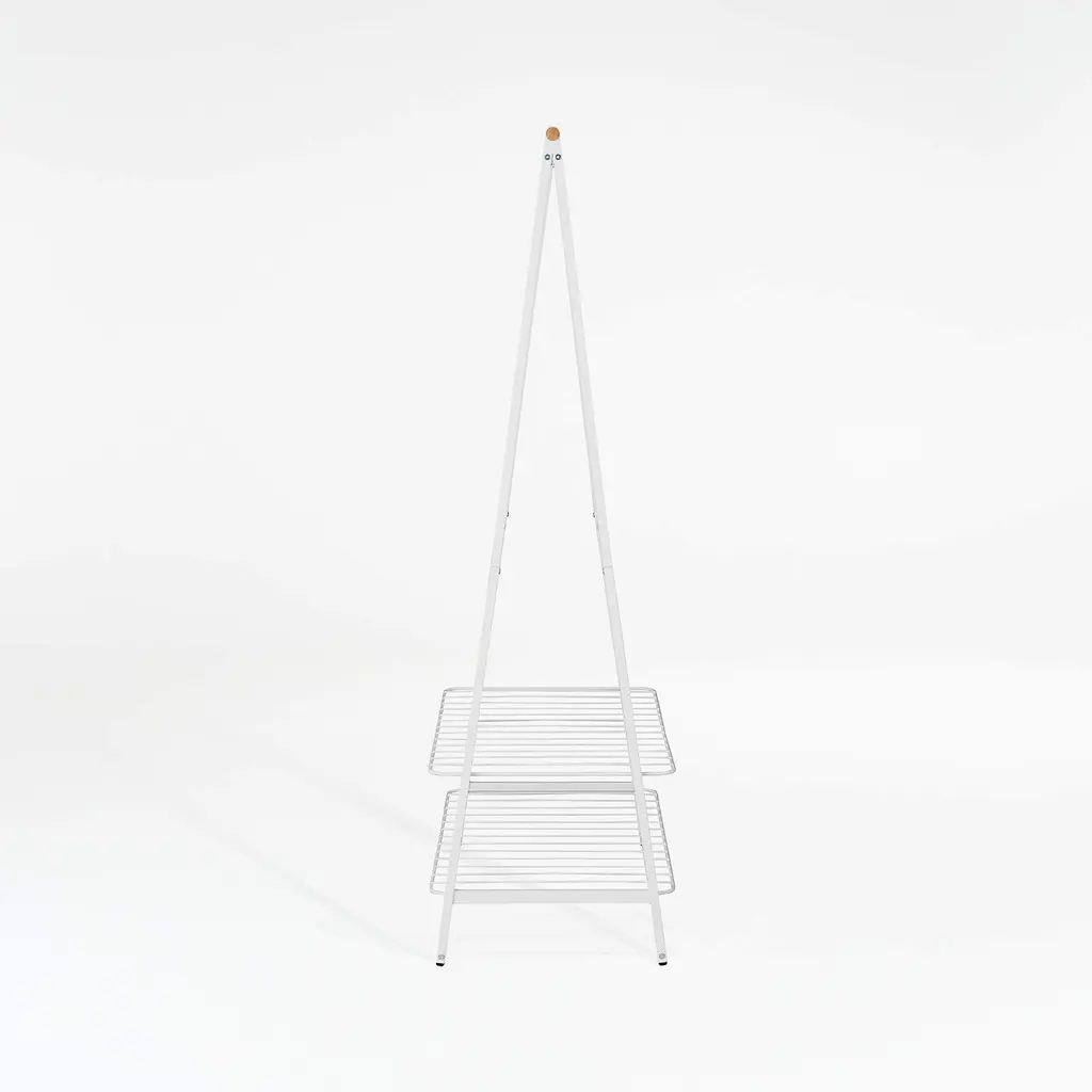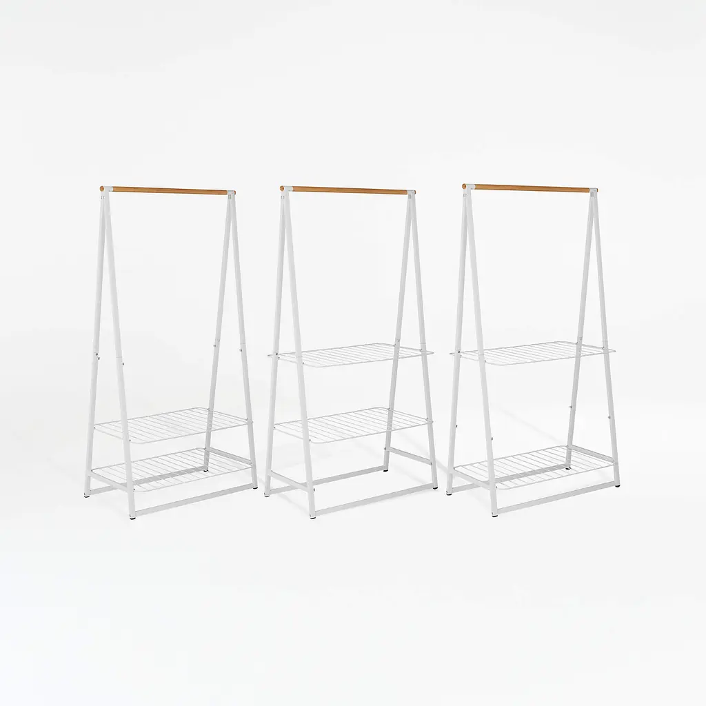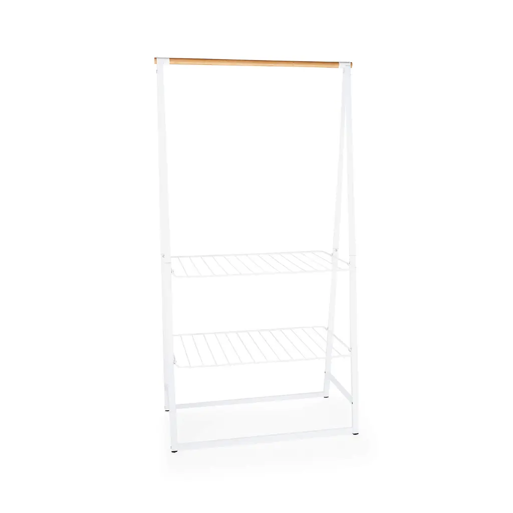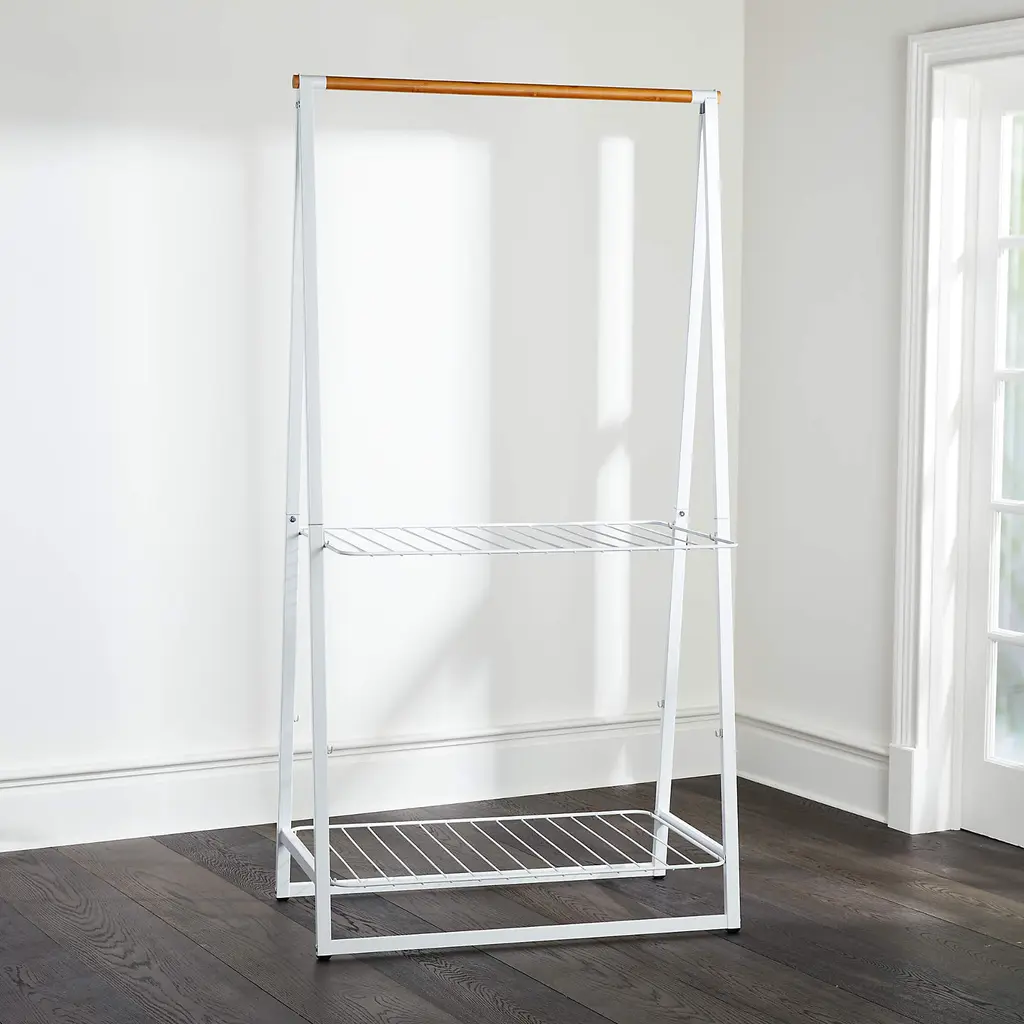 With two adjustable shelves and a sturdy horizontal rod, this rack holds clothes and accessories in style. Glossy white powder-coated steel joins gorgeous natural bamboo for a storage essential with minimalist, Scandi appeal. The bamboo rod holds up to 28 items on hangers, whether ready to wear or air drying, with longer items hanging between the wire shelves. Those white shelves are adjustable for optimal, flexible storage, holding bins, folded clothes, hats and shoes. Attractive enough to display in a modern bedroom, this versatile rack also adds utility to a bathroom, laundry room or mudroom.