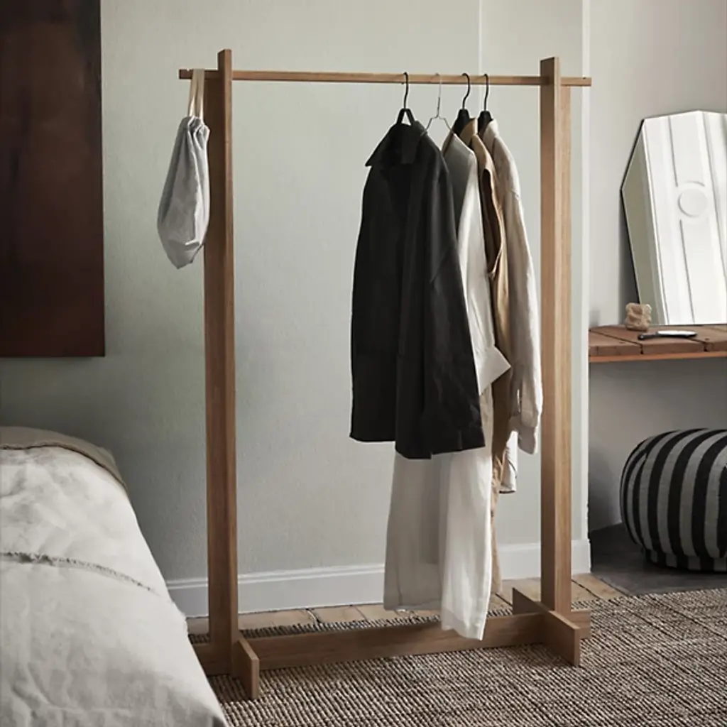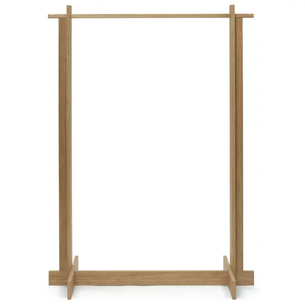The Bridge Clothes Rack from Ferm Living is an elevated expression of Scandinavian minimalist design, featuring a slim, linear frame with intersecting corners and a steady base. Each rack is made in Poland, with an FSC Certification that makes its stepped plank design sustainable, striking a balance between straightforward storage and the refined natural character of its vibrant wood grain surface. The stark linear elements create an architectural accent that allows clothing to be secured on a single crossbar for easy access, and an oiled oak veneer around an MDF core adds rustic warmth.