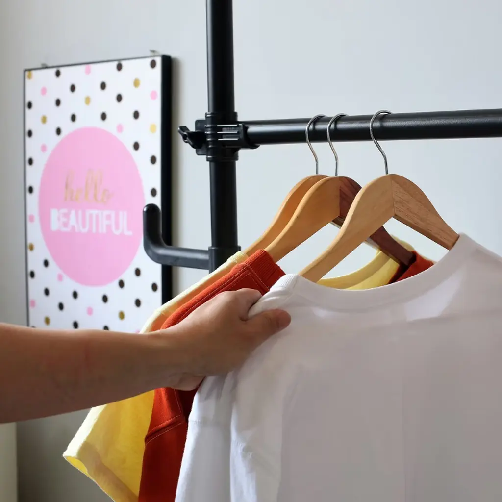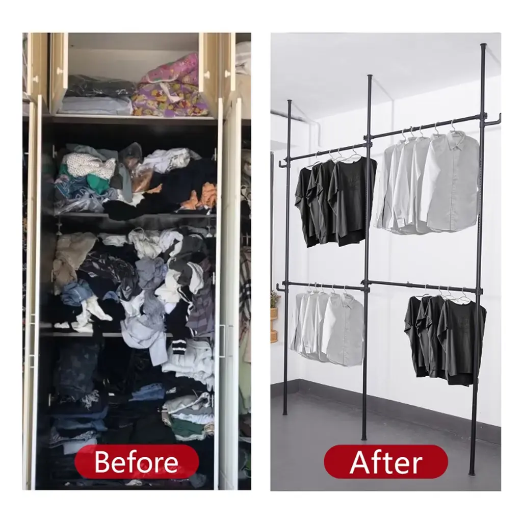 The double pole garment rack helps sorting clothes out and storing with heavy-duty capacity. You can place more clothes while saving space. Save more space and improve the utilization rate of the room. The bracket of the crossbars locked tightly with the vertical bars by bolts. The height of the crossbars can be adjusted up and down by loosening the bolts. You can pull the crossbar out from both sides to make the crossbar extended to hang bags&ties, etc., very convenient.