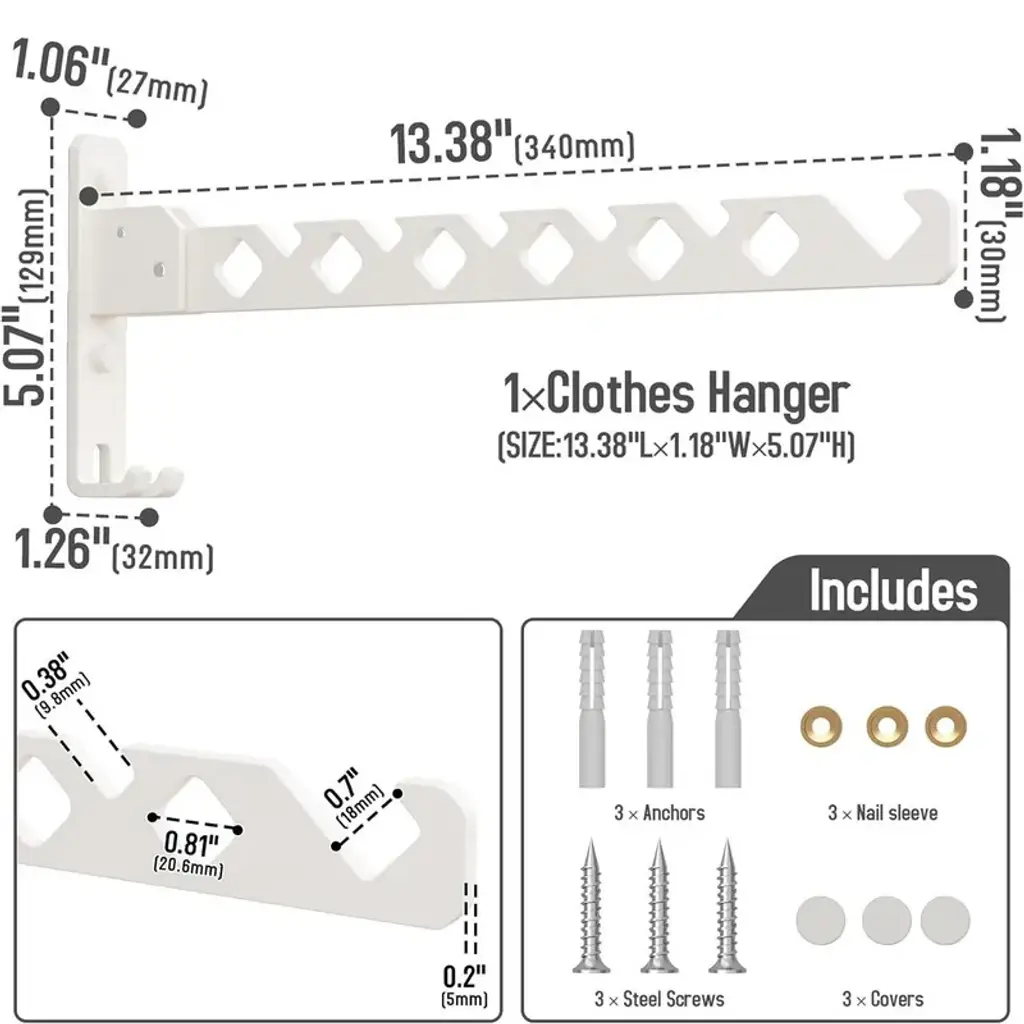 THREE POSITION ADJUSTABLE ANGLE: Our wall mounted coat hook has three angles to choose from. The drying rack can be hung freely. When you don't need to use it, the body of the folding coat rack can be rotated 90 degrees to make it fit snugly in your closet, saving space and giving you a tidy closet. RUST AND CORROSION RESISTANT: Our wall mounted hangers are made of high grade aluminum, rust and corrosion resistant. Even if your clothes get wet, these wall mounted hangers are sturdy and durable and won't bend. Don't be fooled by its small size, it is very durable and efficient, ideal for wall hanging. MULTIPLE APPLICATIONS: these wall mounted hangers are suitable for small spaces and out-of-the-way corners, ideal for bedrooms, bathrooms, closets, laundry rooms and closets to maximize space savings MODERN DESIGN: The wall-mounted hanger fits anywhere you need hanging space, and the modern, minimalist design adds beauty to the space. EASY INSTALLATION: Installation takes only a few minutes. Installation takes only a few minutes. All you need to do is choose the mounting location, drill holes, insert anchors and install screws. After fixing the folding coat rack, you can start organizing your belongings. Package includes: one coat hook, 2 screws, 2 anchors and 2 sets of screws. It is recommended to prepare a screwdriver and find the right position before drilling the holes.