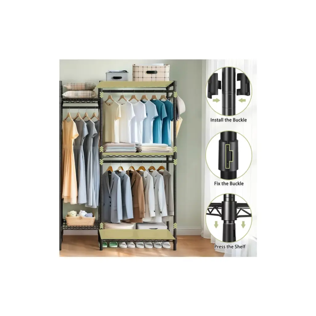 Massive Storage Space: This heavy duty garment rack is equipped with 8 wire shelves and 5 clothes hanging rods, providing you with ample storage space. The clothes hanging rod is designed for dresses and trousers, and it drapes naturally without wrinkles; the upper and lower shelves are stable and load-bearing, whether it is stacking shoe boxes or stacking storage boxes, they are neat and orderly. From light summer clothes to heavy winter clothes, it can easily accommodate the clothes of the who
