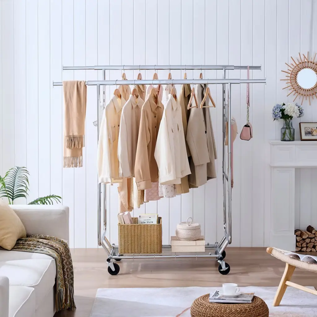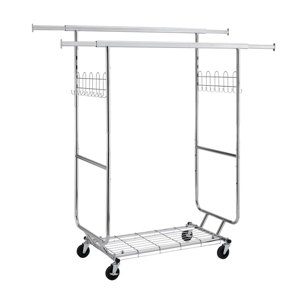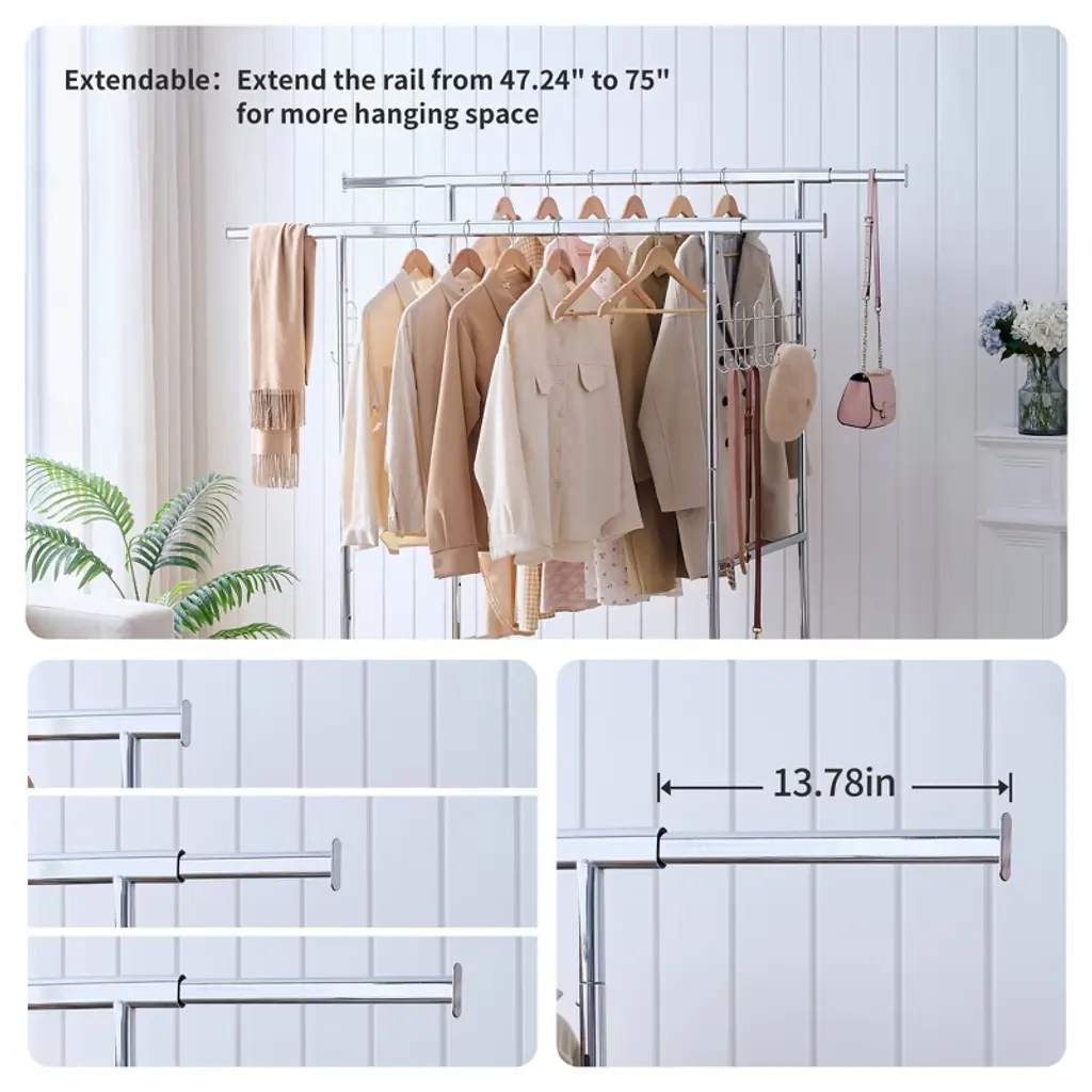 5 Minutes Easy to Assemble and Disassemble: This heavy duty clothing rack comes with all part and clear instructions.No tools and screws are required to assemble this clothes hanger.The Clothes racks can be easily assembled&disassembld in 5 to 10 minutes by one person. 360° Move & Collapsible Design: The commercial grade clothing racks is equipped with four 360° Silent removable rolling solid casters (2 with lockable brake) , The surface of the wheel is of anti-skid design, enables the metal garment rack to be flexible moved to anywhere without leaving scuff marks and scratches on the floor. Collapsible design for folding the heavy duty clothing rack flat to save space or easy its transport when not in use. Adjustable and Extendable Clothes Rack Heavy Duty: The extensible horizontal rods of this rail garment rack from 47.24" to 75".Height adjustable from 65" to 70" accommodates short and long garments.You can adjust the length and height of rods to meet your space needs.The bottom of the clothes hanger is designed with triangular bracket, which can improve the overall stability Max Load Capacity 800lbs: All-steel heavy duty clothes rack is solid and sturdy to hold up to 800lbs.(400lbs on the double hanging rods. 200lbs on the bottom shelves for shoes and luggage storage.200lbs on the hook on both sides of the clothes hanger ) It can meet all your extra garment storage needs