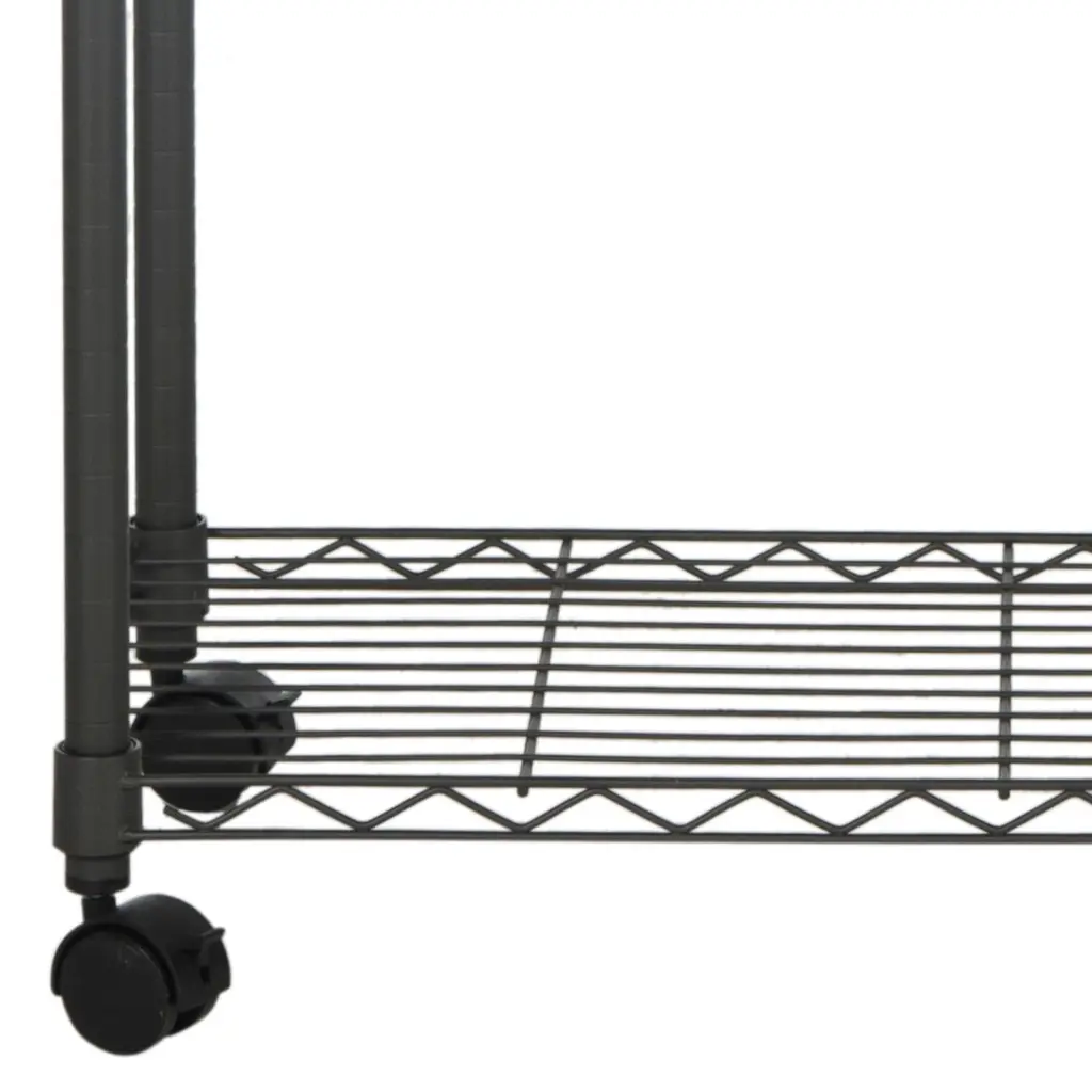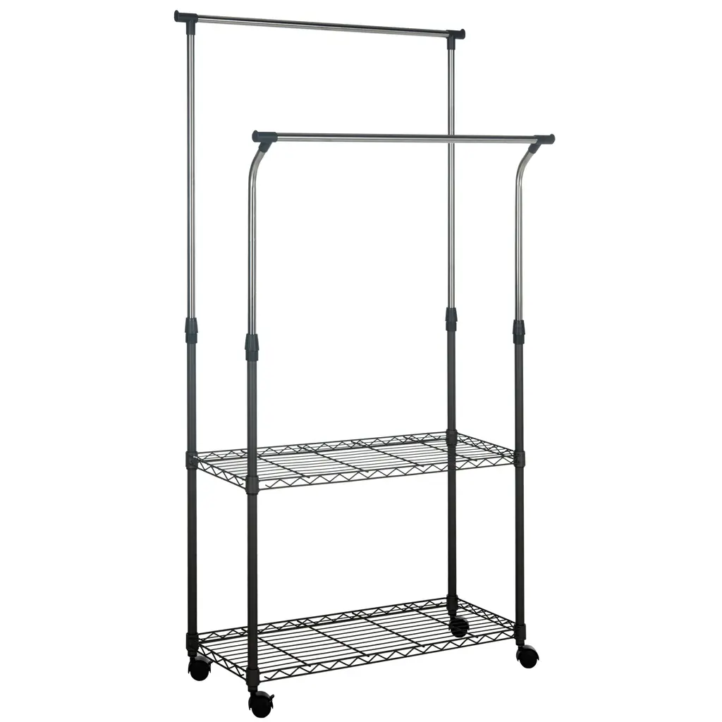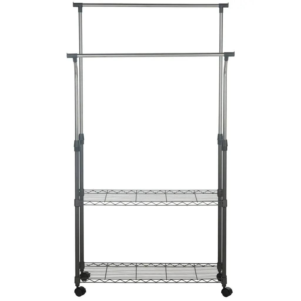 The Giorgio Double Rod Clothes Rack is a portable wardrobe solution with maximum storage. Two long vertical rods ensure garments of all sizes and shapes can breathe, while hefty storage shelves ensure that accessories are visible and instantly accessible.SAFAVIEH's Happimess storage solutions are a practical and easy way to declutter any room of purpose, including commercial, industrial, and residential. Perfect for organizing your garage, workshop, kitchen, pantry, closet, or utility room, these multiuse pieces can easily be customized for any desired storage need, proving to be a timeless investment.Features:Color: BlackMetal type: Carbon steelContents: Steel, ABS, PEMeasures 35.4 in. wide x 13.8 in. deep x 66.9 in. highQuantity of shelves: 2Weight capacity: 88 lbs.Number of boxes this will ship in: 1Maintain with regular dusting and clean with mild soap and water, dry thoroughly, and do not use a brass cleaner.Assembly required.