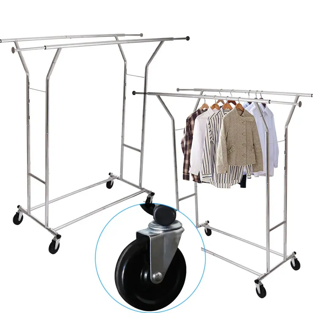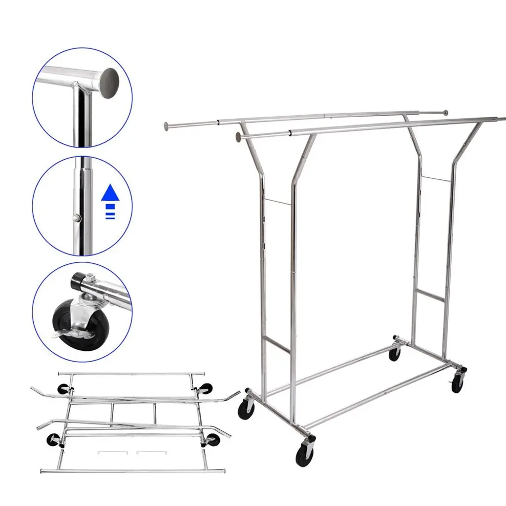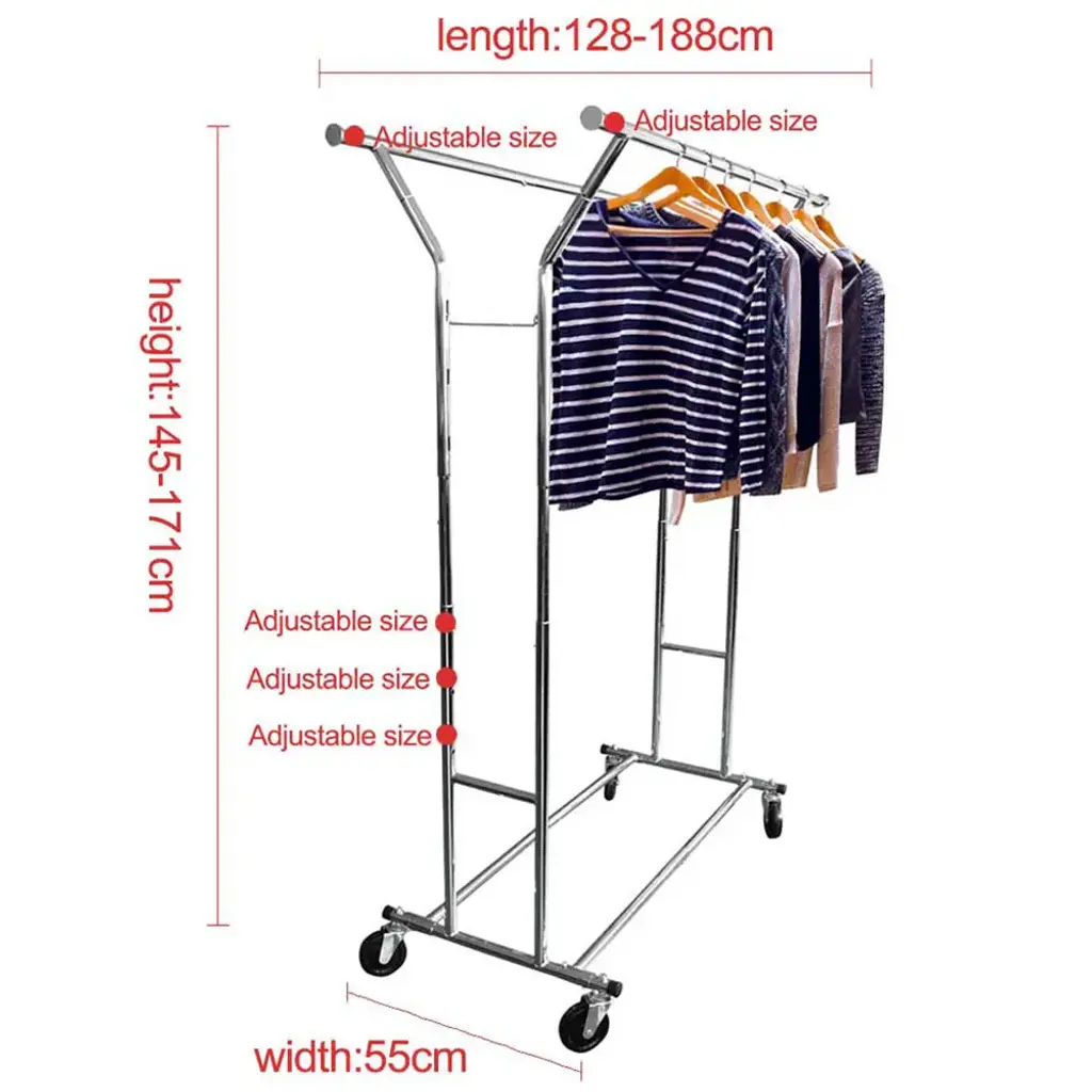 Specification:Key Features:Description:Maximize your storage with this portable double-bar steel clothes rack in sleek silver. Crafted from durable steel, it measures 51 x 22 x 65 inches and adjusts in height and width to fit your needs, with a robust weight capacity of 250 lbs. Designed for efficient organization, this rack features a sturdy structure, perfect for holding heavy garments while taking up minimal space. Ideal for home, dorm, or commercial use, it's a practical solution for hanging and organizing clothes effortlessly.