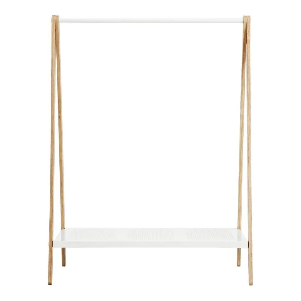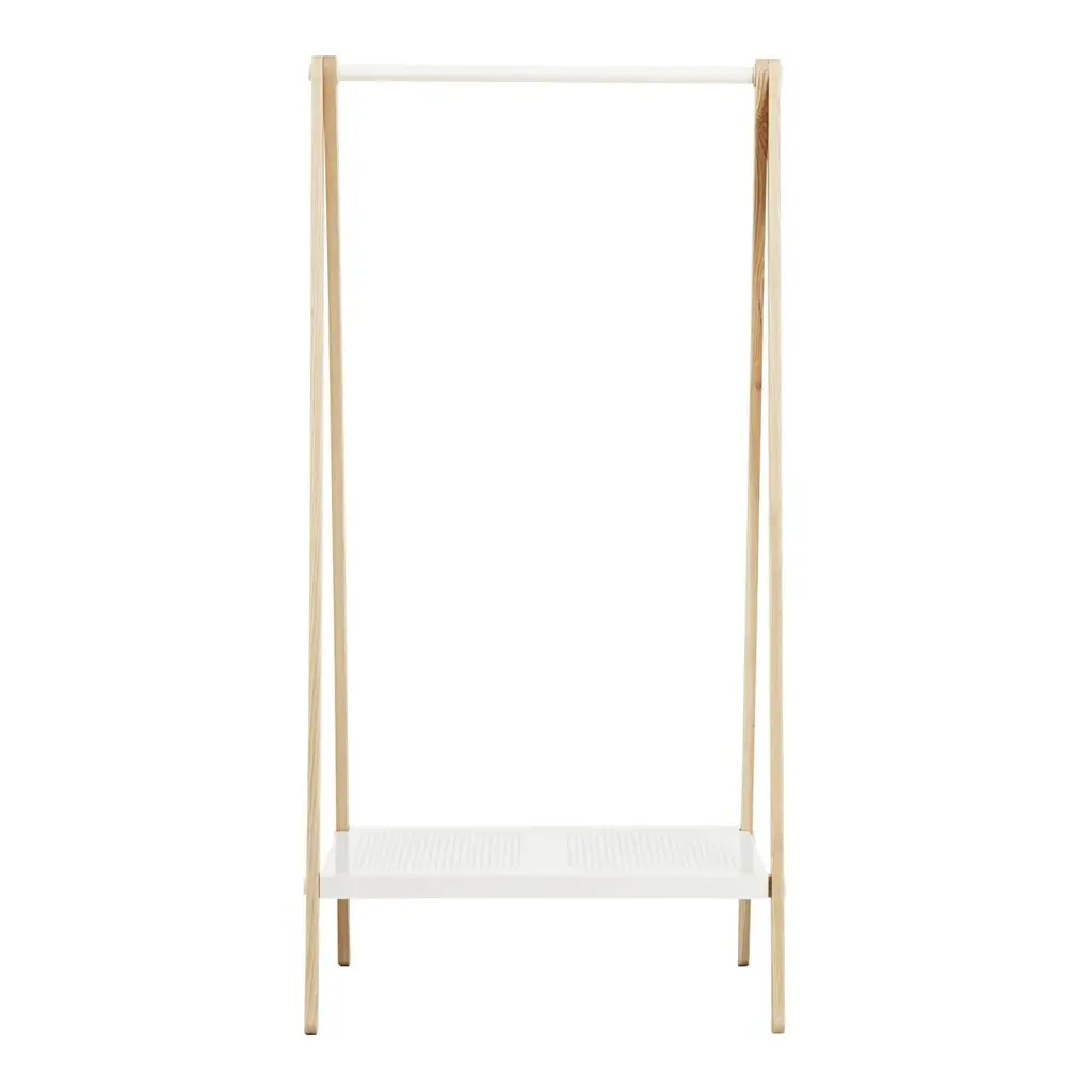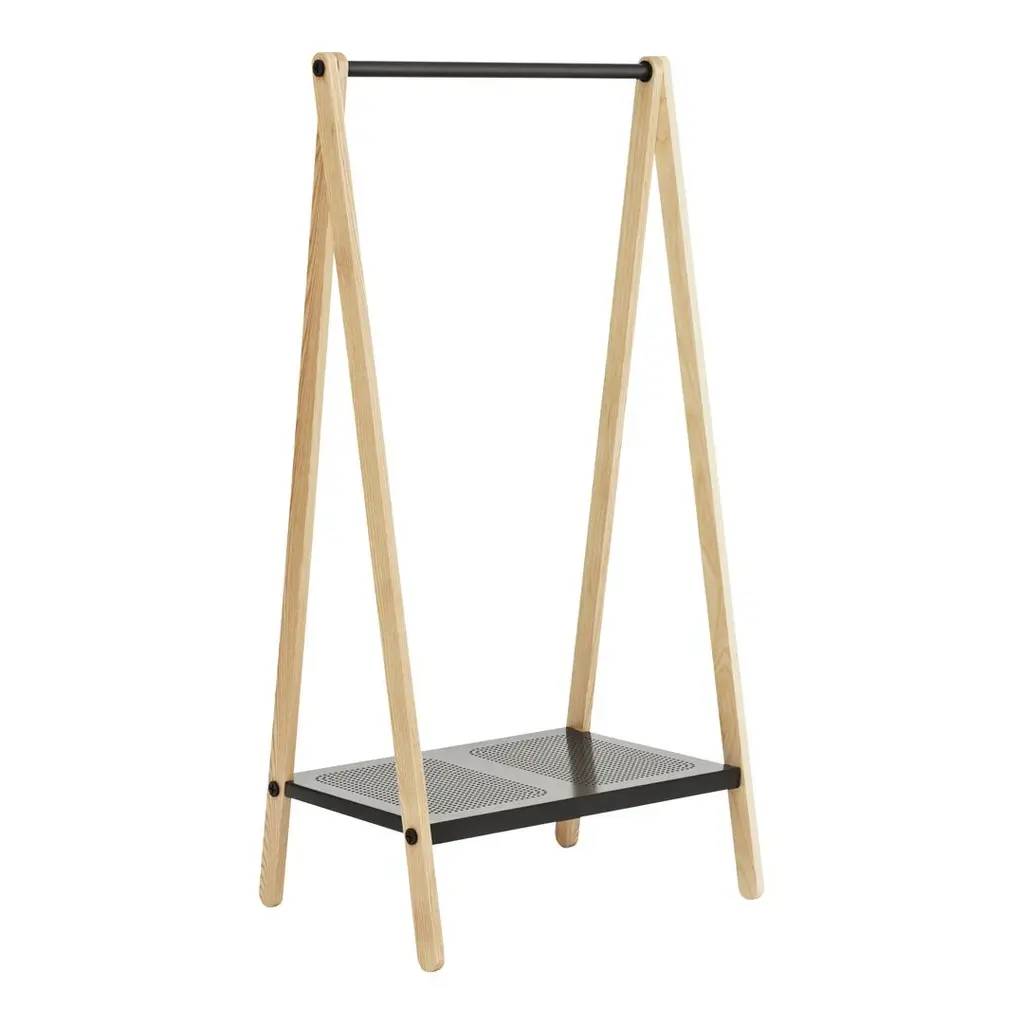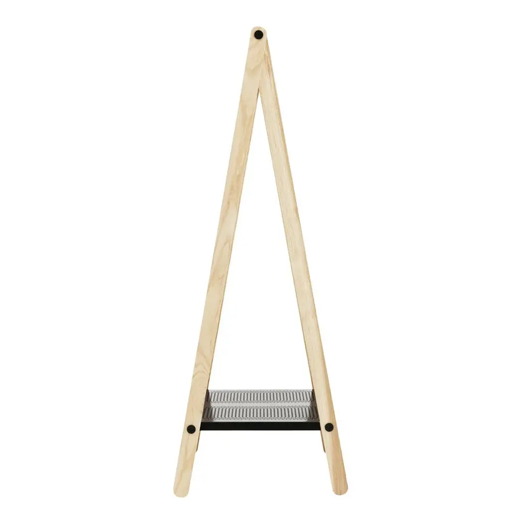 Toj is a clothes rack with an industrial and simple expression. Its function is evident and its simple construction – with a rail, shelf and trusses – provides space for clothes, shoes and bags. Use Toj in the hall, in the living room, the office or the bedroom. Toj helps organize your clothes, shoes and bags in a stylish way. Toj is produced in two different sizes, in ash wood with white or grey shelves. Easily assembled by following the included manual. Load capacity: ~ 44 lbs (20 kg) on the bar and ~ 66 lbs (30 kg) on the shelf.