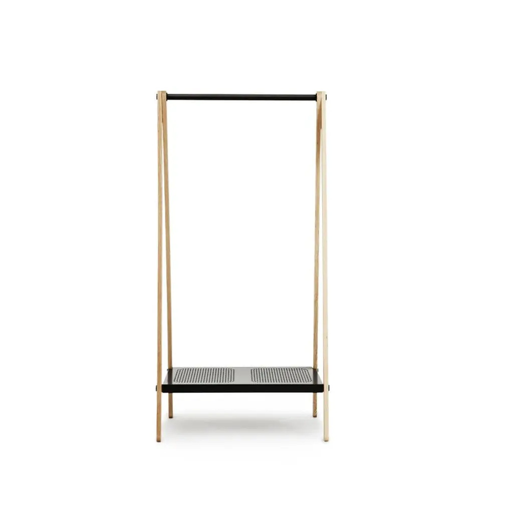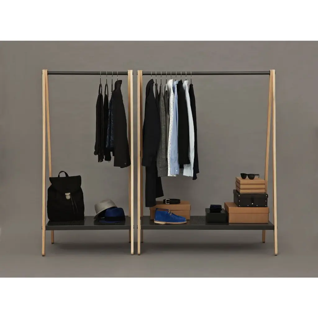 Toj is a clothes rack designed for Normann Copenhagen by Simon Legald to store and at the same time display your clothes, shoes and bags. Toj is characterized by an industrial and simple expression and the idea behind it was to bring the wardrobe out from the cupboard. The frame is in ash wood and the sturdy shelf and hanging rail are made of steel. Toj clothes rack is available in two different sizes.