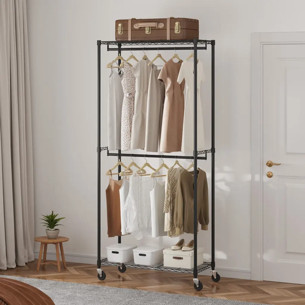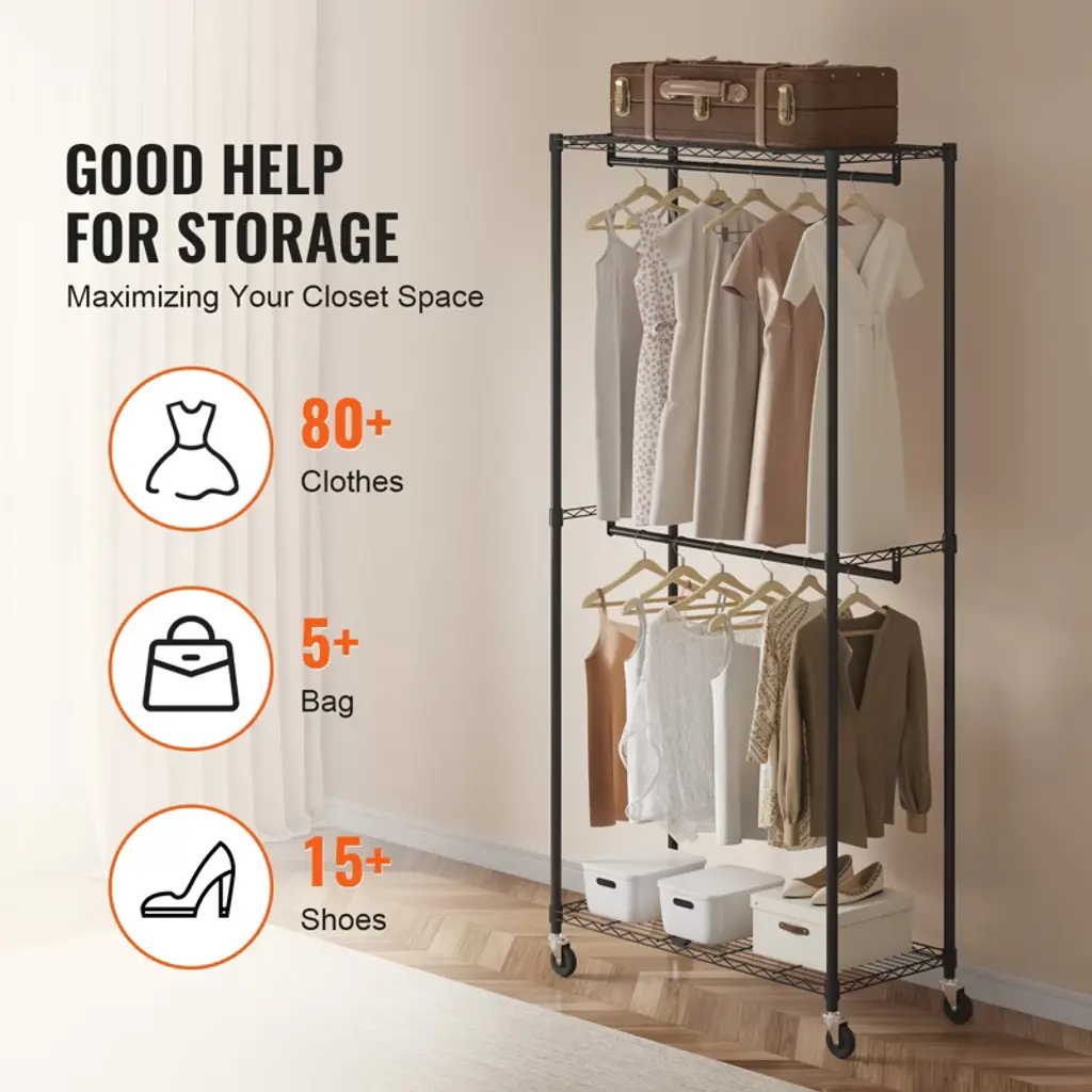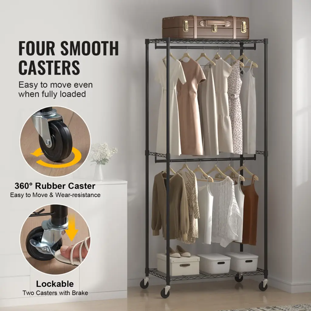 Feature: Enjoy More Space: With two hanging rods, a top shelf, and a bottom shelf, the garment rack on wheels provides ample storage space for clothes, shoes, boxes, or accessories, allowing for a perfect display. The clothing rod keeps everyday garments or seasonal outfits always within reach. Sturdy & Durable: With a thickened steel diameter of 1 inch (25.5mm), this heavy duty garment rack can bear the weight of up to 300 lbs effortlessly. It provides secure and reliable support for your entire clothing collection, ensuring garments are held securely and well-supported. Move or Fixed: VEVOR rolling garment racks come with four casters, two of which are lockable. Whether you need to effortlessly glide the rack across your bedroom for outfit selection or securely park it in place when ironing, these versatile casters ensure smooth mobility and steadfast stability, adapting to any situation. Easy Assembly & Adjustment: The middle hanging rod utilizes a sliding sleeve locking system for effortless assembly and adjustment. Simply install the clip and slide the shelf down slowly until all four sleeves fit snugly onto the poles. Please note that the gaps between the clips are normal and essential for ensuring a firmly anchored shelf, and not a quality flaw. Versatile Usage: Our clothing rack is not limited to the bedroom or closet. It can be used in various settings, such as laundry rooms, entryways, or even as temporary clothing storage in guest rooms or during events. This versatility allows you to adapt and use the garment rack wherever you need it most. Package Content 1 x Garment Rack 1 x Wrench 1 x Manual