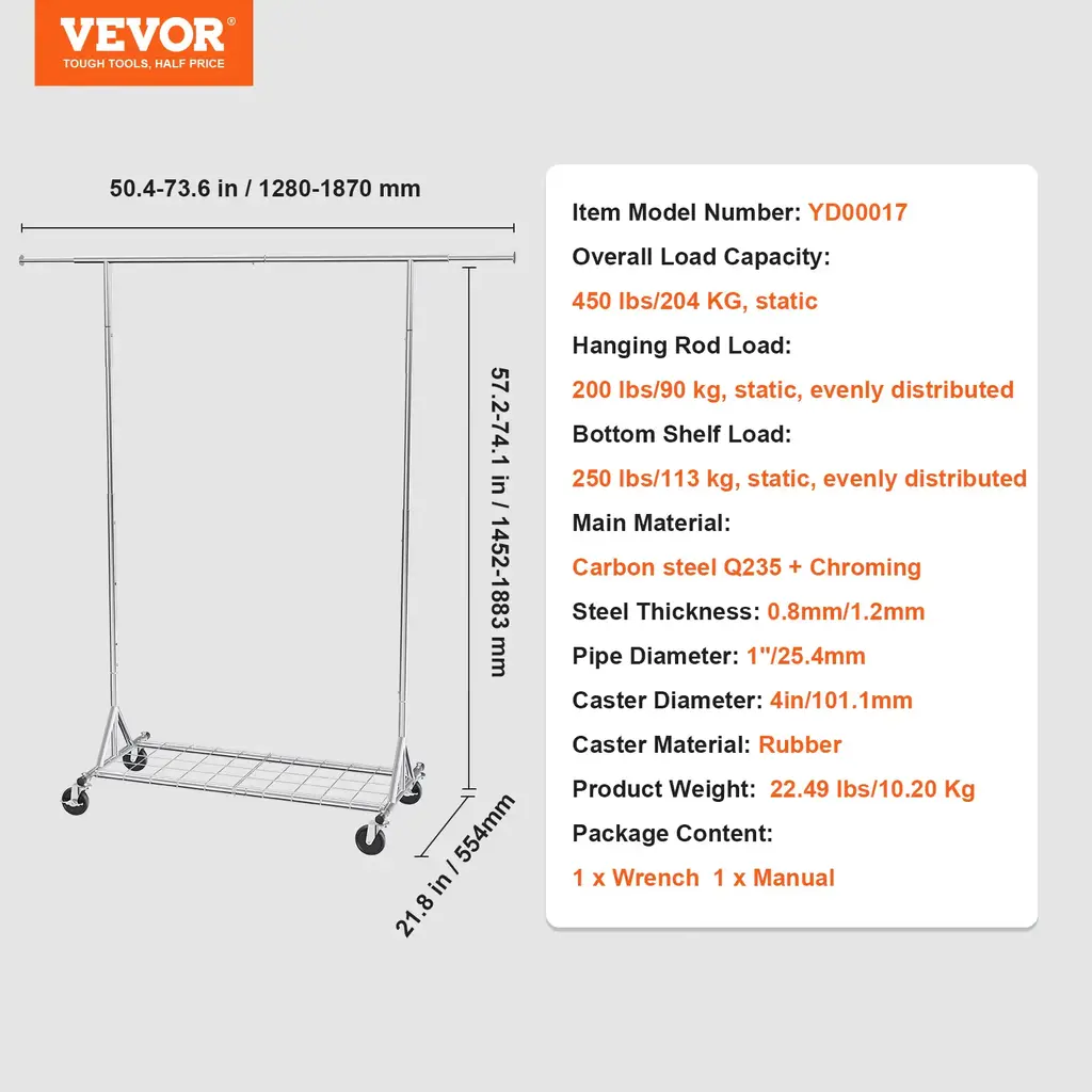 Ample Storage & Display Space: These racks offer a variety of storage options with hanging rods, shelves, and side racks, providing perfect display and organization for clothes, shoes, boxes, and accessories, suitable even for small areas. Sturdy & Durable Construction: Crafted from heavy-duty carbon steel with powder coating and a thickened steel diameter (up to 1 inch or 25.5mm for some models), these garment racks ensure exceptional strength, stability, and can bear significant weight (up to 600 lbs for specific models). Adjustable & Extendable Design: The racks feature extendable hanging rods and adjustable shelves or heights, allowing for customized storage solutions that accommodate both shorter and longer garments, and adapt to varied user needs. Mobility & Stability: Equipped with four casters, including two lockable ones, the racks can be effortlessly glided across rooms or securely parked in place, ensuring smooth mobility and steadfast stability in any situation. Versatile Usage: Not limited to bedrooms or closets, these racks can be utilized in various settings like laundry rooms, entryways, guest rooms, or during events, offering adaptability according to your requirements. Package: 1 x Garment Rack 1 x Wrench 1 x Manual
