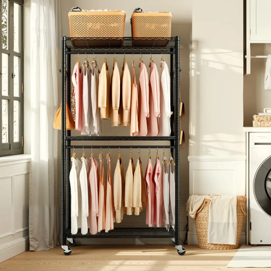 Feature: Organized Storage: This rolling clothes rack features a well-thought-out partition design, equipped with 3 spacious shelves, 2 hanging rods, and 8 hooks, providing ample storage for your clothes, shoes, bags, storage boxes, and more Sturdy Construction: Made of thickened carbon steel, this clothes rack supports up to 450 lbs / 204 kg, handling the weight of various clothing and accessories. The rust- and corrosion-resistant powder-coated finish protects against daily scratches and wear Adjustable Shelves: The height-adjustable shelves allow you to customize the storage space to fit different clothing and items. Whether it’s long coats, short jackets, folded sweaters, or accessories, you can reposition shelves to suit your storage needs Flexible Mobility: Equipped with 4 smooth-rolling 360° swivel caster wheels, this clothing garment rack moves effortlessly without damaging your floors. Two of the wheels come with locks to secure the rack in place, avoiding movement while clothes are drying Easy Assembly: This hanging clothes rack features a slide-and-lock design for hassle-free installation. With simple steps, you can install plastic clips and storage shelves. For secure fit, we recommend tapping the shelves with a rubber mallet (not included) Package Content 34 x Plastic Clips 2 Packs x Anti-Tip Straps 2 x Dual S-Shaped 4-Hook Hangers 4 x Casters 1 x Open-End Wrench 4 x Hand-Tighten Screws 1 x User Manual