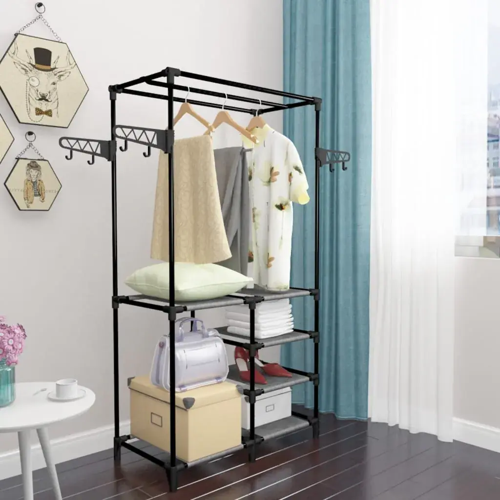 This minimalistic clothes rack is an ideal storage solution for the bedroom or bathroom.It has a tubular, powder-coated steel frame, which is lightweight yet sturdy, making the clothes rack easy to move around and quite durable. It has four shelves that are made of a non-woven fabric, and designed to keep your bags, shoes or small items organized and within reach. It also has four side arms with hooks for additional storage space for your longer clothing like coats and jackets.Assembly is easy.