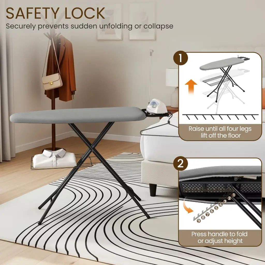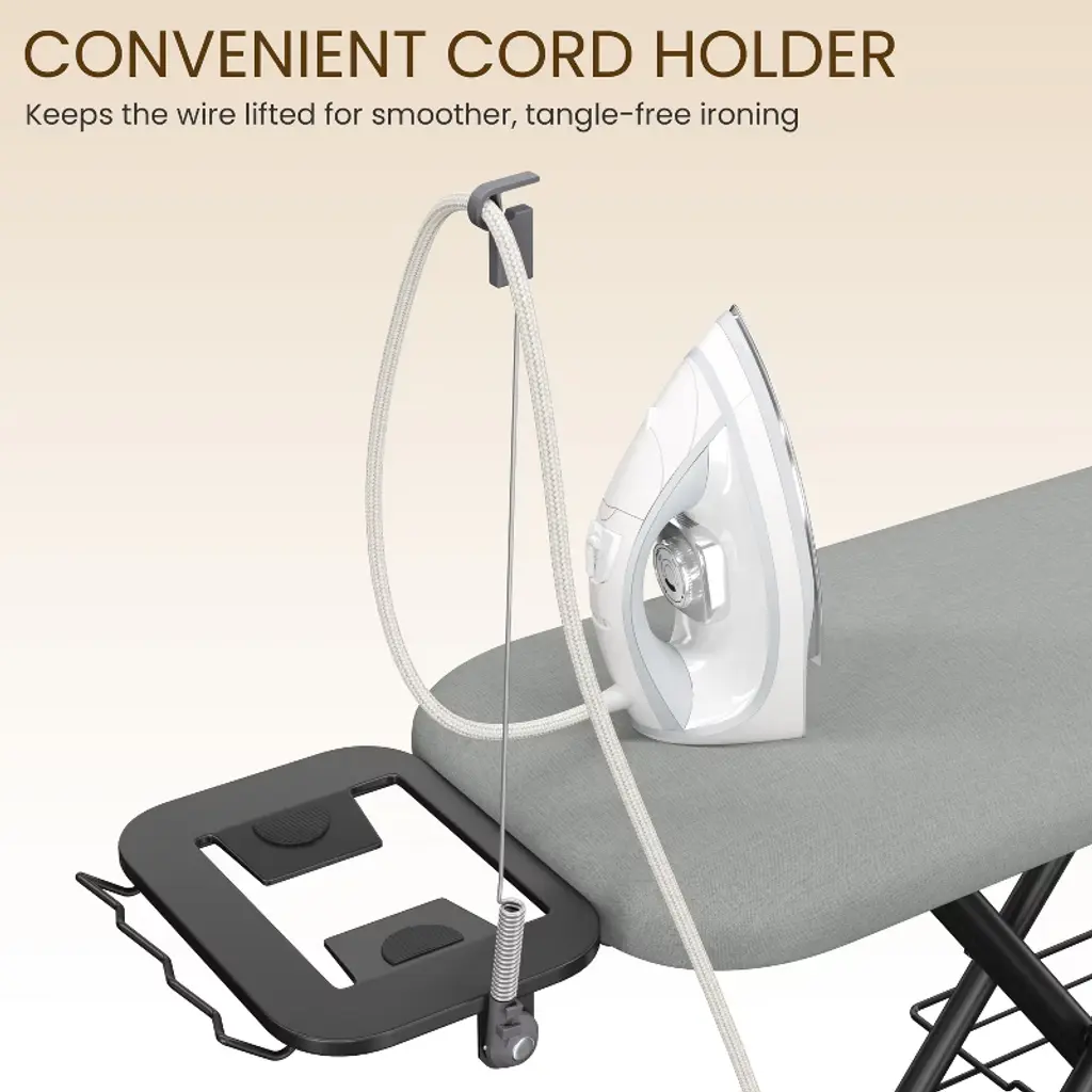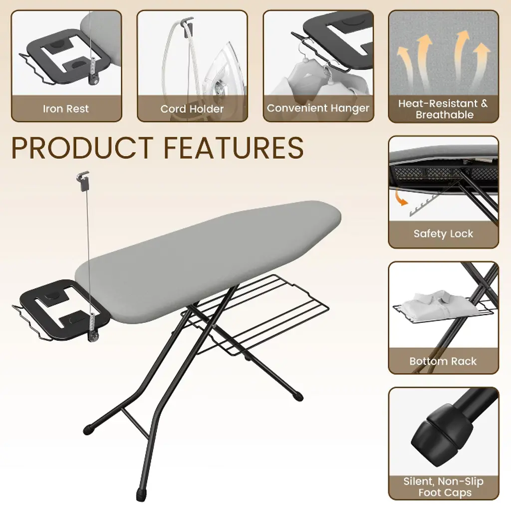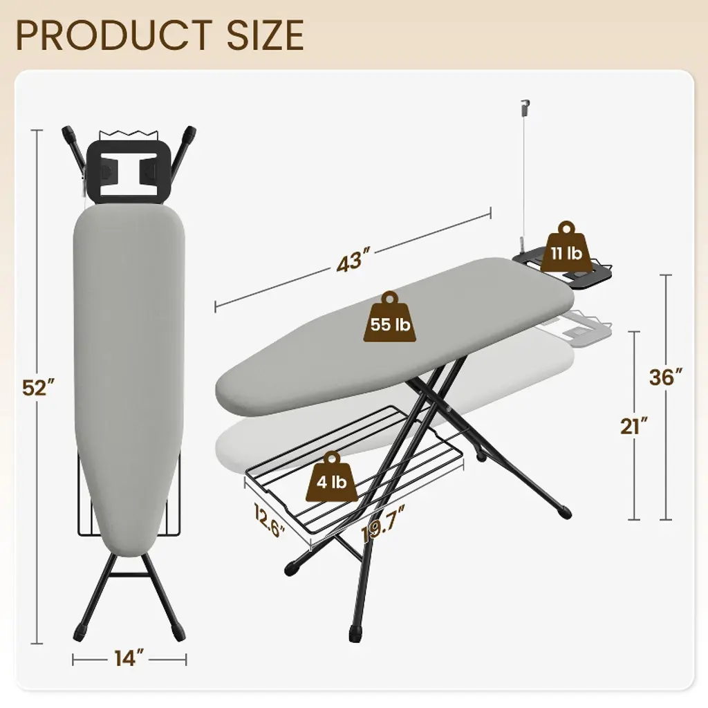 Designed for convenience and durability, this full-size ironing board features a spacious surface and strong flared four-leg construction for secure ironing. It includes protective foot pads and a safety lock for stability and floor protection. Adjustable height settings allow for customizable comfort, while the thick padding and heat-resistant mesh provide optimal ironing results. The lightweight, foldable design ensures easy storage and portability, with a built-in iron rest and cord holder for added functionality. An extra clothes rack on the legs adds practicality, making this ironing board ideal for bedrooms, living rooms, or laundry spaces. *Specifications: Color: Gray, Beige Materials: Powder-coated Steel, Foam, FabricAssembled Dimensions: 52" L × 14" W × 36" HFolded Dimensions: 61.5" L × 14" W × 2.5" HAdjustable Height: 21-36"Ironing Board: 43" L × 14" WIron Rest: 10.3" L × 7.5" WCord Holder Length: 20.5"Clothes Rack: 19.7" L × 12.6" WMaximum Weight Capacity:Ironing Board: 55 lbIron Rest: 11 lbClothes Rack: 4 lb Please see the image for exact measurements.Please allow a 1/2" measurement tolerance.