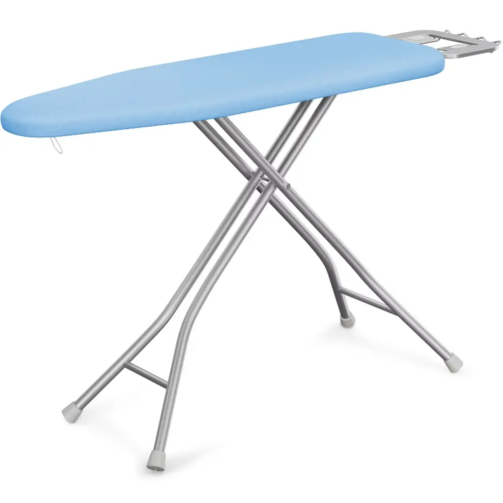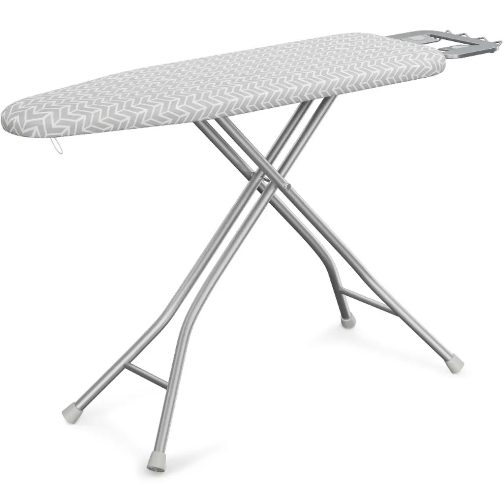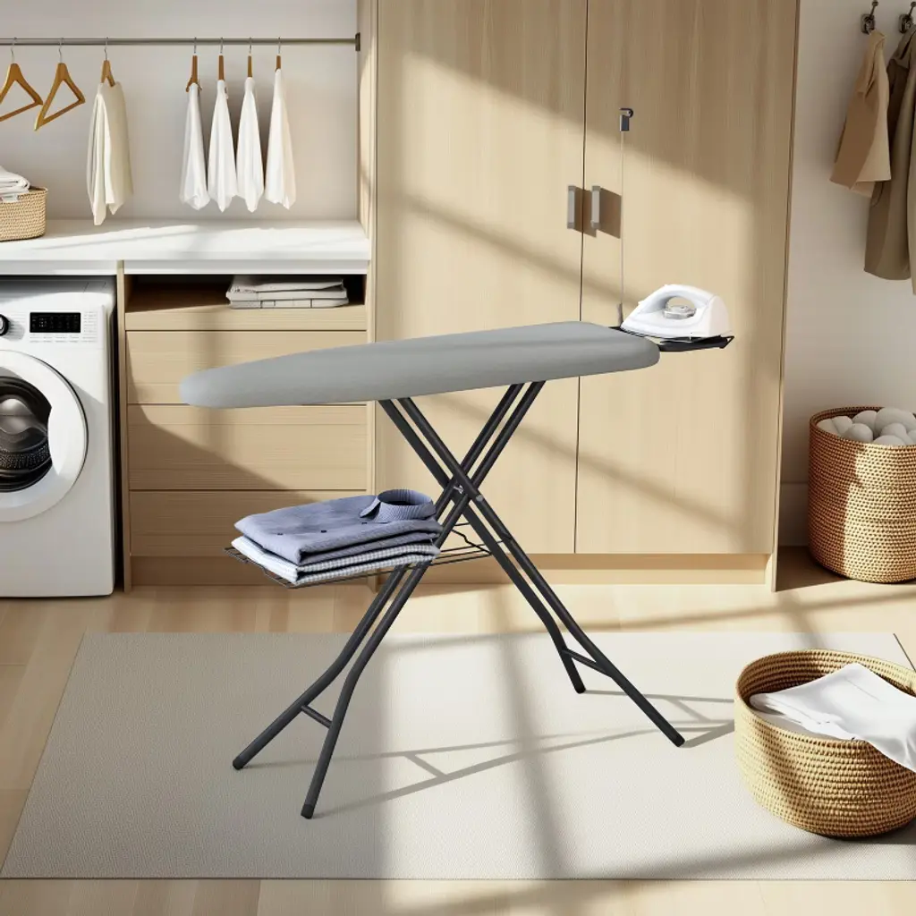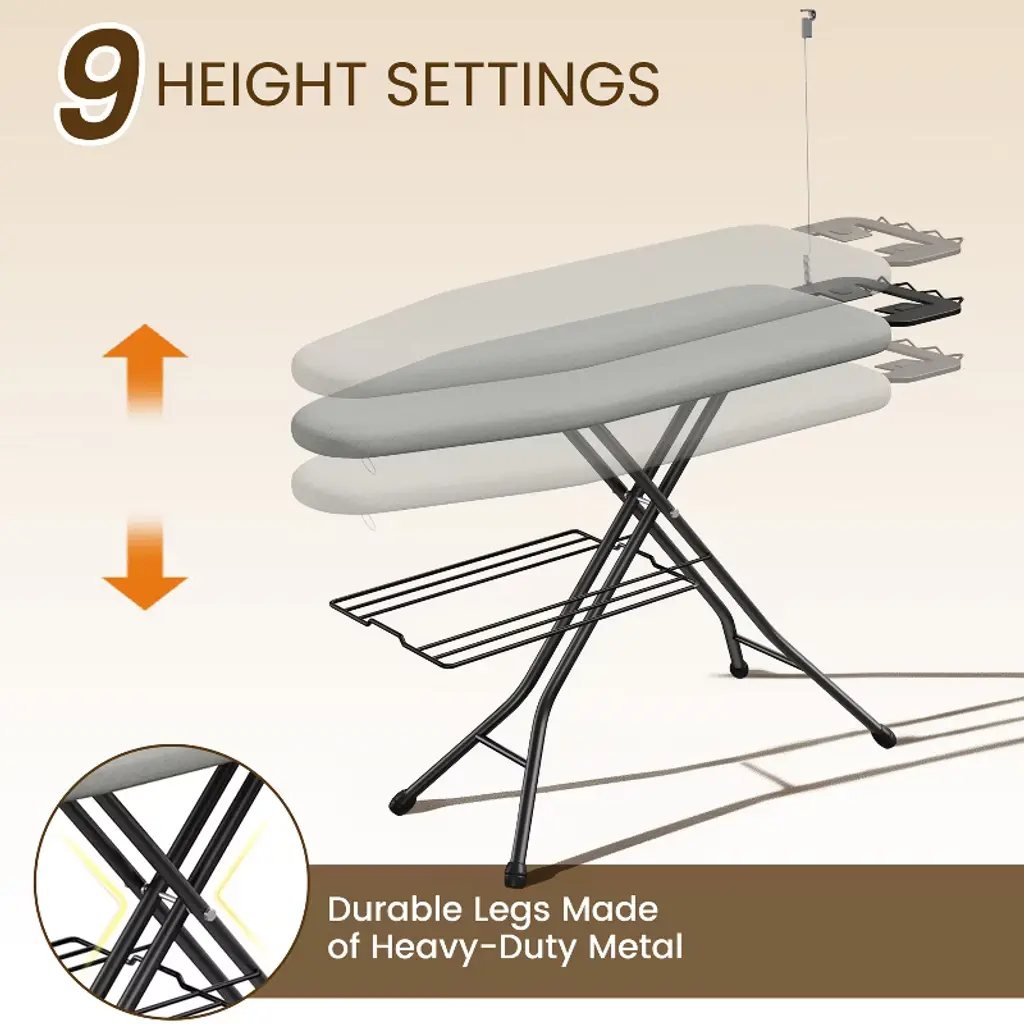 Designed for convenience and durability, this full-size ironing board features a spacious surface and strong flared four-leg construction for secure ironing. It includes protective foot pads and a safety lock for stability and floor protection. Adjustable height settings allow for customizable comfort, while the thick padding and heat-resistant mesh provide optimal ironing results. The lightweight, foldable design ensures easy storage and portability, with a built-in iron rest and cord holder for added functionality. An extra clothes rack on the legs adds practicality, making this ironing board ideal for bedrooms, living rooms, or laundry spaces. *Specifications: Color: Gray, Beige Materials: Powder-coated Steel, Foam, FabricAssembled Dimensions: 52" L × 14" W × 36" HFolded Dimensions: 61.5" L × 14" W × 2.5" HAdjustable Height: 21-36"Ironing Board: 43" L × 14" WIron Rest: 10.3" L × 7.5" WCord Holder Length: 20.5"Clothes Rack: 19.7" L × 12.6" WMaximum Weight Capacity:Ironing Board: 55 lbIron Rest: 11 lbClothes Rack: 4 lb Please see the image for exact measurements.Please allow a 1/2" measurement tolerance.