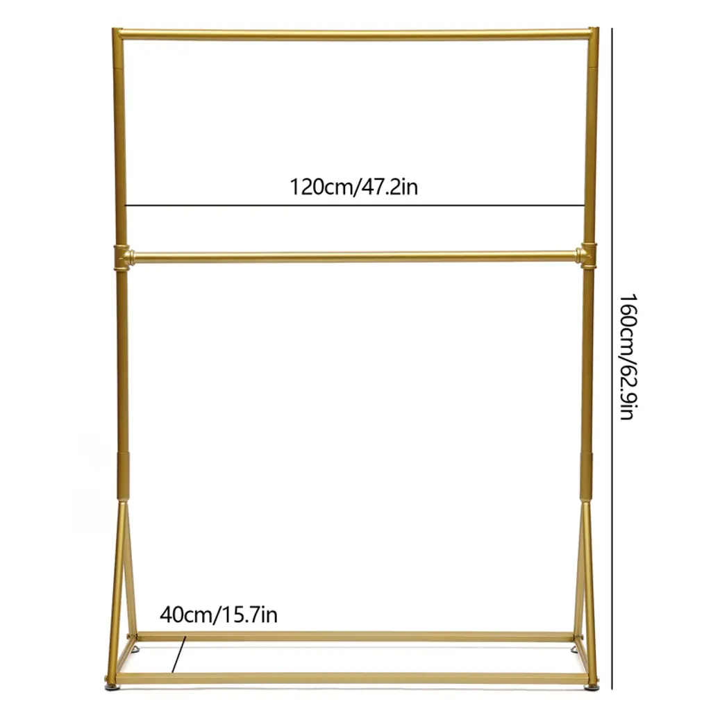 This clothing rack is made of high-quality iron that is sturdy and durable. It has a shiny gold and modern look that is in keeping with contemporary home and clothing shop styles, making it ideal for enhancing the overall look of your room. By mounting the clothes rack on the ground, you will have easy access to your clothing essentials without worrying about clutter. Details Adjustable Foot Pads: The 4-foot pads are both non-slip and can be fine-tuned within a range of 0.79-1.18in to accommodate uneven floors. Raised Round Bars: They prevent clothes from slipping off. Open Frame: It also makes it easy for you to access and store items. Smooth Edges: They not only enhance the aesthetics of the product but also improve safety during installation and use. Specification Material: Iron Process: High-temperature Baking Paint Color: Gold Style: Modern Shape: Rectangle Mount Type: Floor Standing Assembly Required: Yes Number of Tiers: 2 Load-bearing Capacity: About 30-40kg/66.14-88.18lbs Rod's Height Adjustment Range: 60-155cm/23.62-61.02in Pad Adjustment Range: About 2-3cm/0.79-1.18in Product Size: 120*40*160cm/47.24*15.75*62.99in