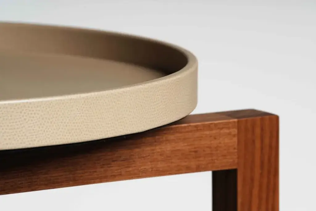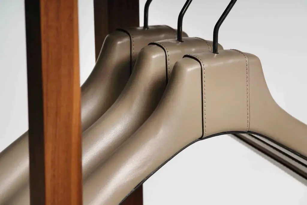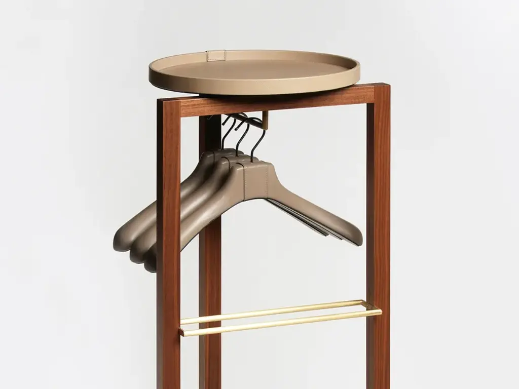 Achille is a valet stand that is entirely made with valuable walnut wood structure, enriched with brass finishes and completed with two genuine leather trays.