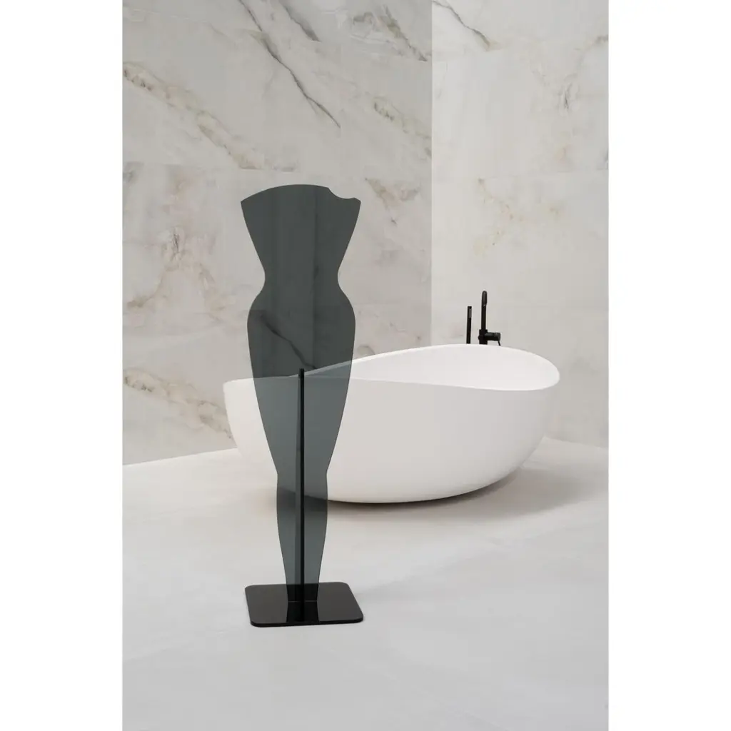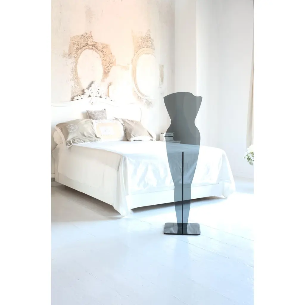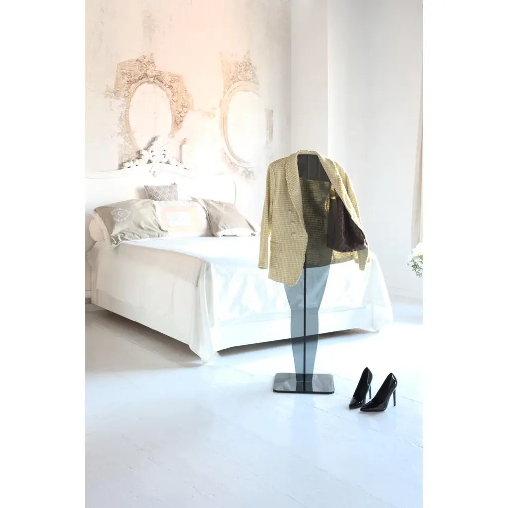 Alida Fumè Valet Stand by VUUN ITALIADimensions: D 35 x W 37 x H 132 cm. Materials: Fumè glass with black back lacquered base.Available in different finishes. Please contact us.Touch of classThe sinuous lines of Alida evoke the female form. The notch on the top is perfect for hanging your favorite bag, tie, or scarf for special occasions. The same recess enlivens Alida's perfect symmetry, giving it an even more refined profile.The smallest vertical element, in addition to carrying out a structural function, generates the optical effect of the legs. VUUN Italia creates infinitely customizable Design products designed to furnish the most refined environments. Industry and craftsmanship come together, resulting in a production totally MADE IN ITALY, as well as the fruit of the knowledge of master glassmakers and wood craftsmen in the Milan area.The study and design of the products is taken care of by Italian designer Andrea Petterini, while the name VUUN originates from the term "vün," which in the Milanese parlance means "one."