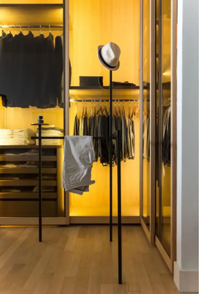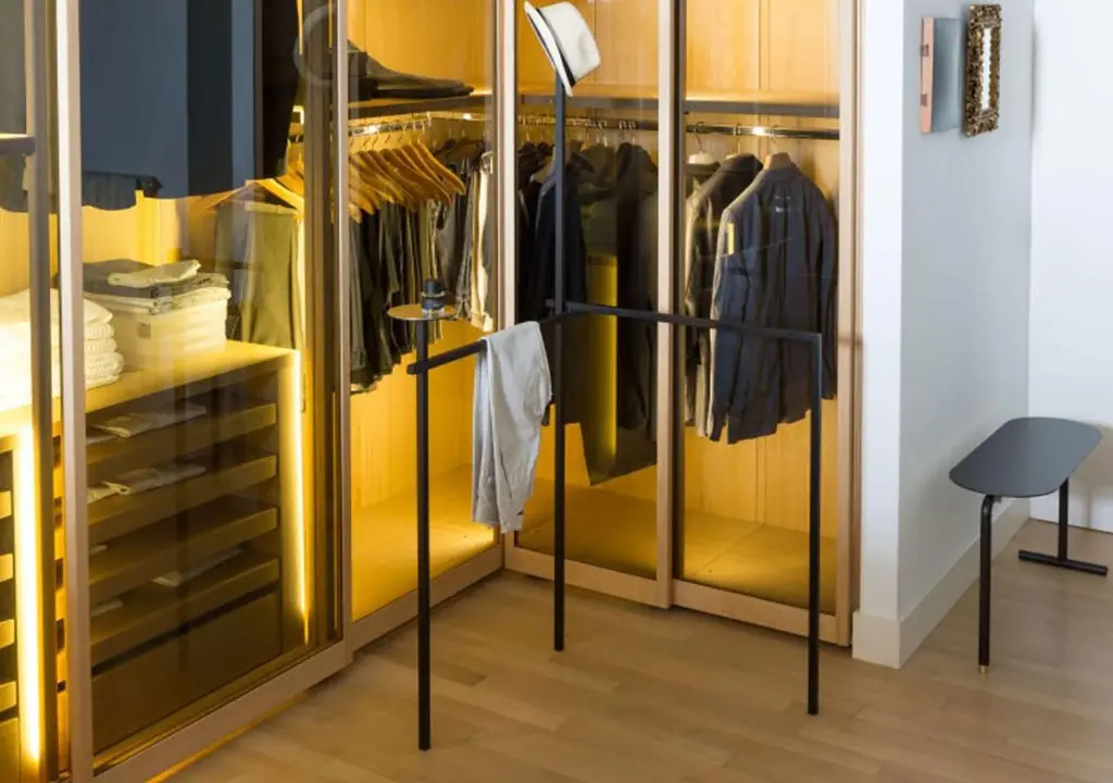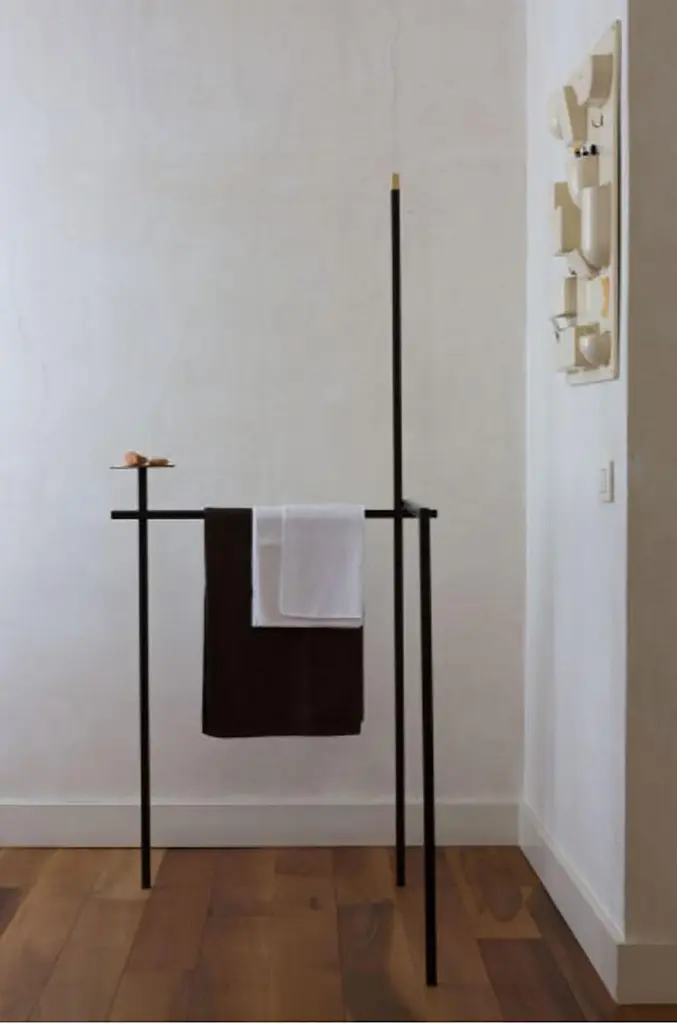 Asse Zeta valet stand by Marco Zito for Mingardo. The attention to detail and the union of materials make Asse Zeta very valuable. The brass round base becomes a little showroom for personal belongings. Asse Zeta can be disassembled and all its components can be reduced to a small package. Lines cross each other three-dimensionally in order to support, delimit and contain. Geometry and balance are combined to create a strong sense of space, they define the space and create virtual volumes.