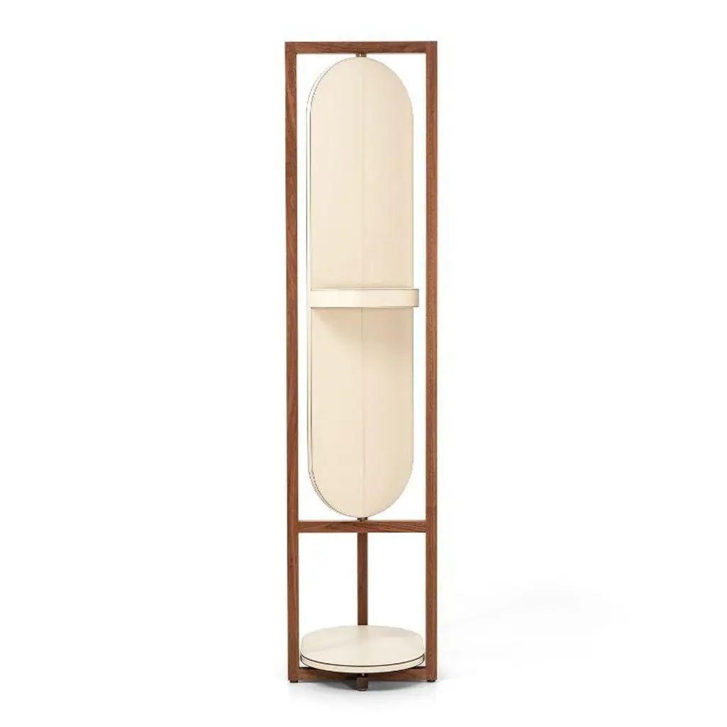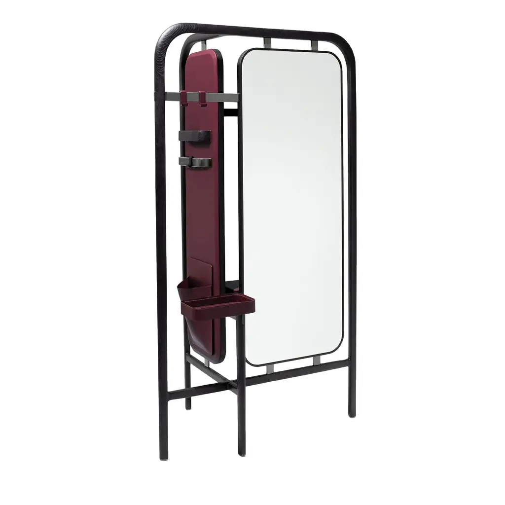 Elena, the new valet stand especially thought for Her. After the Achille style we are glad to enrich our collection with a more feminine version. The elegant walnut wood structure is now taller and embellished by a revolving mirror refined on the back with a leather upholstery and a trinket tray to store little jewels. Perfect for the elegant evening dress, the bottom is completed with a leather base that gives a prominent place to your heels. Prepare for your next gala in a unique way.