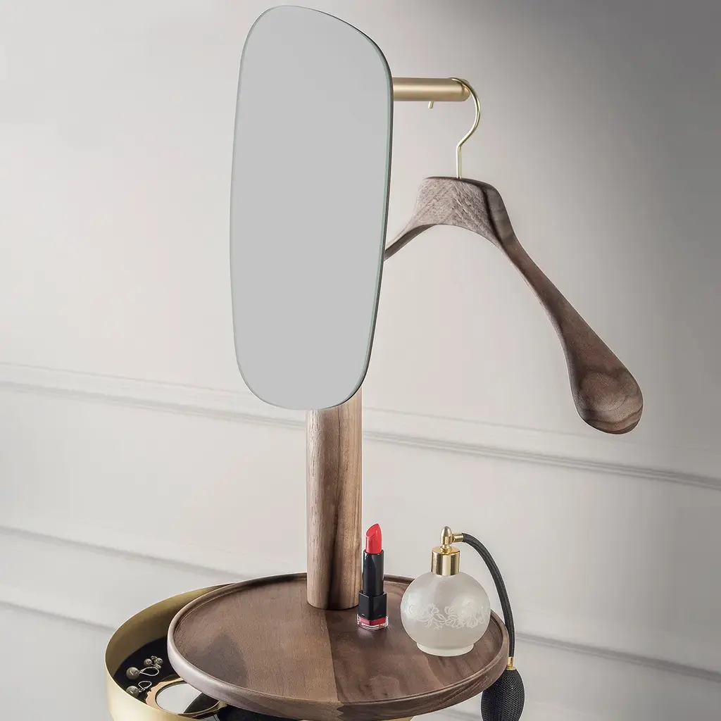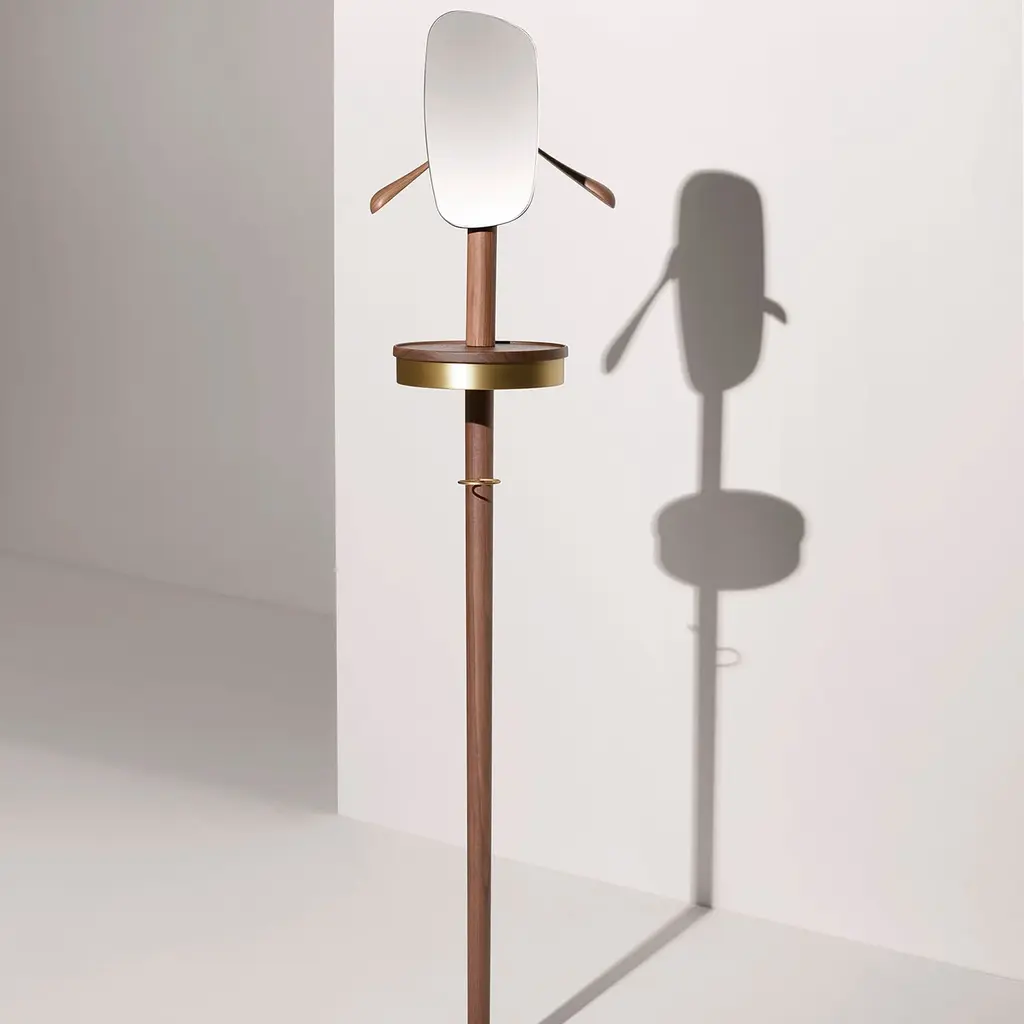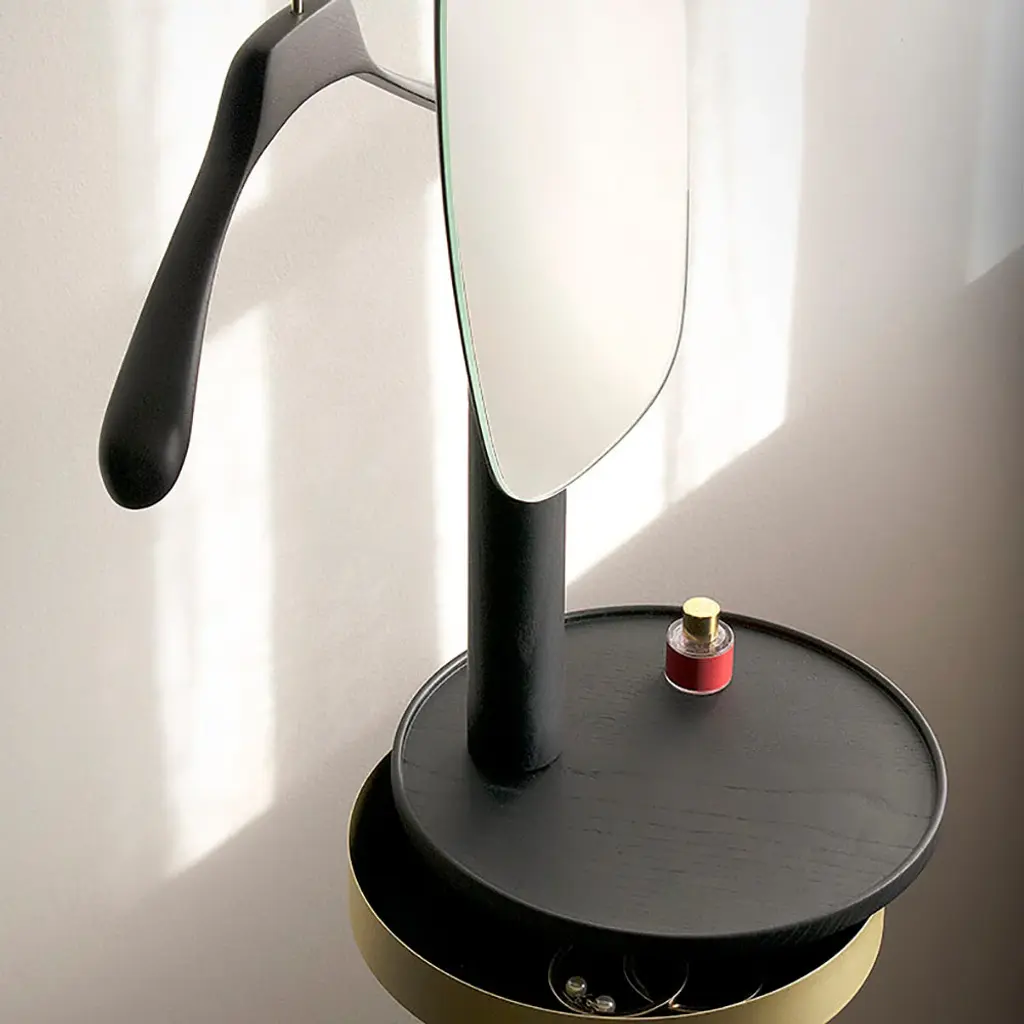 Though a valet stand has often been reserved for men, Nomon Home extends its luxurious slant on home accessories to the sumptuous Galán for women. Beautifully composed, it includes a mirrored stand and covered treasure box with a shelf-like cover in natural walnut. A matching contoured wood hanger extends from the rear and the unit is mounted on a gorgeous marble base in a choice of shades to complement the metal accents in either polished brass or graphite finish.