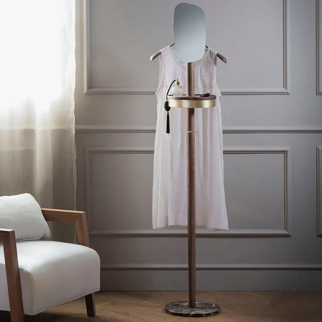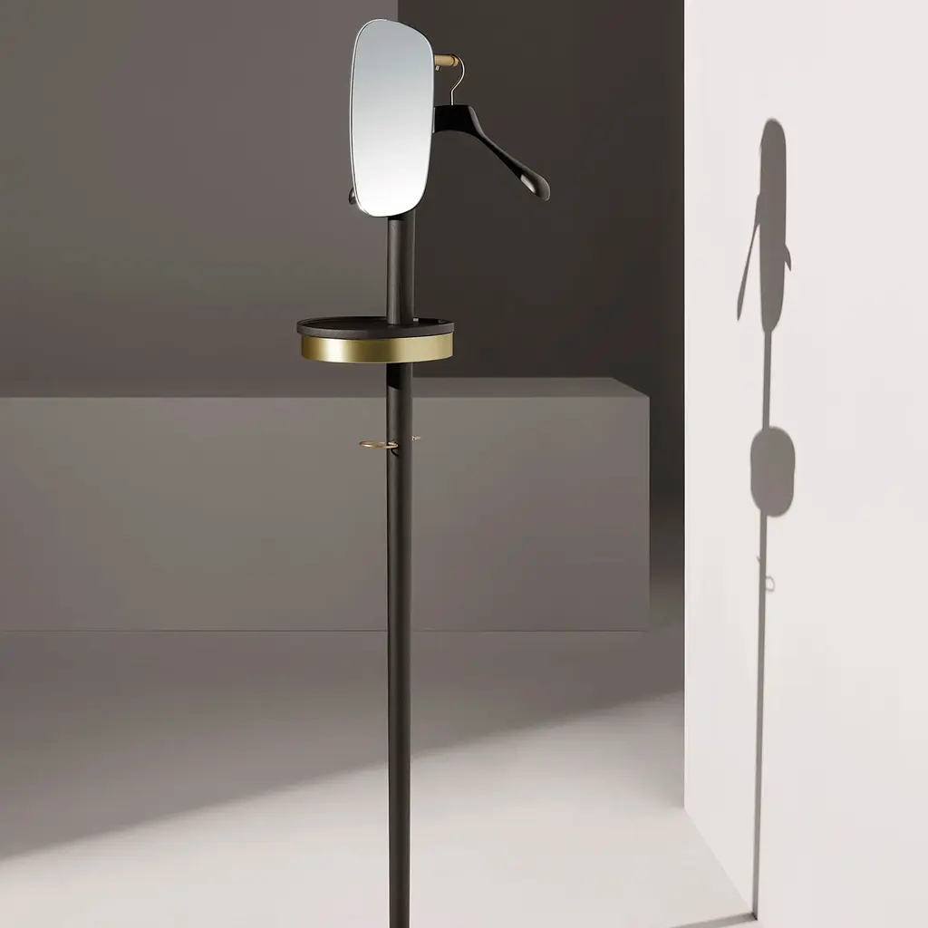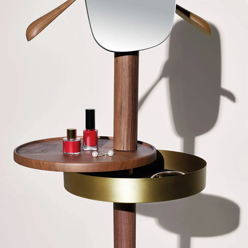 Though a valet stand has often been reserved for men, Nomon Home extends its luxurious slant on home accessories to the sumptuous Galán for women. Beautifully composed, it includes a mirrored stand and covered treasure box with a shelf-like cover in natural walnut. A matching contoured wood hanger extends from the rear and the unit is mounted on a gorgeous marble base in a choice of shades to complement the metal accents in either polished brass or graphite finish.