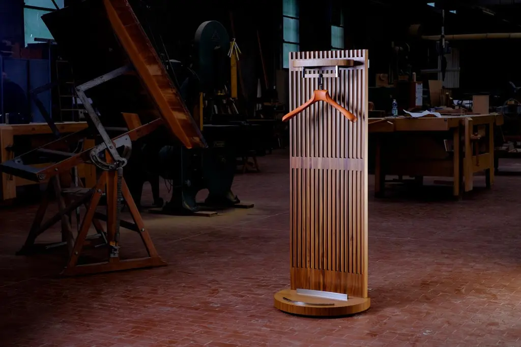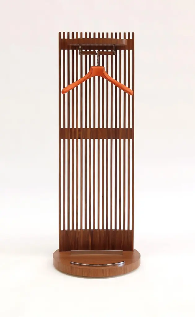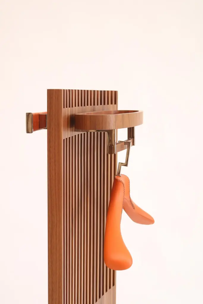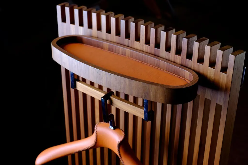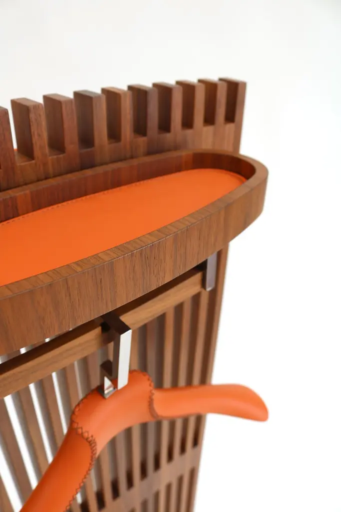 Gildo is a contemporary valet stand suitable for a bedroom or a wardrobe room, made of walnut with a swivel base. On top of the grid structure, there is a walnut tray with a leather base.. The tray is useful for holding the accessories you wear every day: watch, cufflinks, wallet and more. On one side of the grid structure there is a removable coat hanger in leather, while on the other side there is a trousers hanger in leather, with enough space to hang also the tie and the belt. . Everything you wear is stored neatly and within easy reach. Shoes also have a dedicated place on the steel bars attached to the base. All the metal details are in chrome steel.A bone label with Giordano Vigano's logo has been etched and characterizes every single piece of the collection.