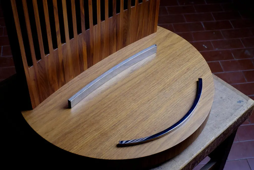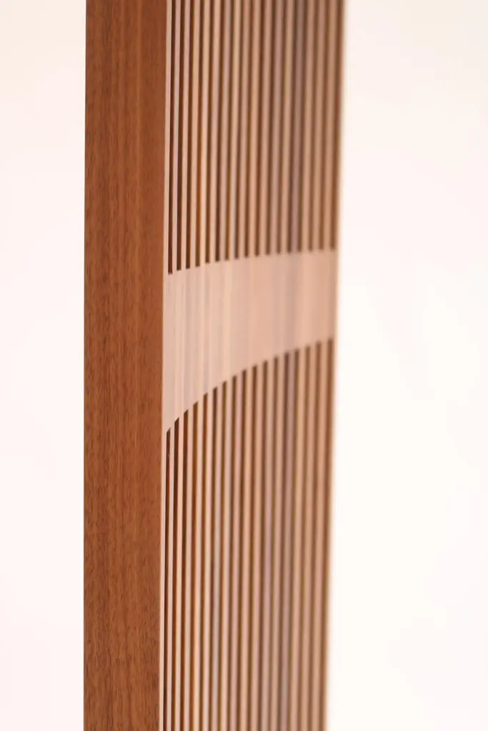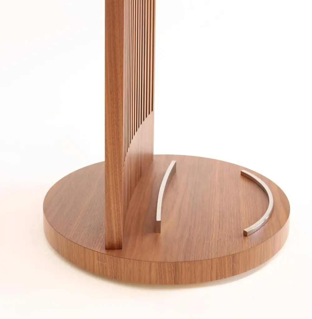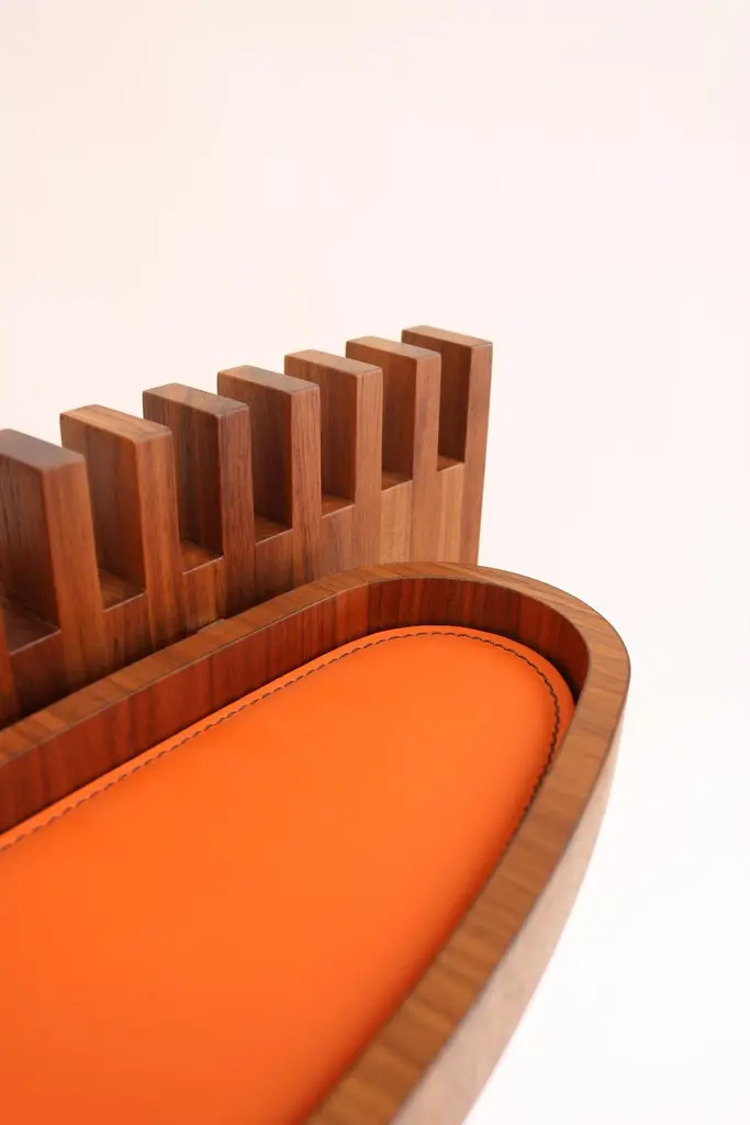 Gildo is a contemporary valet stand suitable for a bedroom or a wardrobe room, made of walnut with a swivel base. On top of the grid structure, there is a walnut tray with a leather base.. The tray is useful for holding the accessories you wear every day: watch, cufflinks, wallet and more. On one side of the grid structure there is a removable coat hanger in leather, while on the other side there is a trousers hanger in leather, with enough space to hang also the tie and the belt. . Everything you wear is stored neatly and within easy reach. Shoes also have a dedicated place on the steel bars attached to the base. All the metal details are in chrome steel.A bone label with Giordano Vigano's logo has been etched and characterizes every single piece of the collection.