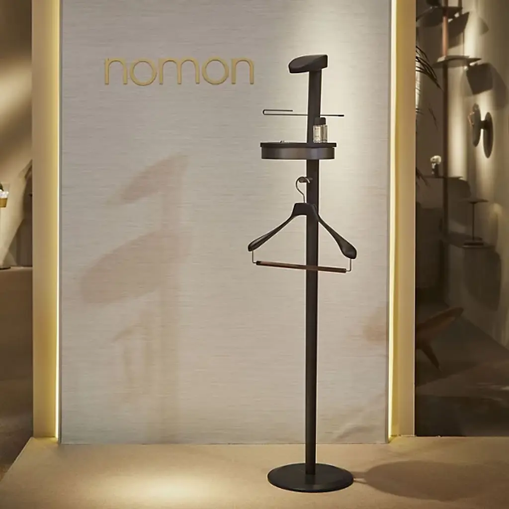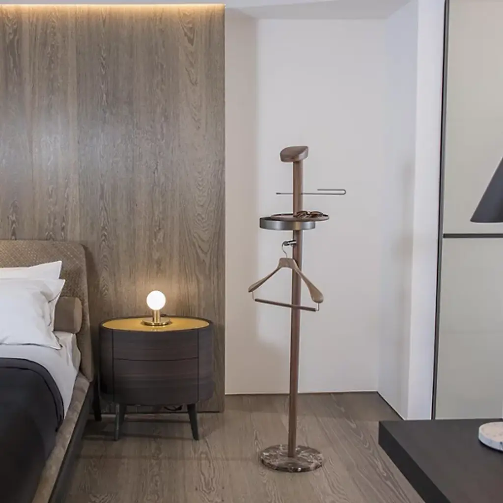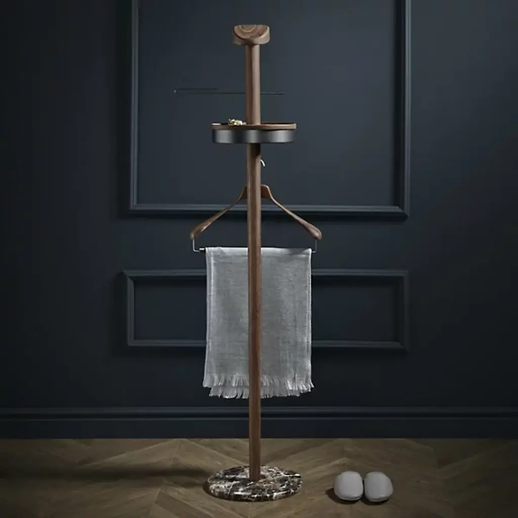 A sophisticated men’s accessory. Nomon’s Men’s Galan Valet Stand offers an elegant way to hang up jackets and accessories. Place in a bedroom for a functional and stylish enhancement. Features a round marble base attached by a long stem with added storage. Made from solid wood materials in a few sleek finishes.