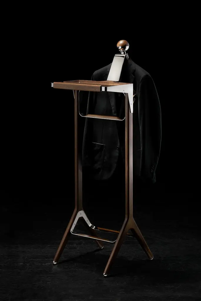 Through exclusive attention to detail, this stylish gentleman's valet stand is a manifestation of cohesion between British master craftsmanship and classical design to celebrate the passion we share with you for the highest quality sartorial garments, shoes and accessories. The valet hanger is sculpted from one piece of solid hardwood to provide the ultimate rest for and increase the longevity of your sharp tailored suit. A stainless steel plate personally engraved for you can not only honour your achievements but immortalize you and your lifestyle. All inserts and fittings are made from high quality steel and this valet stand is designed to be long lasting but with easily refinished or replaceable parts if ever necessary. The polished stainless steel will not tarnish and matches the American Black Walnut wood and embodies modern luxury. Signed by Maker,Labeled by Maker,Numbered,Signed by Maker,Labeled by Maker,Numbered
