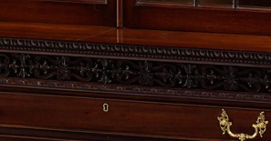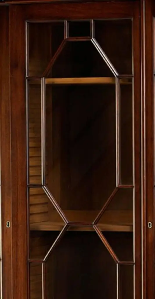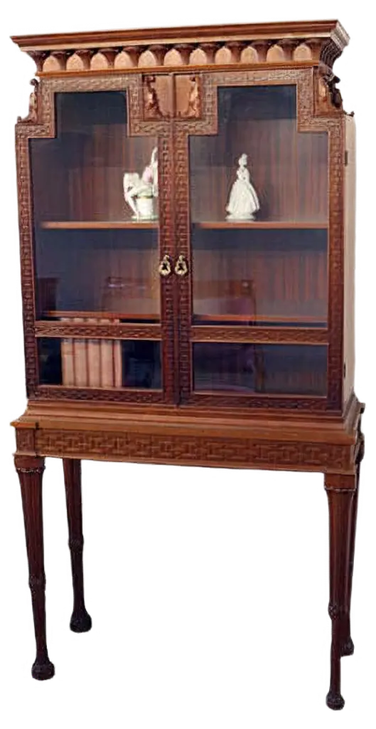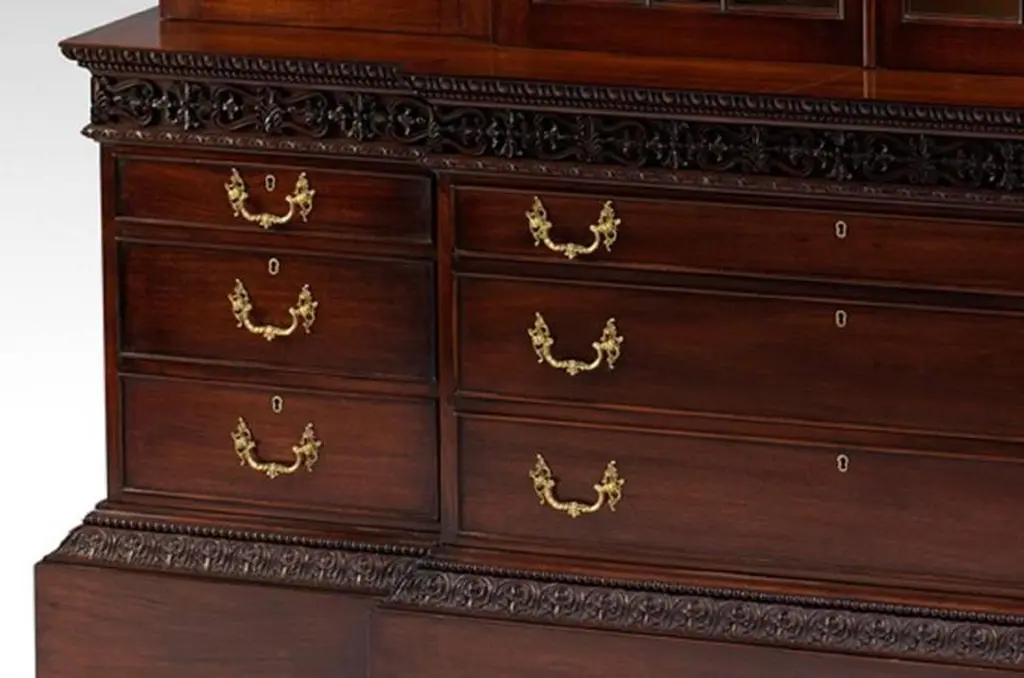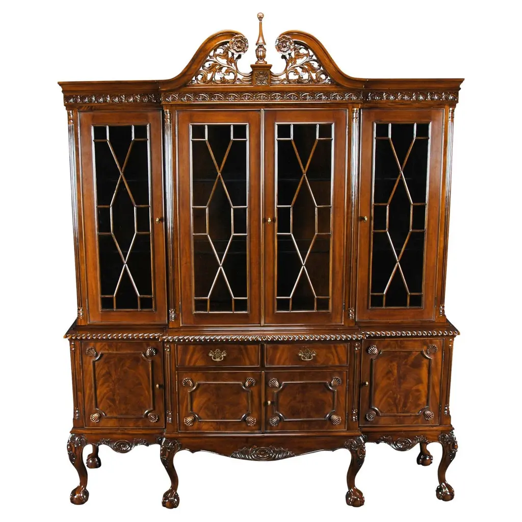 A bookcase or display cabinet originally designed by Robert Adam in 1761 and made by John Linnell, with scrolled pediment centred by acanthus spray, flanked with swagged urns. Gadrooned and acanthus carved cornice. The geometric designed glazed doors sit above a mahogany bed with egg and dart carved under-moulding, above a blind fret frieze. Three centre draws below are flanked by three smaller drawers to each side. The deep plinth is carved with acanthus leaf and beading.We are currently working to a 30-36 week lead time.