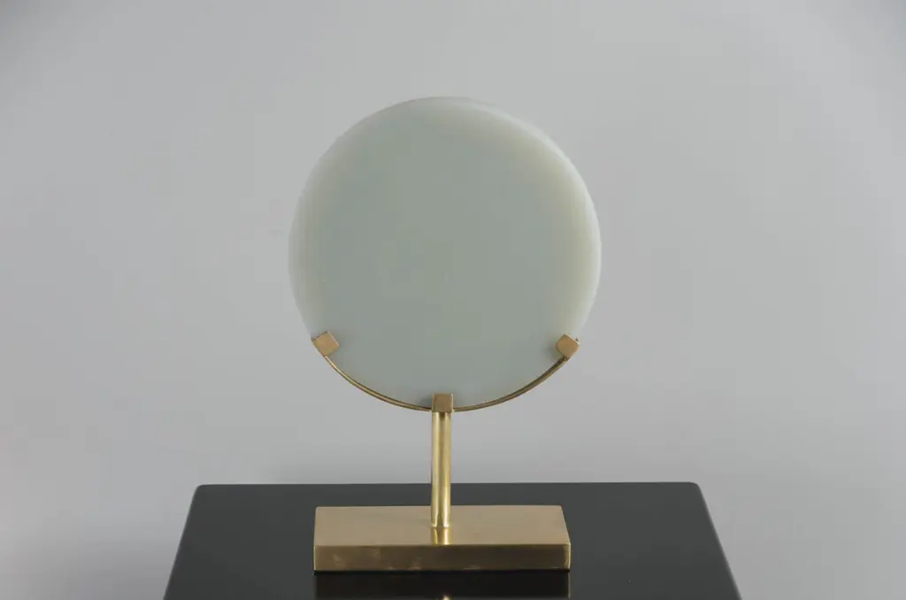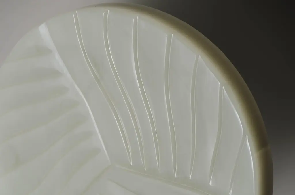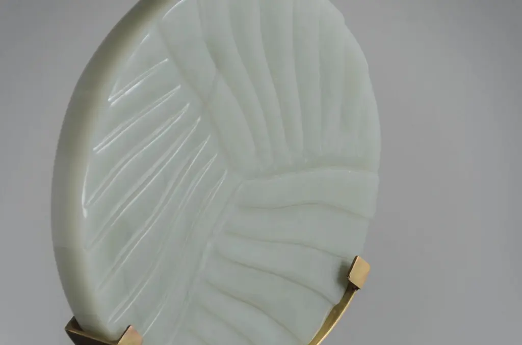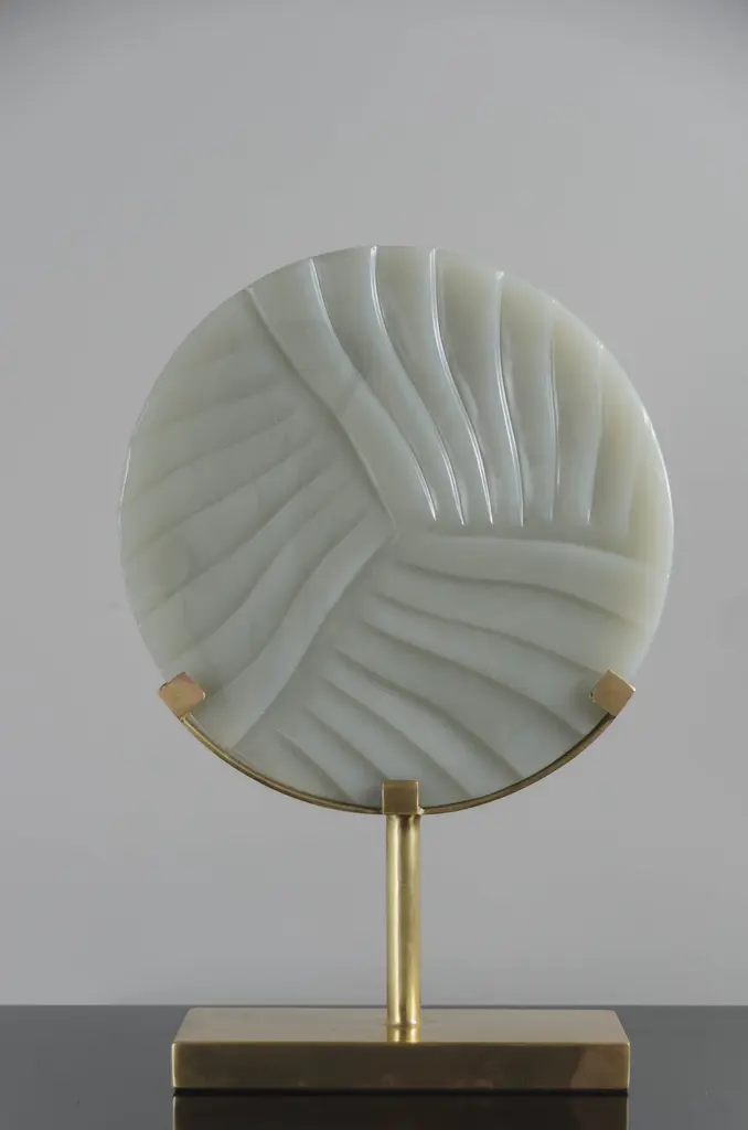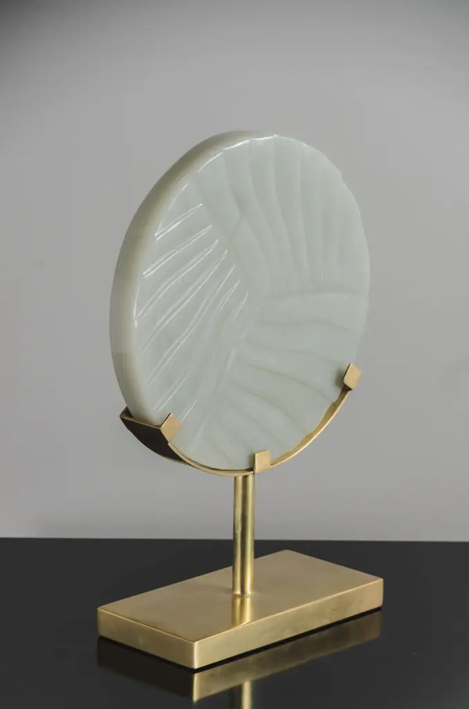 Carved Cascade design disc on stand.Grey Peking glasshand carvedbrass basehand madeLimited editionEach piece is individually crafted and is unique.Peking glass refers to the high-quality glass art produced by the imperial andcommercial workshops in Beijing during the Ching Dynasty, China 1644-1911. Since then, ‘Peking glass’ has become synonymous with the Chinese technique of glassmaking. Robert Kuo glass pieces are made from the traditional Peking glass technique of forming hollow glass, from layers upon layers of glass, by either free blowing or mold-blowing and then sending it to the jade carvers for shaping and polishing. Robert Kuo expands the tradition by designing pieces that compliment the classic shapes while presenting a clearly contemporary attitude. Each individual peking glass vases vary in shapes and color please inquire for more information.