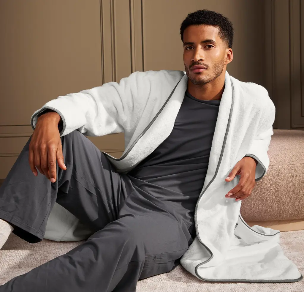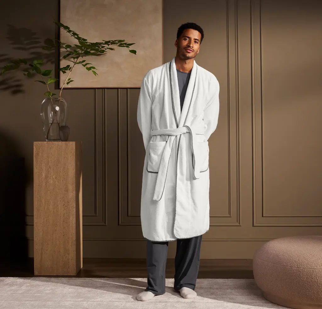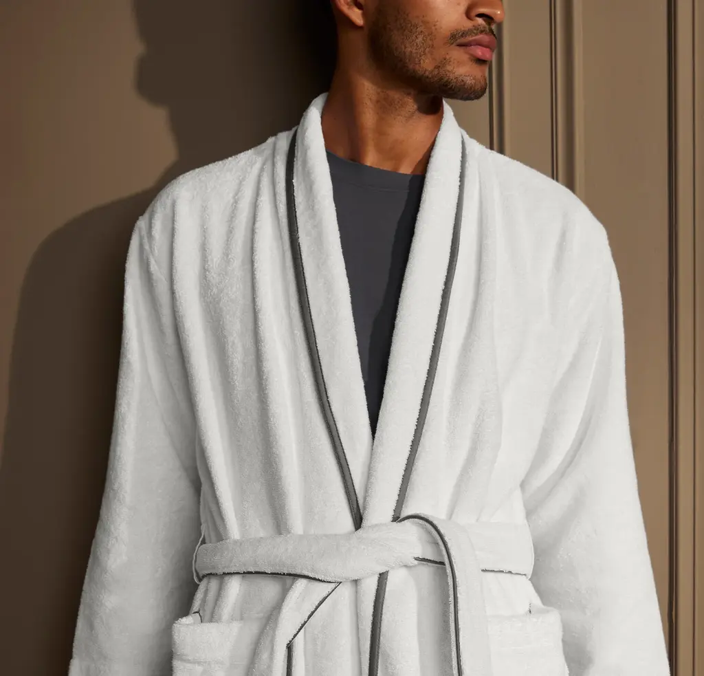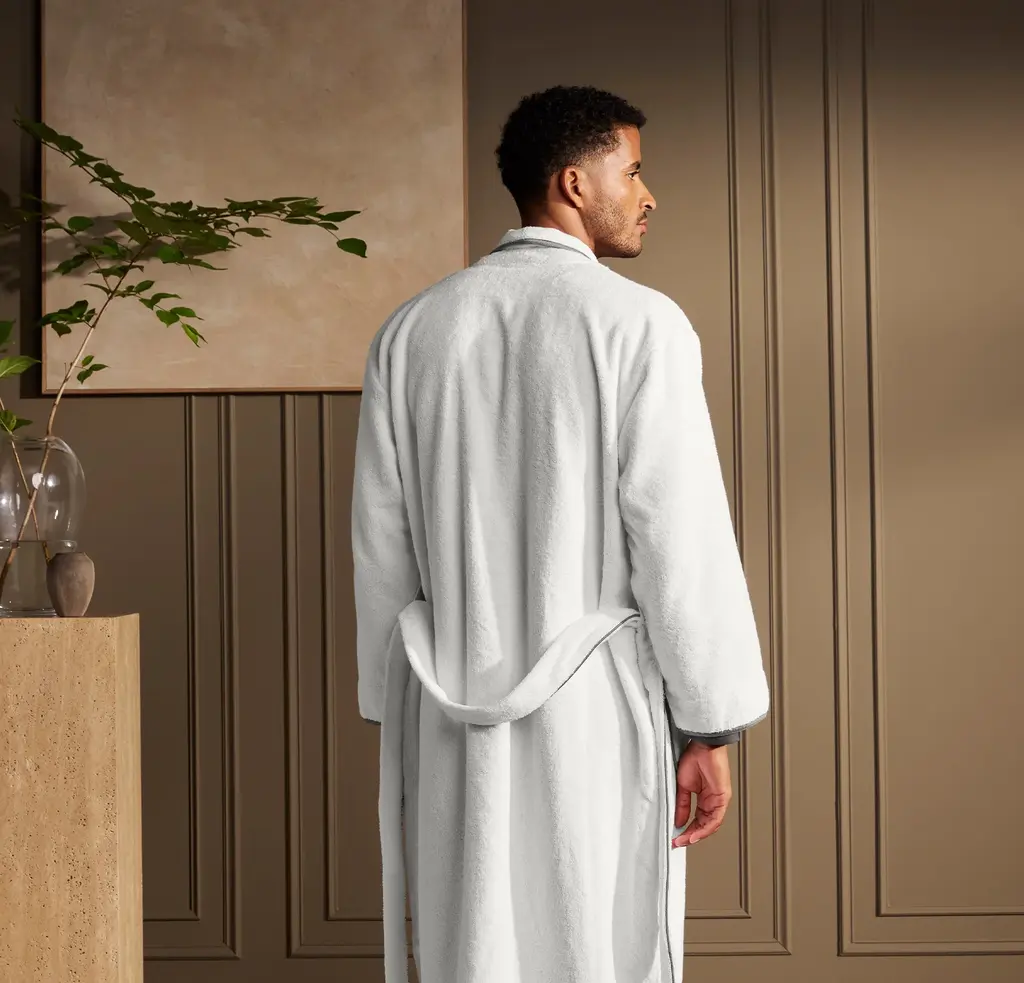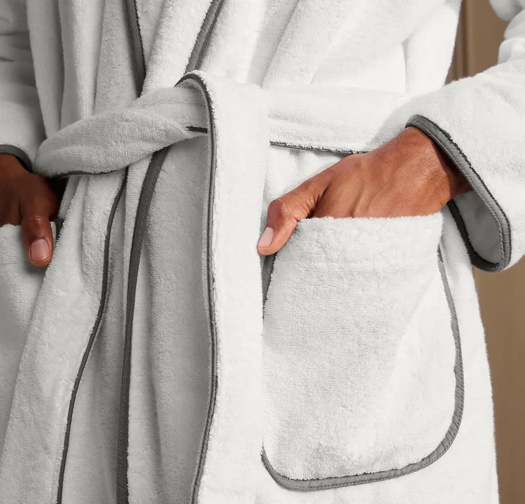Made with a velvety soft hand-feel and dense-yet-breathable weight, this Plush Robe is made with our most substantial bath fabrication. It starts with the highest quality yarns sourced from the finest 100% organic cotton on earth. Each thread is then luxuriously woven into terry loops to ensure the perfect blend of sumptuous and absorbent. The Feel Velvety soft with a dense, substantial weight The Look Relaxed yet refined with tailored contrast piping Classic styling with fluffy terry loops