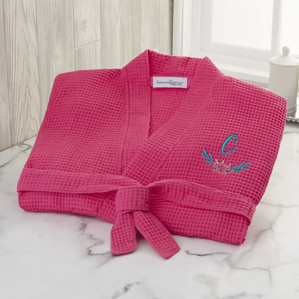 Find luxury in this Floral Embroidered Waffle Weave Robe. This knee length robe makes for a perfect gift for anyone who loves a personalized touch in their self care routine. The lightweight fabric makes this the perfect dressing gown, or robe for the warmer months. Make your home feel like a spa with this pink robe, featuring your first or last initial embroidered with a floral accent.