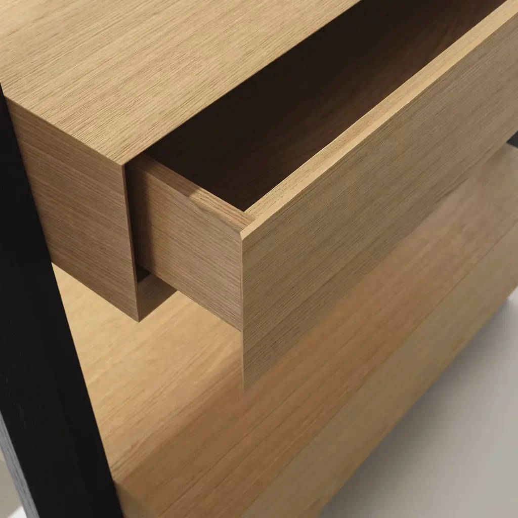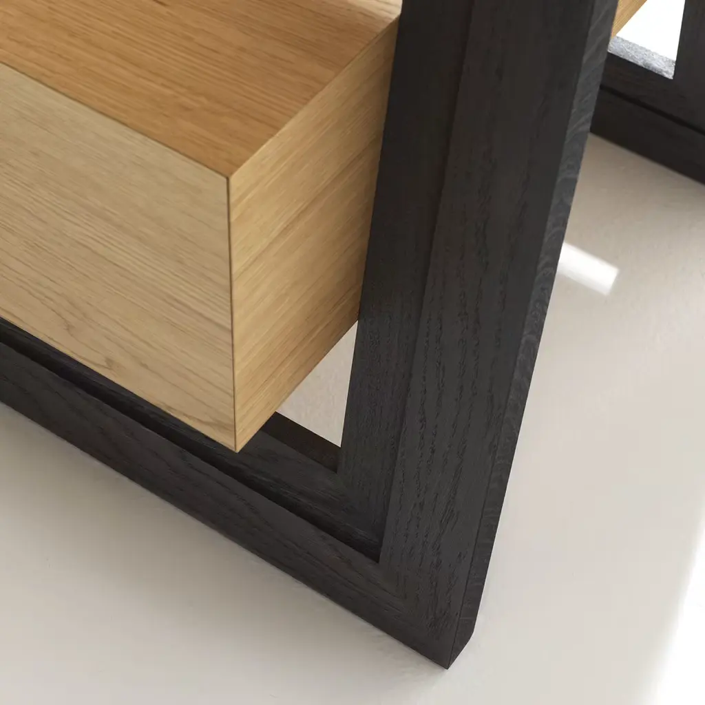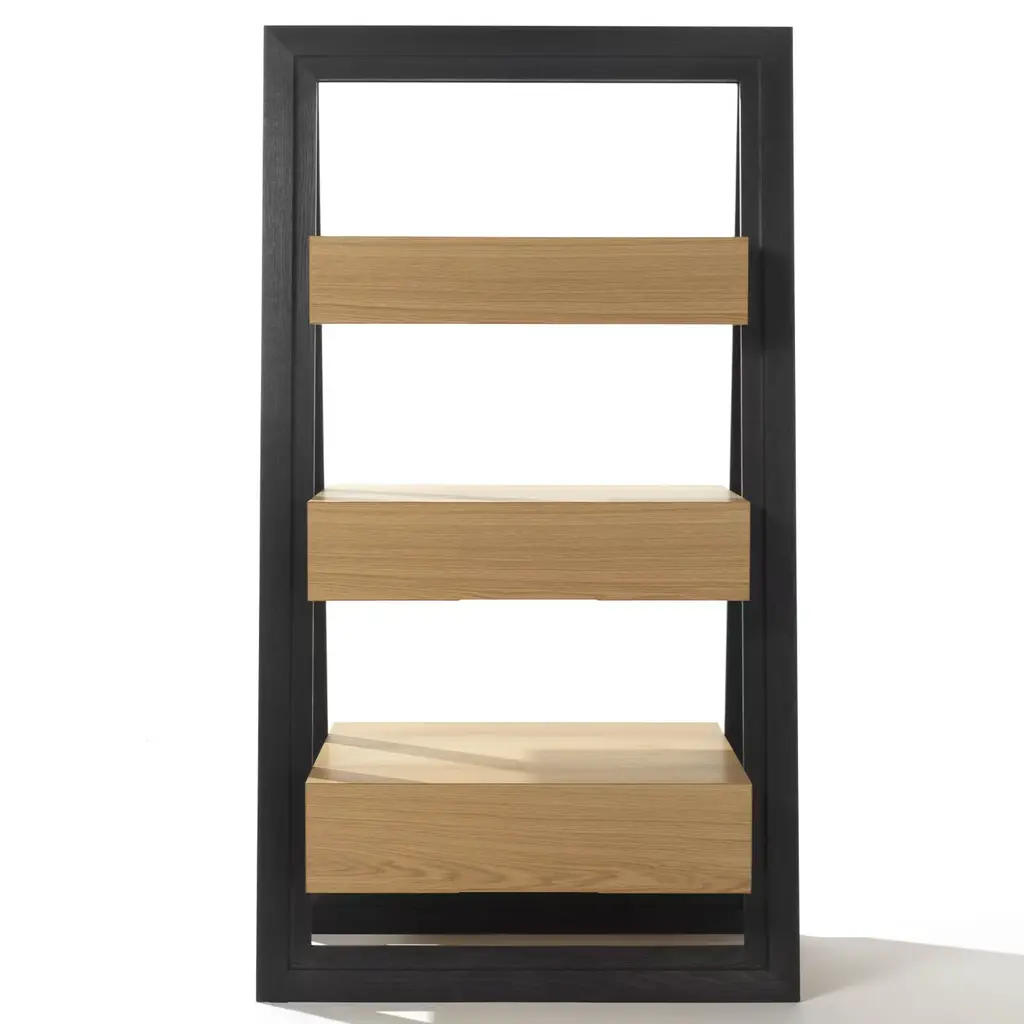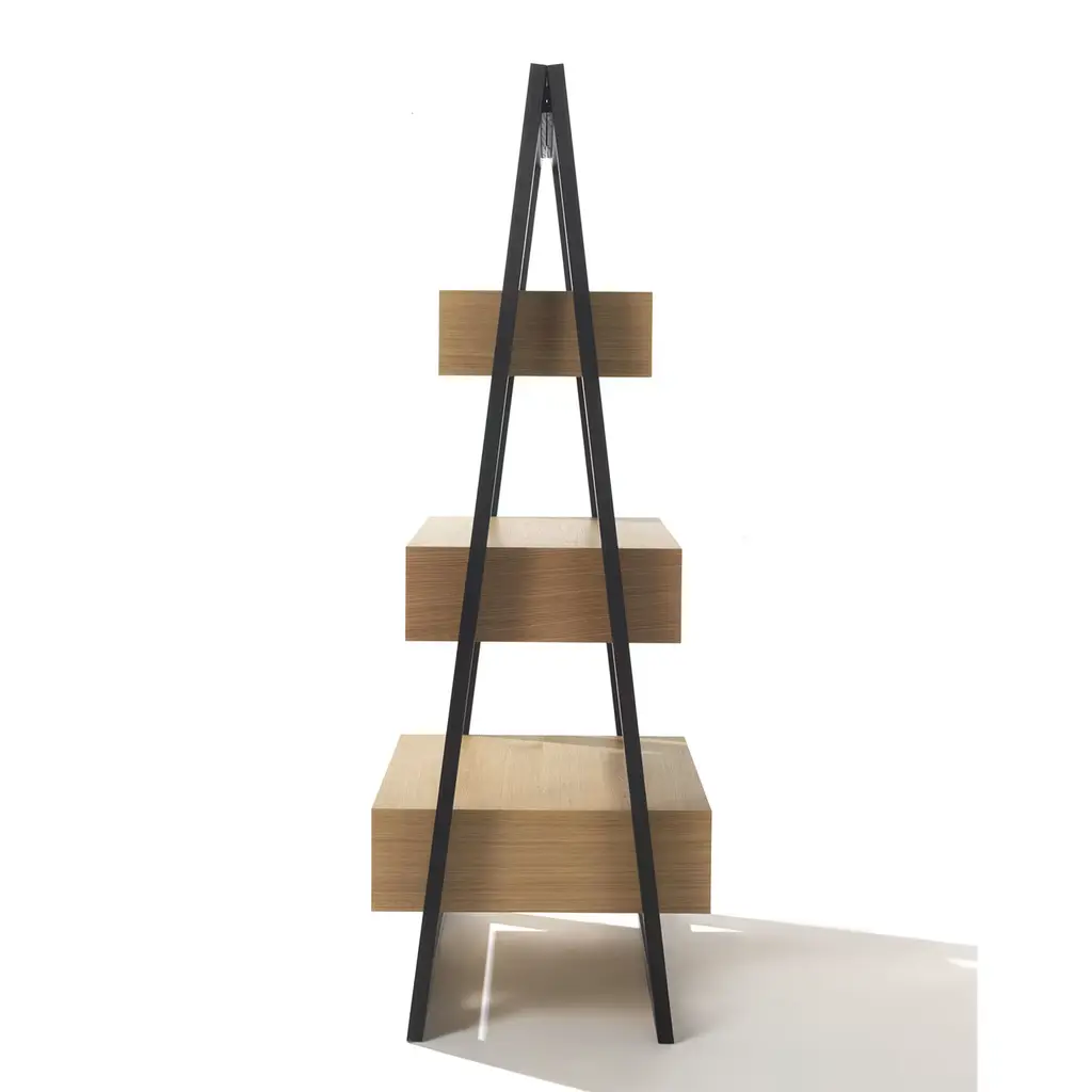 The Ptre bookshelf, designed by Roberto Bianchi, stands as a hallmark of modern minimalism. Unveiled at the prestigious Salone del Mobile di Milano in 2016, this striking bookshelf features a distinctive A-frame structure crafted from stained solid oak, complemented by three gracefully suspended natural oak drawers. The design not only enhances the bookshelf's visual lightness but also promotes functionality, offering ample open storage alongside closed drawer spaces. Its symmetrical form allows for versatile use, making it an ideal partitioning element within any space. Perfect for both organizing books and showcasing decor, this bookshelf is a sophisticated addition to any contemporary interior.