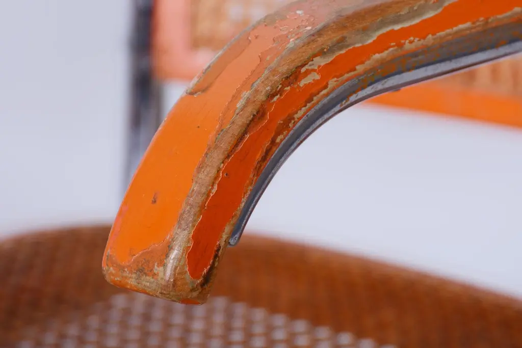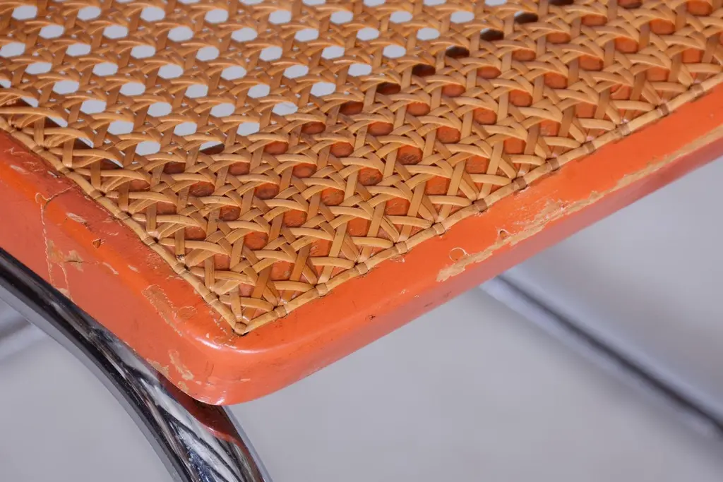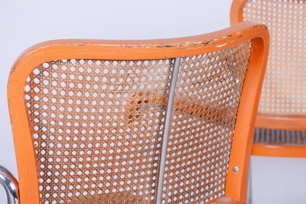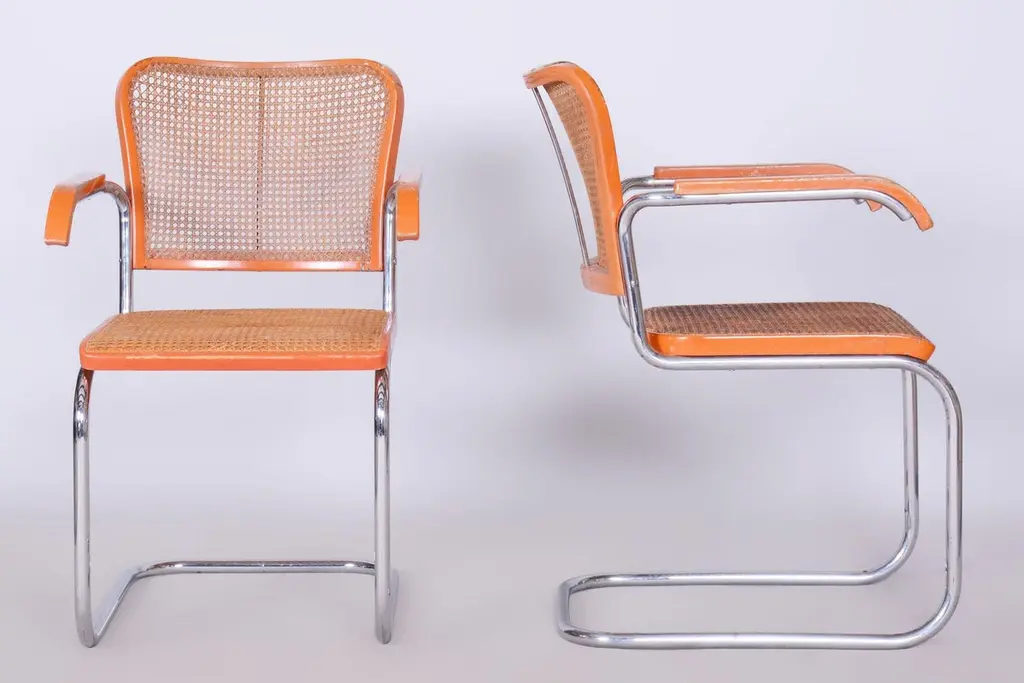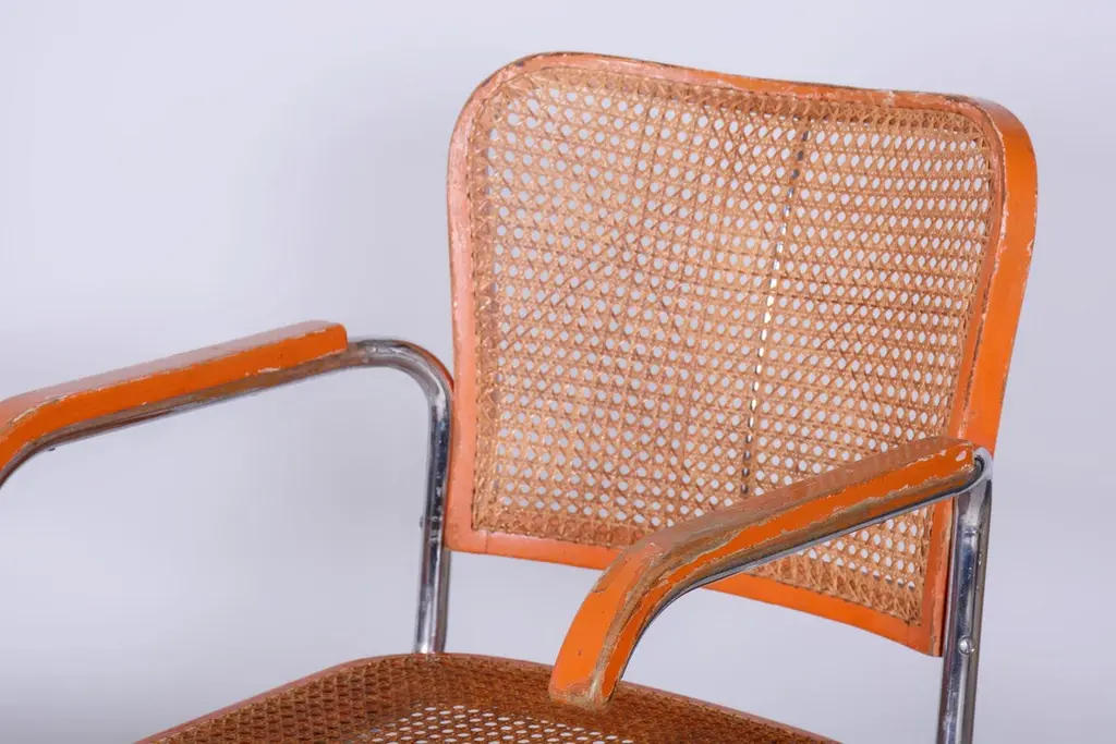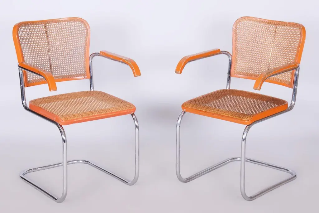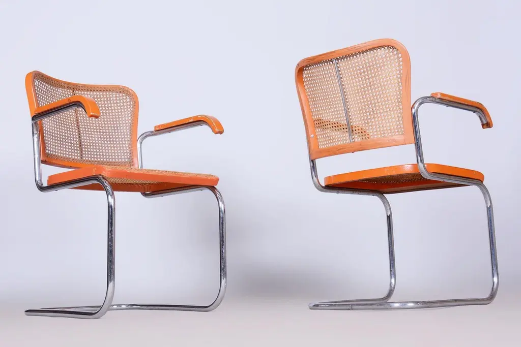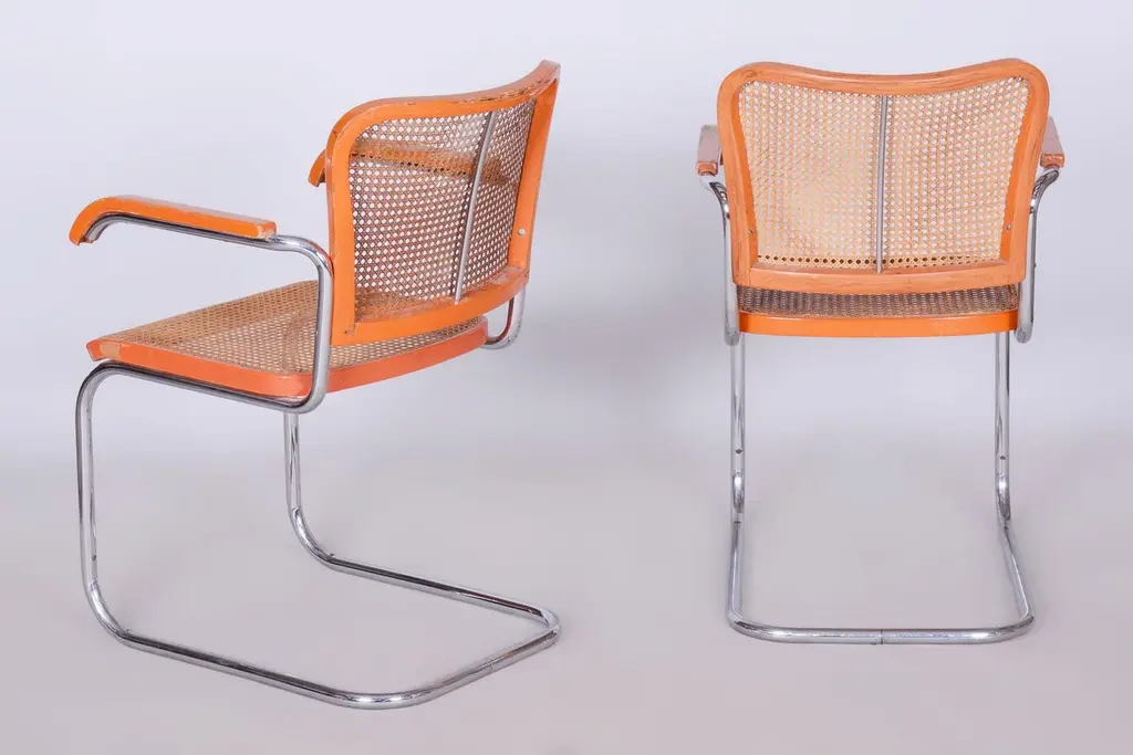Set of two restored beech Bauhaus Armchairs.Style: BauhausMaker: Robert SlezakPeriod: 1930-1939Source: CzechiaMaterial: Beech, Chrome-plated Steel, Rattan.In pristine original condition, the item has been professionally cleaned, and its polish has been revived by our refurbishing team in Czechia. Professionally cleaned chrome. Made by renowned Czech designer Robert Slezak. This item features Classic Bauhaus design elements. Elements of this style are neutral colours, and occasional bright primary colours. Bauhaus designers avoided the fussy and pretentious, looking for clean, modern lines instead. Perfect for a timeless, yet modern look.