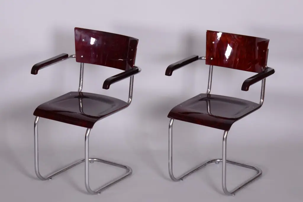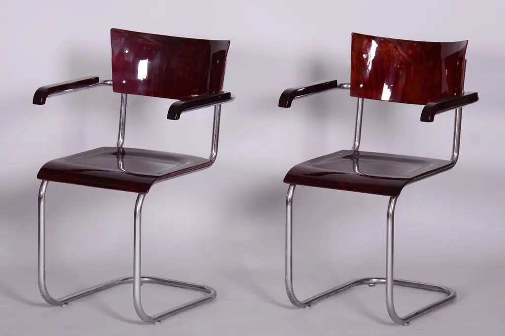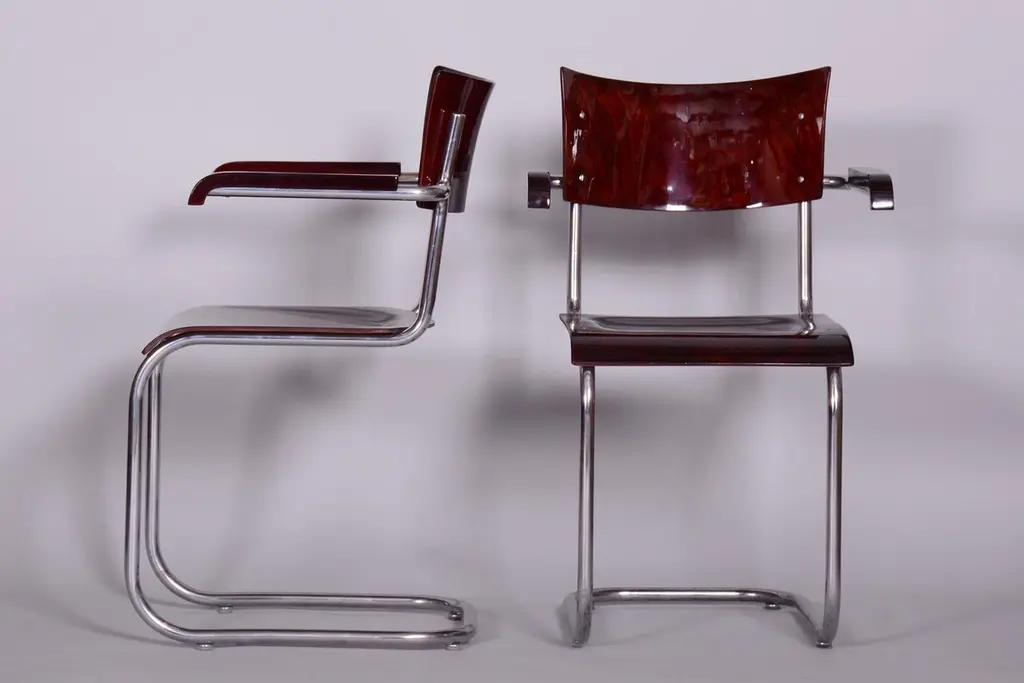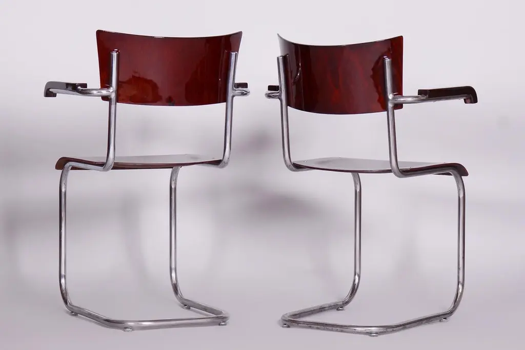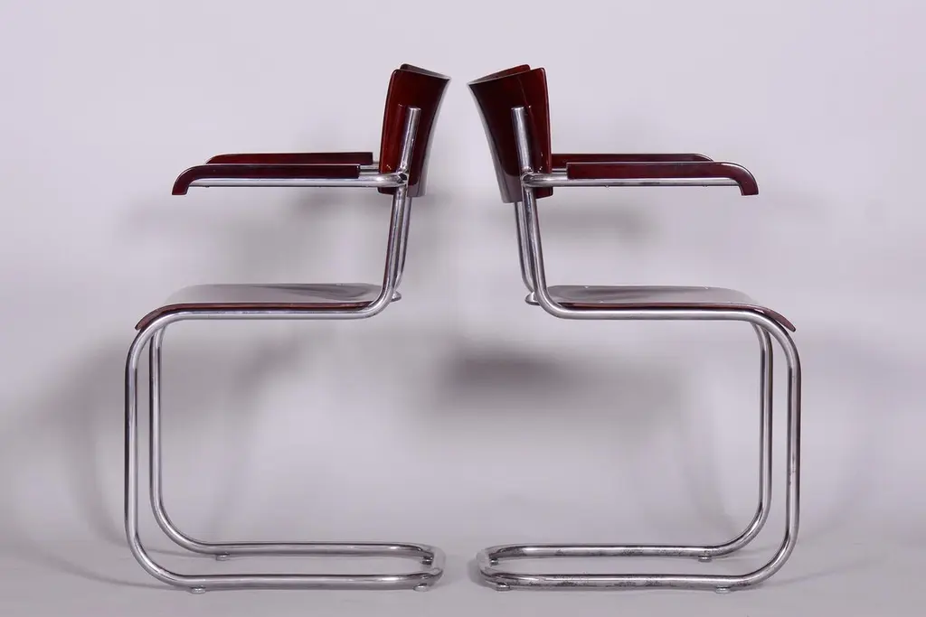 Set of two restored beech Bauhaus Armchairs designed by Mart Stam.Style: BauhausDesigner: Mart StamMaker: Robert SlezakPeriod: 1930-1939Source: CzechiaMaterial: Beech, Chrome-plated Steel.Professionally cleaned chrome. New polish.Designed by Mart Stam, a renowned Dutch designer and architecht pivotal to midcentury design. Stam was a Dutch architect, urban planner, and furniture designer. Stam was extraordinarily well-connected, and his career intersects with important moments in the history of 20th century European architecture, including the invention of the cantilever tubular chair, teaching at the Bauhaus, contributions to the Weissenhof Estate, the Van Nelle Factory, (an important modernist landmark in Rotterdam), buildings.His design philosophy was inspired by both Functionalism and Scientific Communism, and his style of design is in line with the New Objectivity, an art movement formed during the depression in 1920s Germany, as a counter-movement and an out growth of Expressionism.Made by renowned Czech designer Robert Slezak. This item features Classic Bauhaus design elements. Elements of this style are neutral colours, and occasional bright primary colours. Bauhaus designers avoided the fussy and pretentious, looking for clean, modern lines instead. Perfect for a timeless, yet modern look.