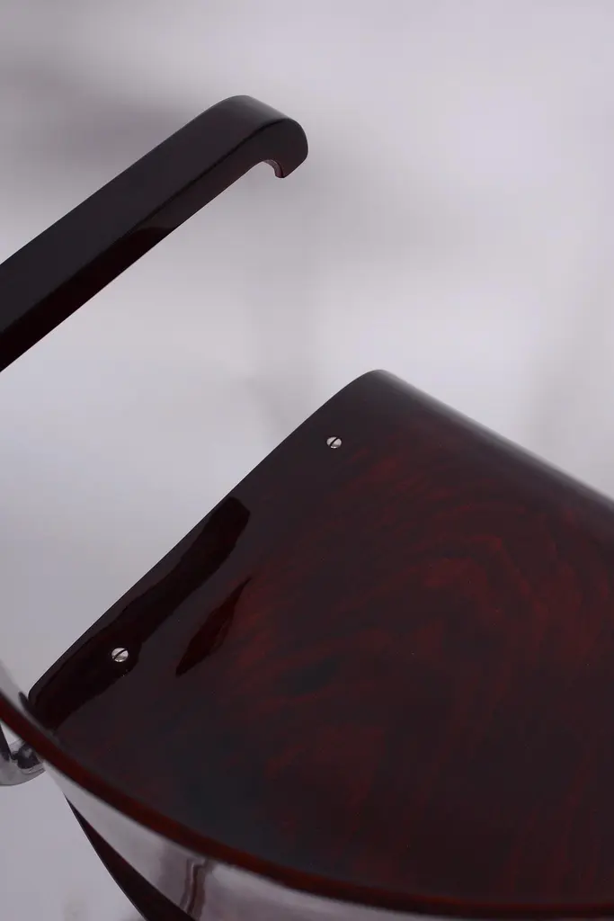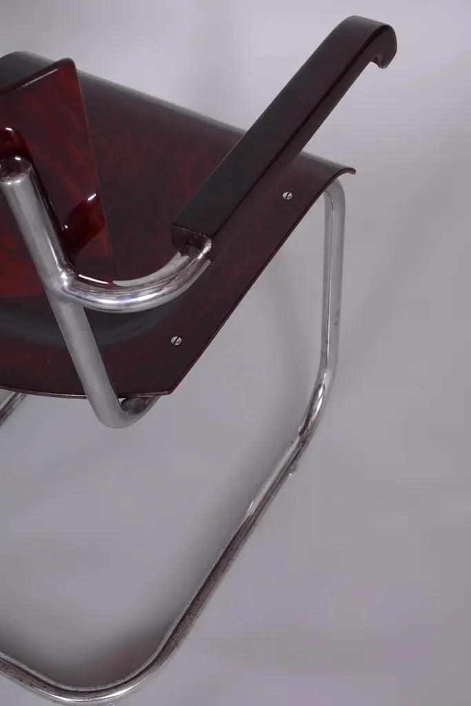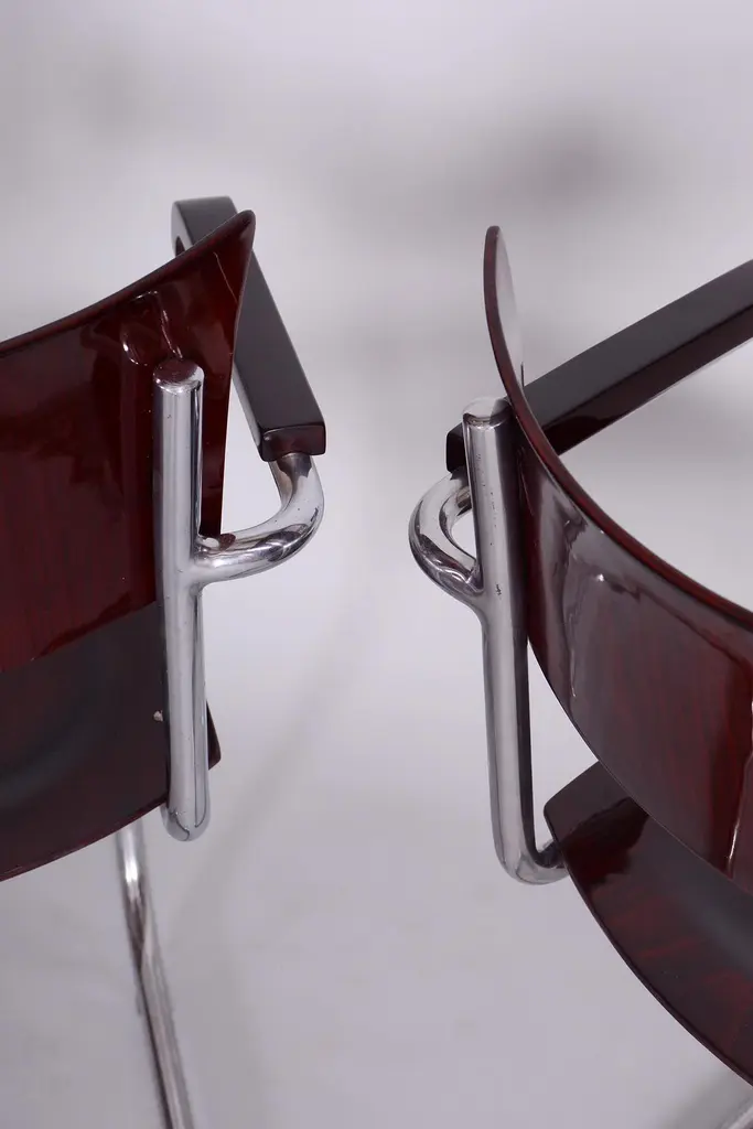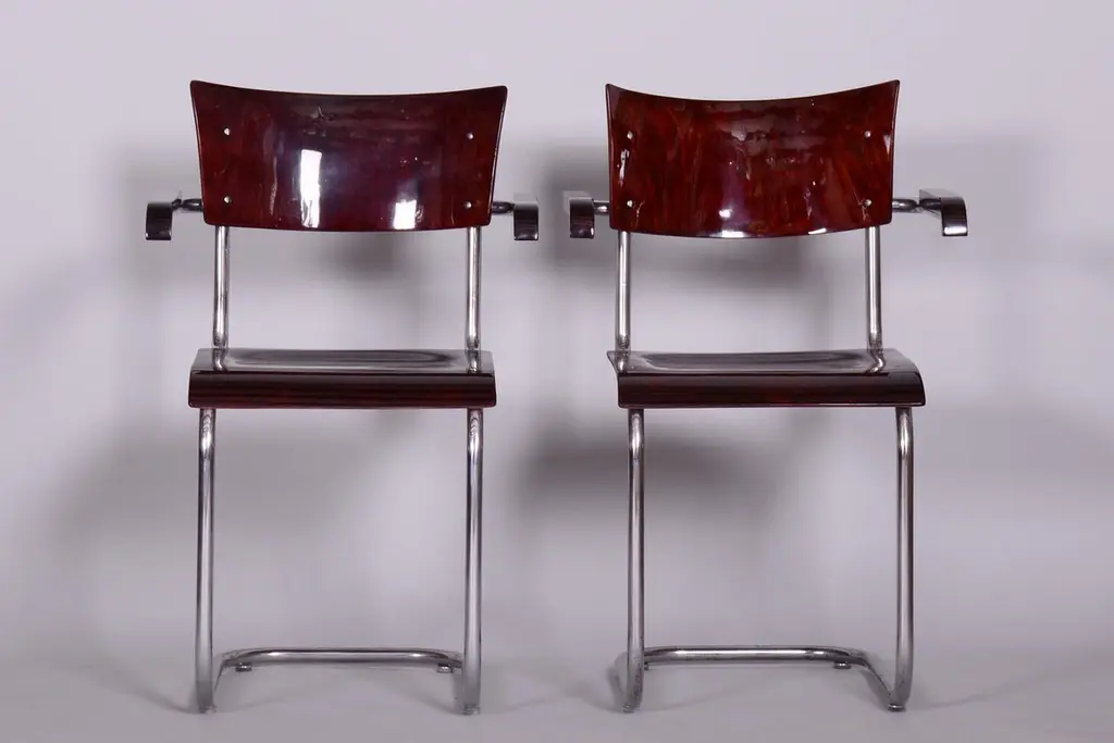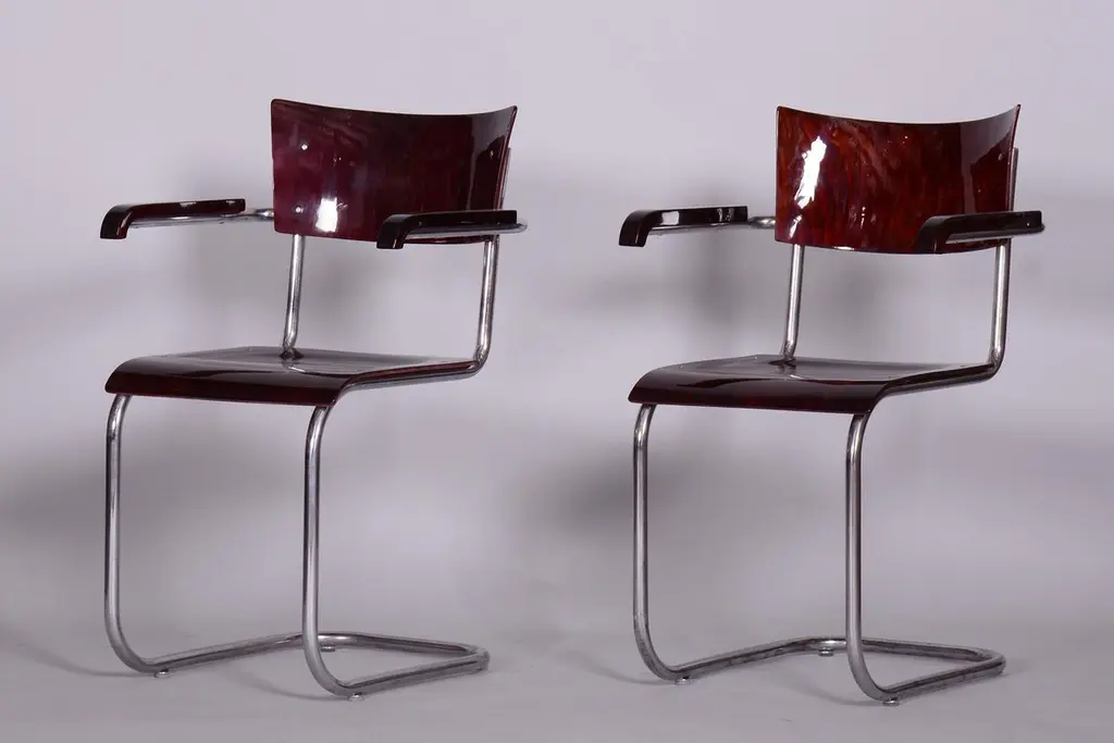 Set of two restored beech Bauhaus Armchairs designed by Mart Stam.Style: BauhausDesigner: Mart StamMaker: Robert SlezakPeriod: 1930-1939Source: CzechiaMaterial: Beech, Chrome-plated Steel.Professionally cleaned chrome. New polish.Designed by Mart Stam, a renowned Dutch designer and architecht pivotal to midcentury design. Stam was a Dutch architect, urban planner, and furniture designer. Stam was extraordinarily well-connected, and his career intersects with important moments in the history of 20th century European architecture, including the invention of the cantilever tubular chair, teaching at the Bauhaus, contributions to the Weissenhof Estate, the Van Nelle Factory, (an important modernist landmark in Rotterdam), buildings.His design philosophy was inspired by both Functionalism and Scientific Communism, and his style of design is in line with the New Objectivity, an art movement formed during the depression in 1920s Germany, as a counter-movement and an out growth of Expressionism.Made by renowned Czech designer Robert Slezak. This item features Classic Bauhaus design elements. Elements of this style are neutral colours, and occasional bright primary colours. Bauhaus designers avoided the fussy and pretentious, looking for clean, modern lines instead. Perfect for a timeless, yet modern look.