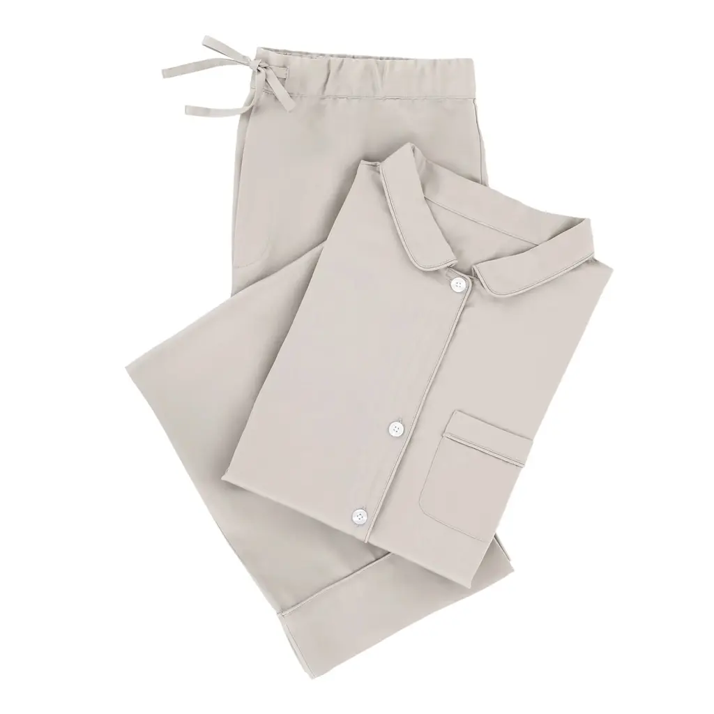 Our deliciously dense and drapey sateen weave Silken Solid pajamas are softer than silk, cooler than linen and more absorbent than cotton. Woven from Tencel, a new age fiber made in harmony with nature, whose unique structure creates an optimal skin climate for the soundest of sleep. Cut for comfort in our boyfriend pj shape: The top is detailed with sophisticated self piped accents on the rounded Peter Pan collar, patch pockets and cuff hems. The squared off, boxy silhouette extends to the high hip, and pull-on pants have an elastic waist with a self tie.