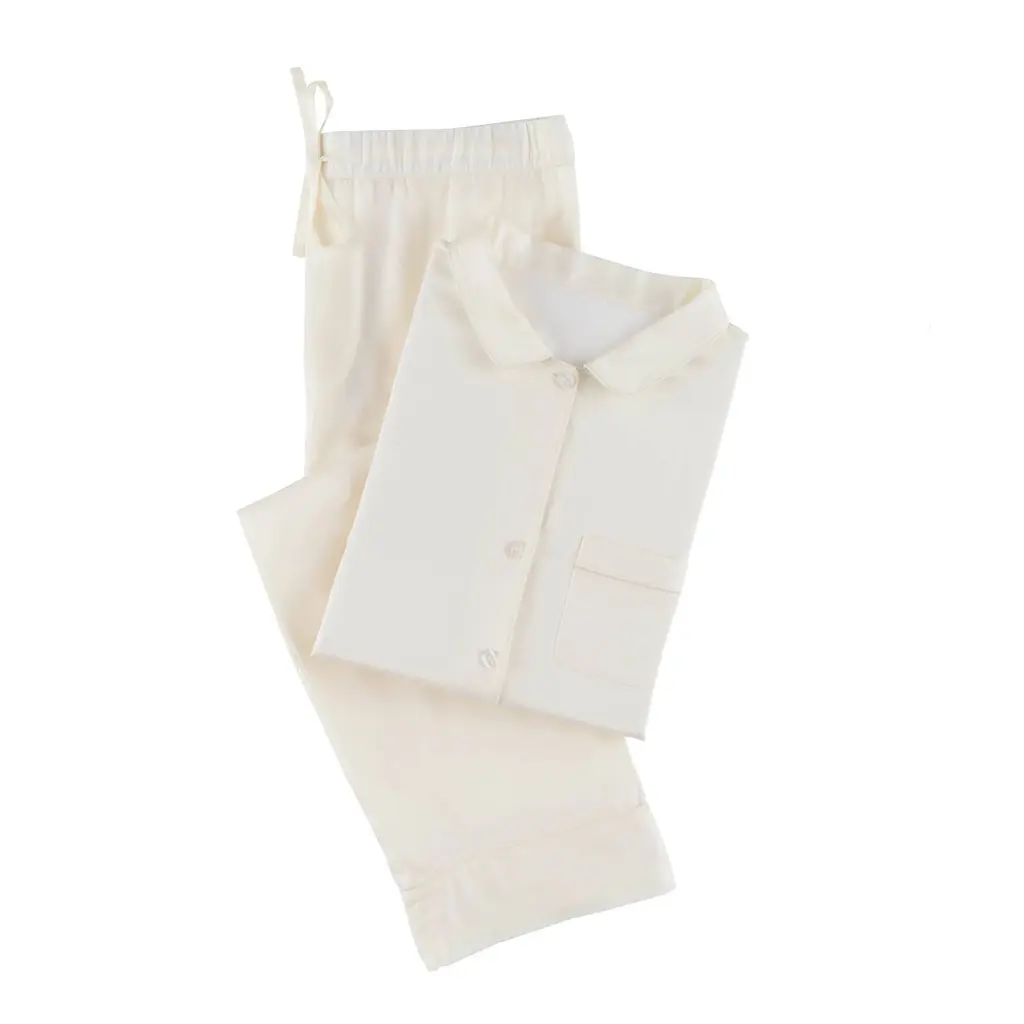 Our deliciously dense and drapey sateen weave Silken Solid pajamas are softer than silk, cooler than linen and more absorbent than cotton. Woven from Tencel, a new age fiber made in harmony with nature, whose unique structure creates an optimal skin climate for the soundest of sleep. Cut for comfort in our boyfriend pj shape: The top is detailed with sophisticated self piped accents on the rounded Peter Pan collar, patch pockets and cuff hems. The squared off, boxy silhouette extends to the high hip, and pull-on pants have an elastic waist with a self tie.