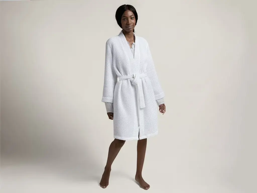 Relax in this lightweight, softly textured bathrobe inspired by the world's finest spas. Features two hip pockets, a folded collar and secure waisttie.